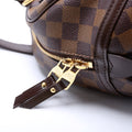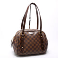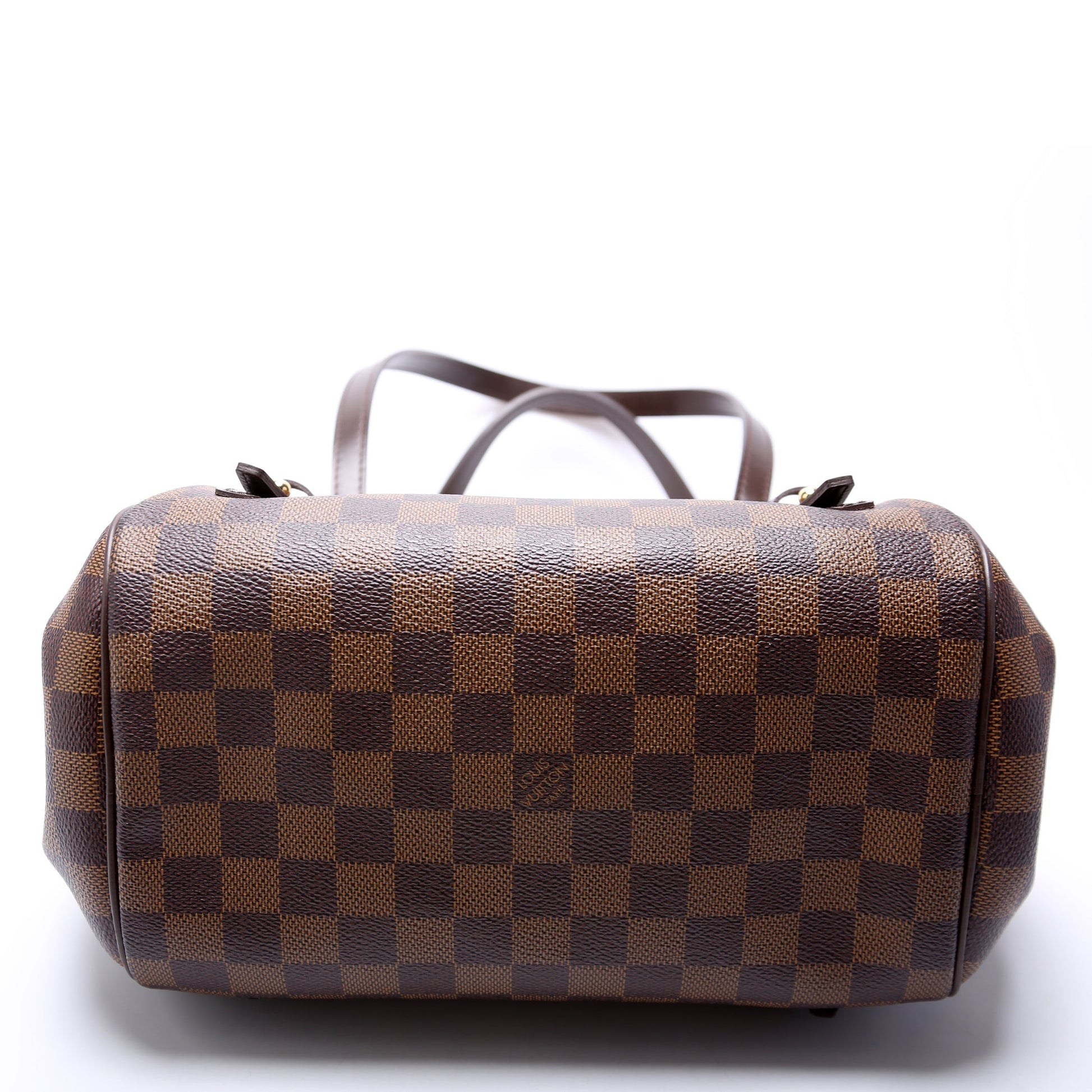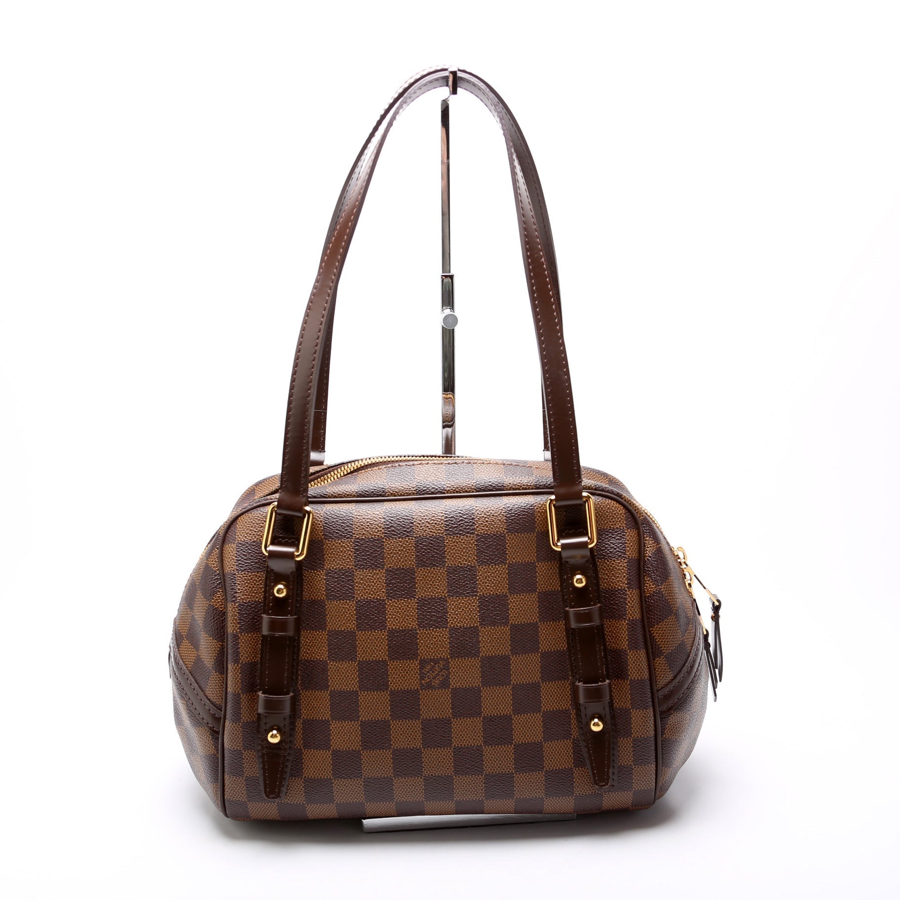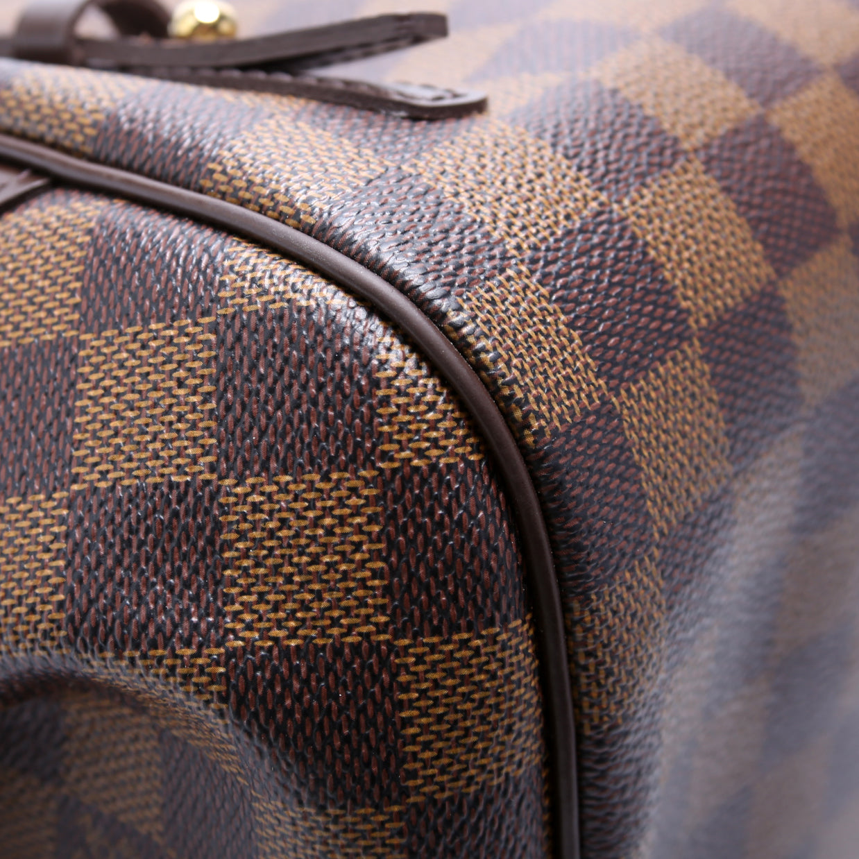 This Louis Vuitton Rivington PMis eye catching bag. The exterior is in the classic Louis Vuitton Damier Ebene coated canvas.