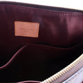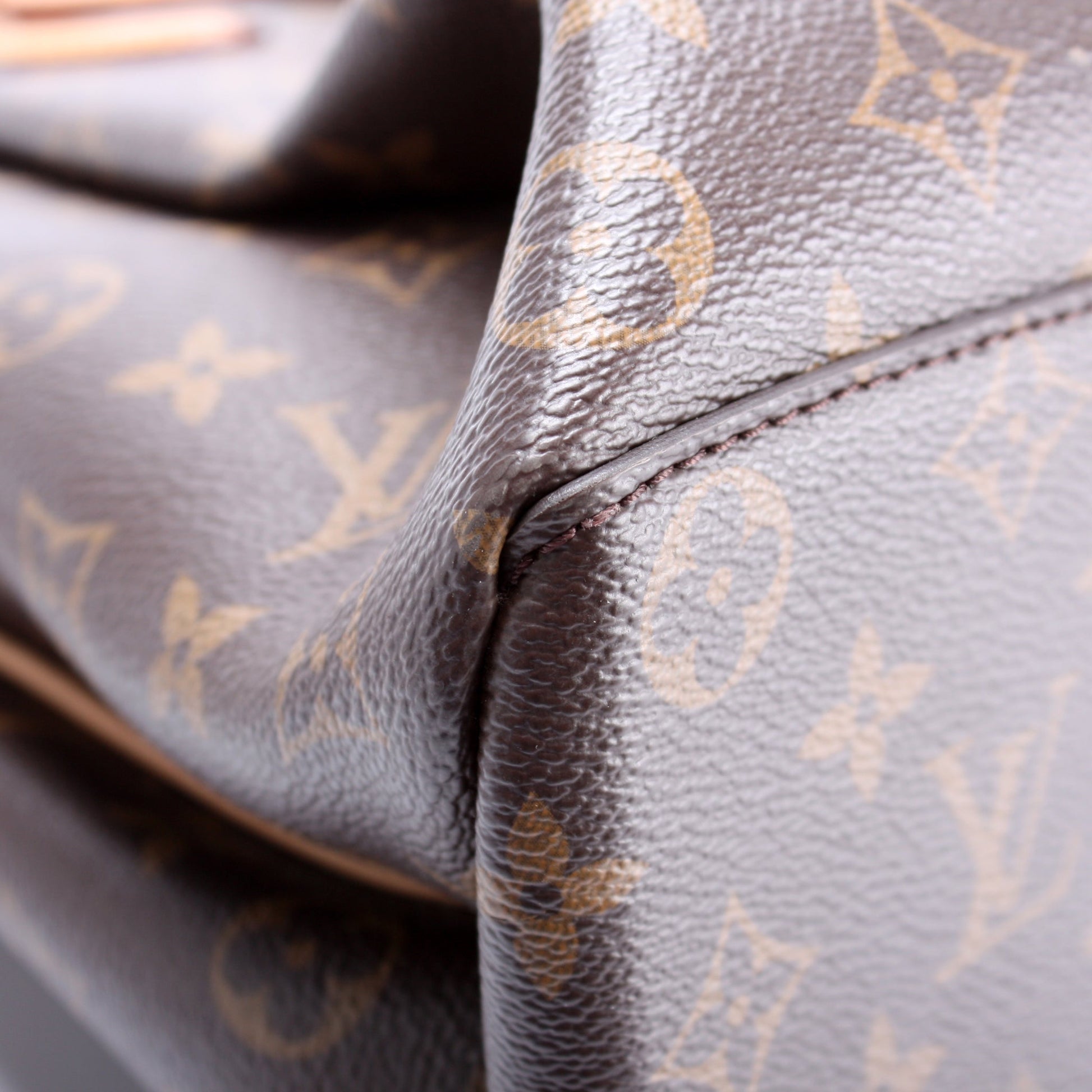 Exterior: The exterior coated canvas is free of any rips or cracks. The leather detail has discoloration throughout.