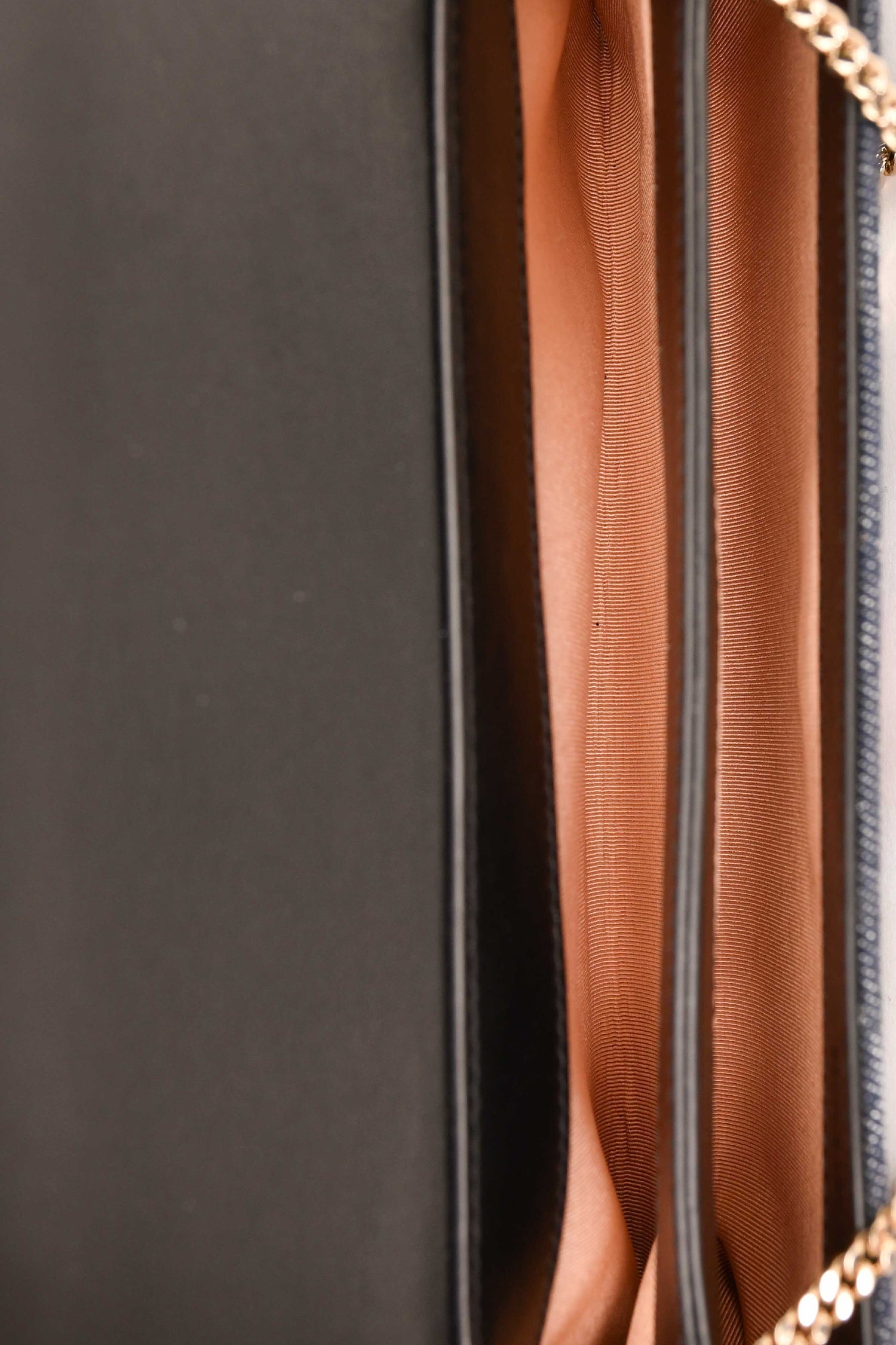 Roger Vivier Denim 'Viv' Envelope Crossbody. Front fold-over flap with magnetic button closure. 2 interior slip compartments. Single interior slip pocket. Pink textile interior lining. Gold-toned hardware. Tonal stitching.