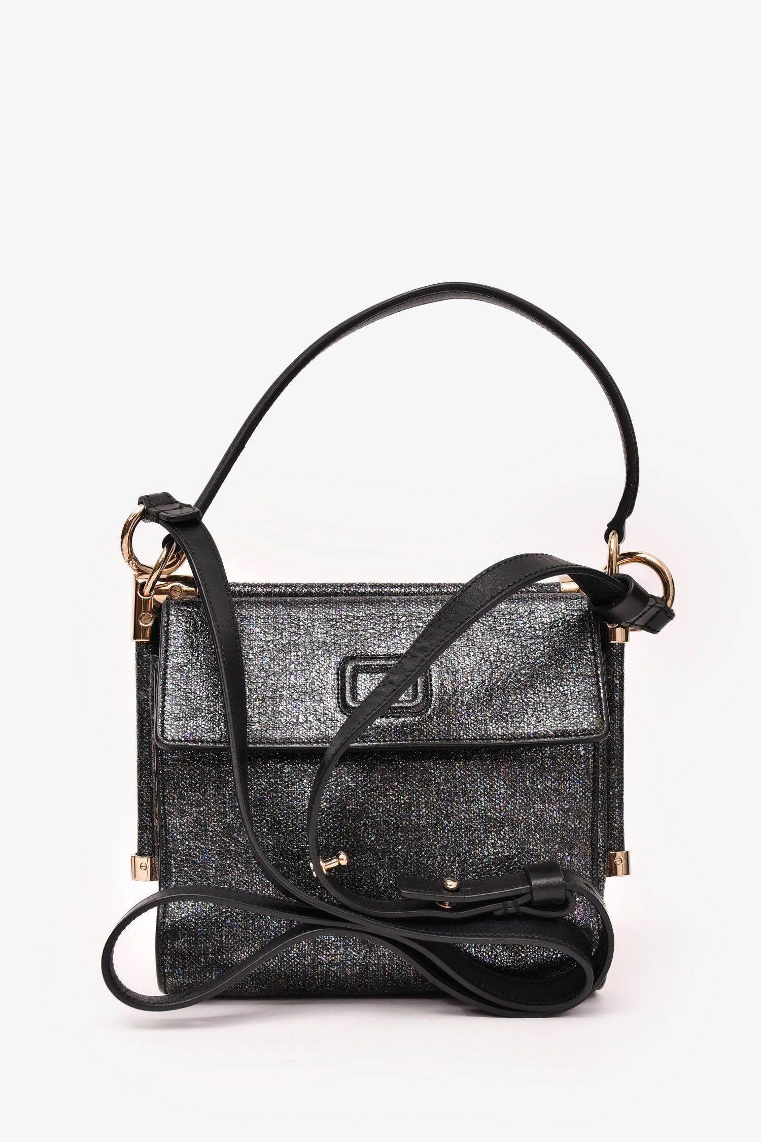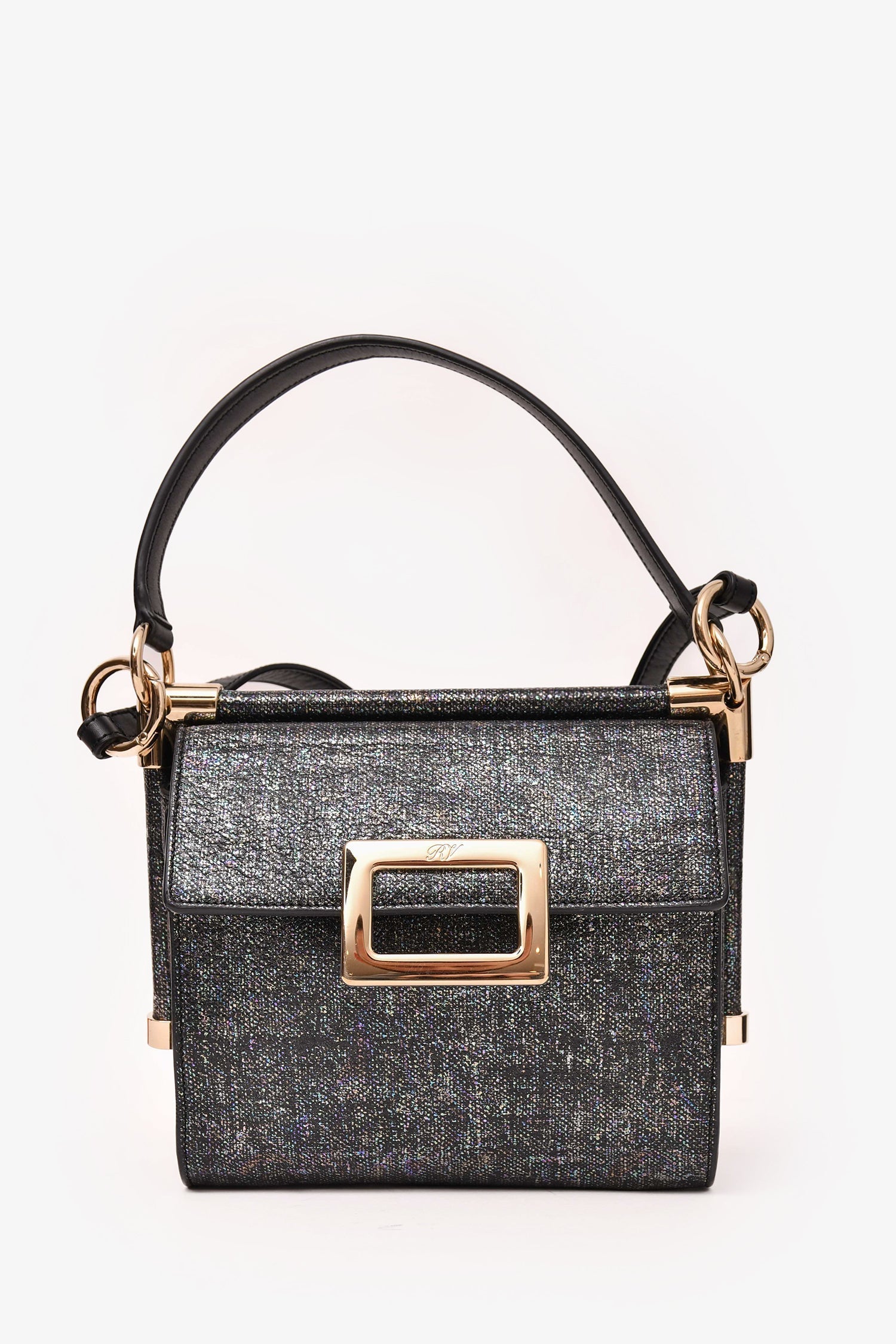 Roger Vivier Grey Metallic Fabric Miss Viv Crossbody Bag. Two compartments with magnetic button closure. One small interior pocket. Silver-tone hardware. Adjustable strap. Tonal stitching.