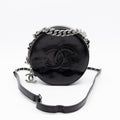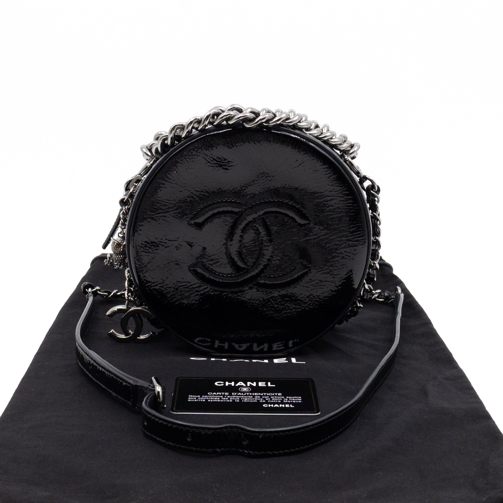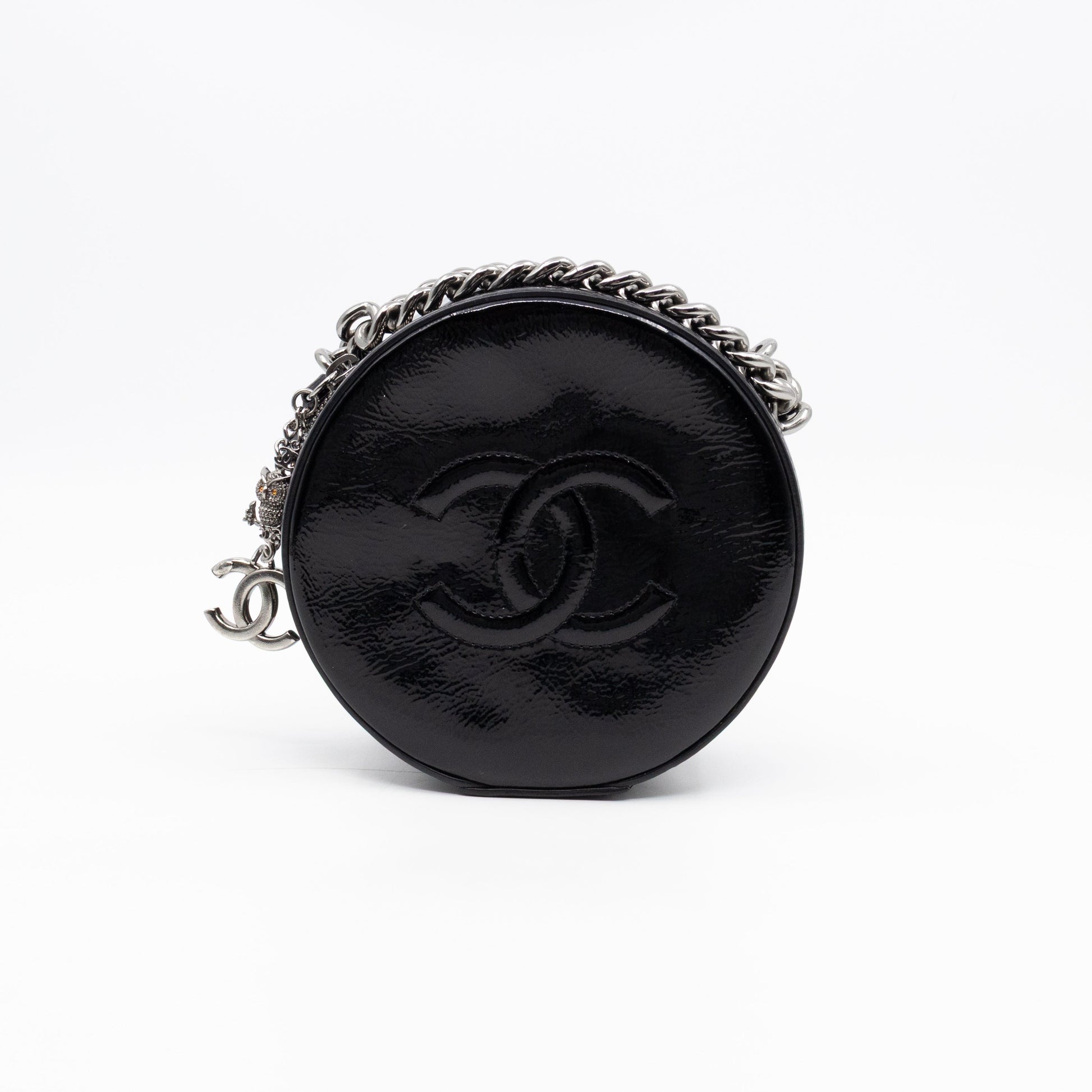 A rare Chanel Round As Earth Bag. This round bag is crafted of patent leather in black with silver hardware. The zipper opens to a compact interior that fits a regular sized iPhone (about 15 cm), and small daily essentials. On the zipper pulley is a cute owl and CC charms. Can be worn crossbody or carried by the chain handle.