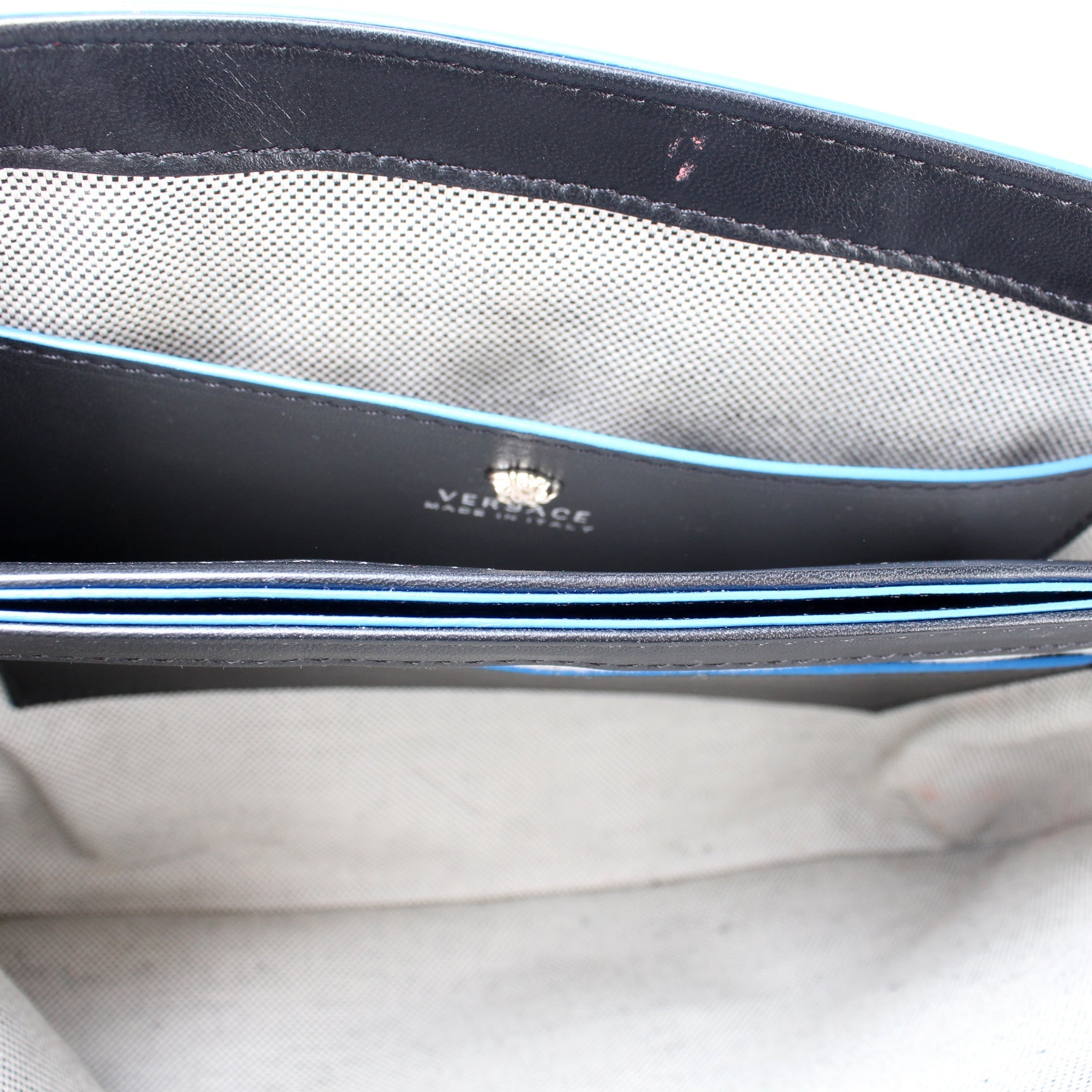 Exterior: The exterior is free of any rips or cracks. The corners show minor wear. There are minor scuffs throughout the leather. The exterior features two zip closure pockets.
