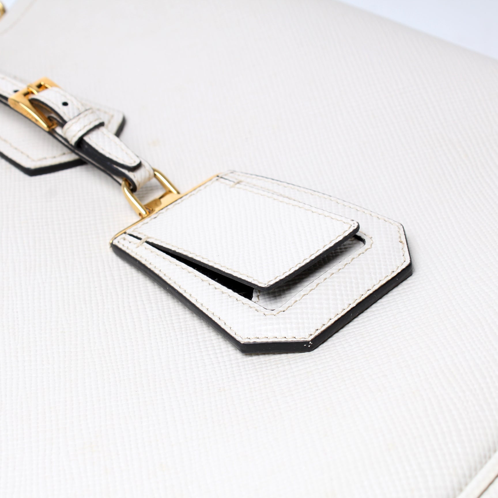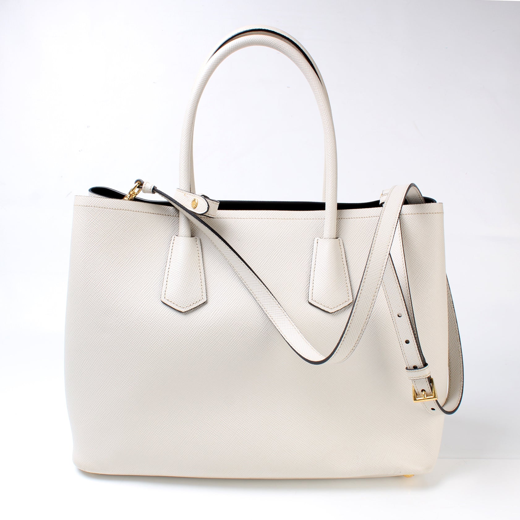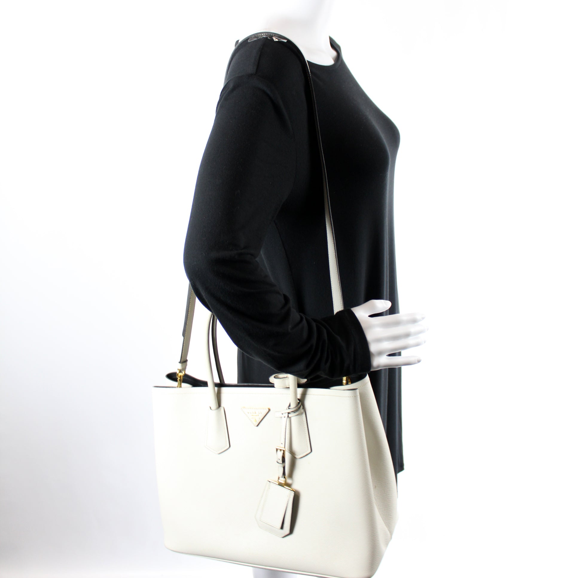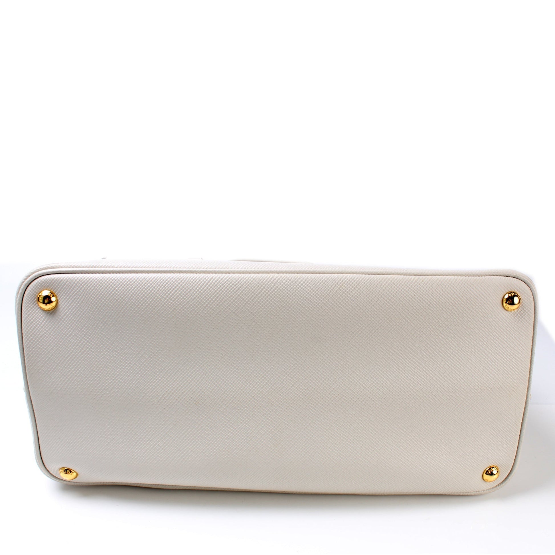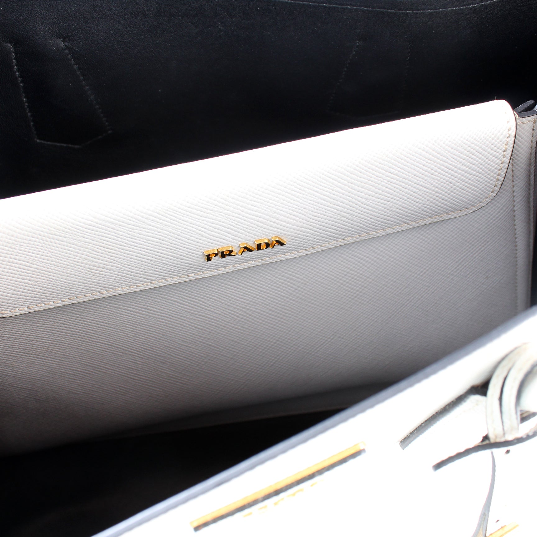 This Prada Cuir Double Mediumis eye catching bag. The exterior is in Saffiano leather.