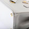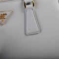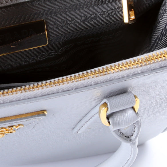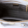 This Prada Galleria Smallis eye catching bag. The exterior is in the classic Prada Saffiano Leather.