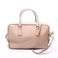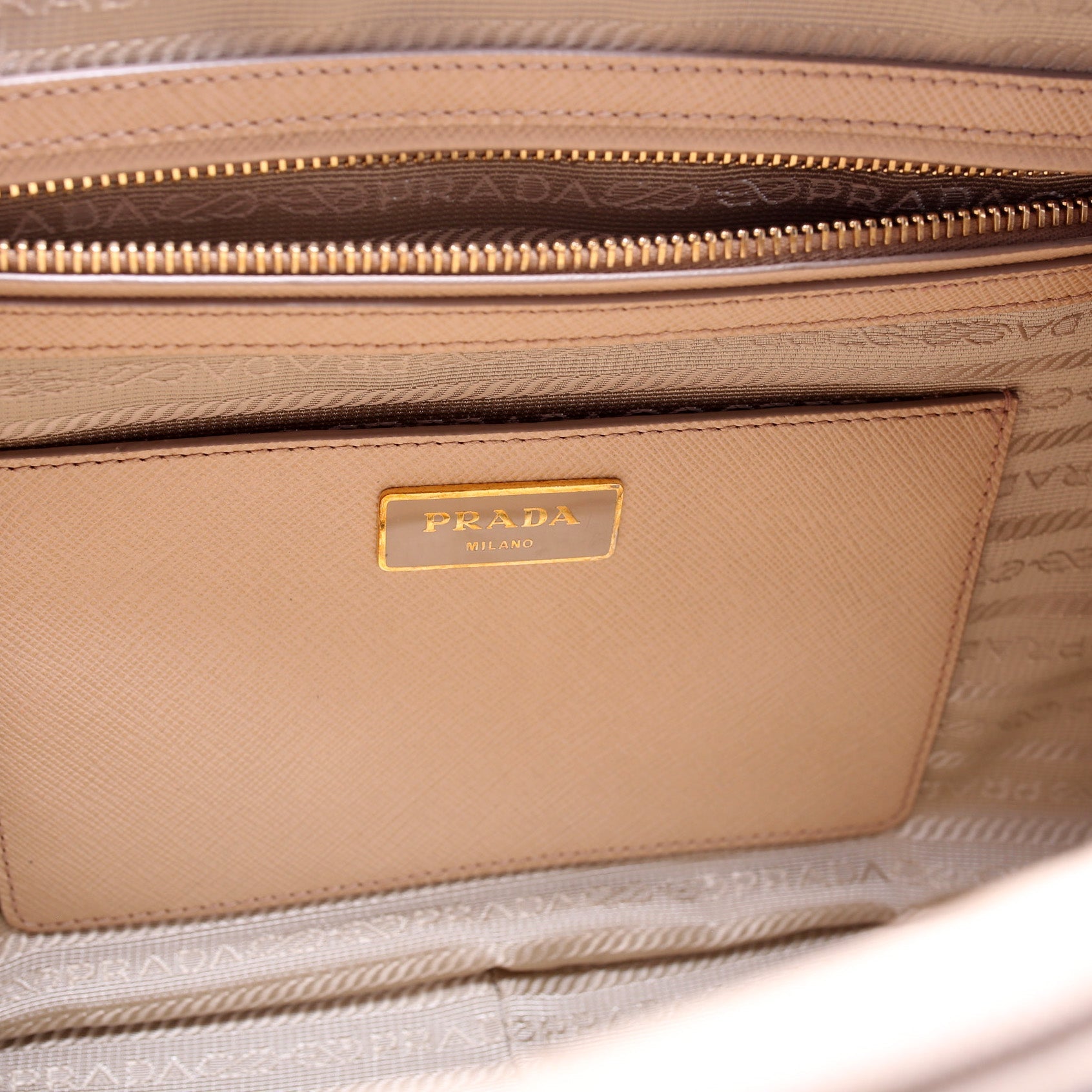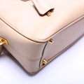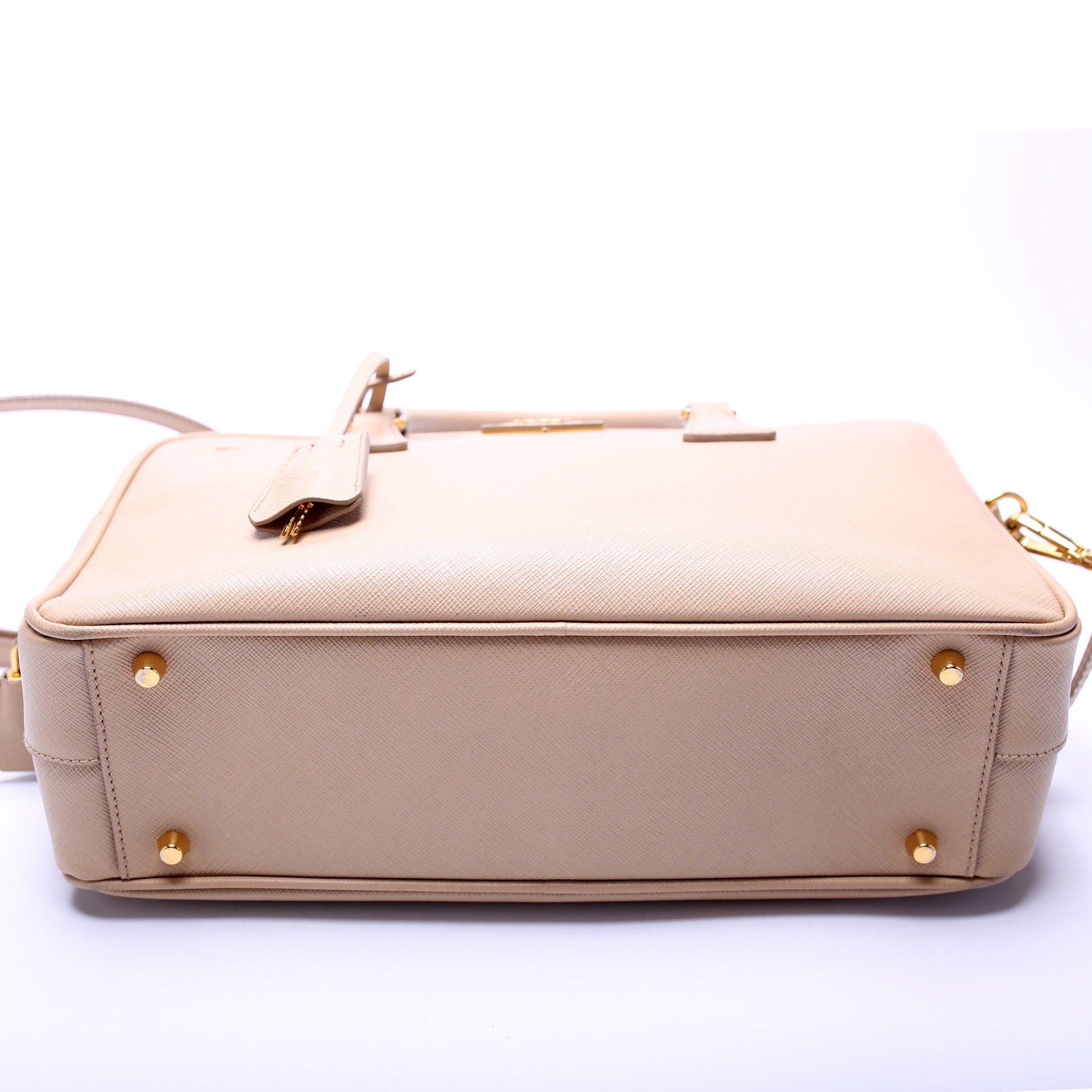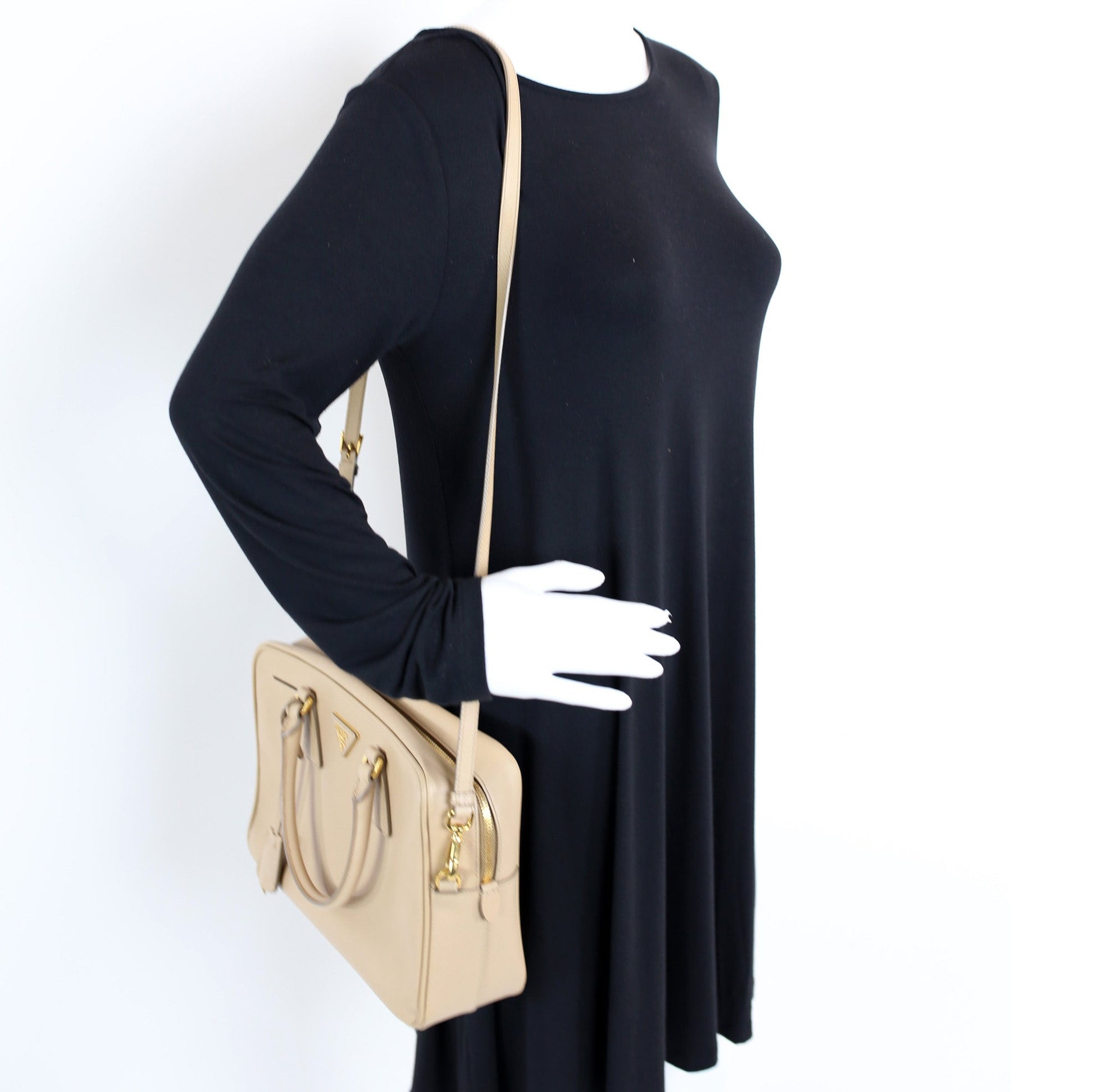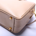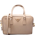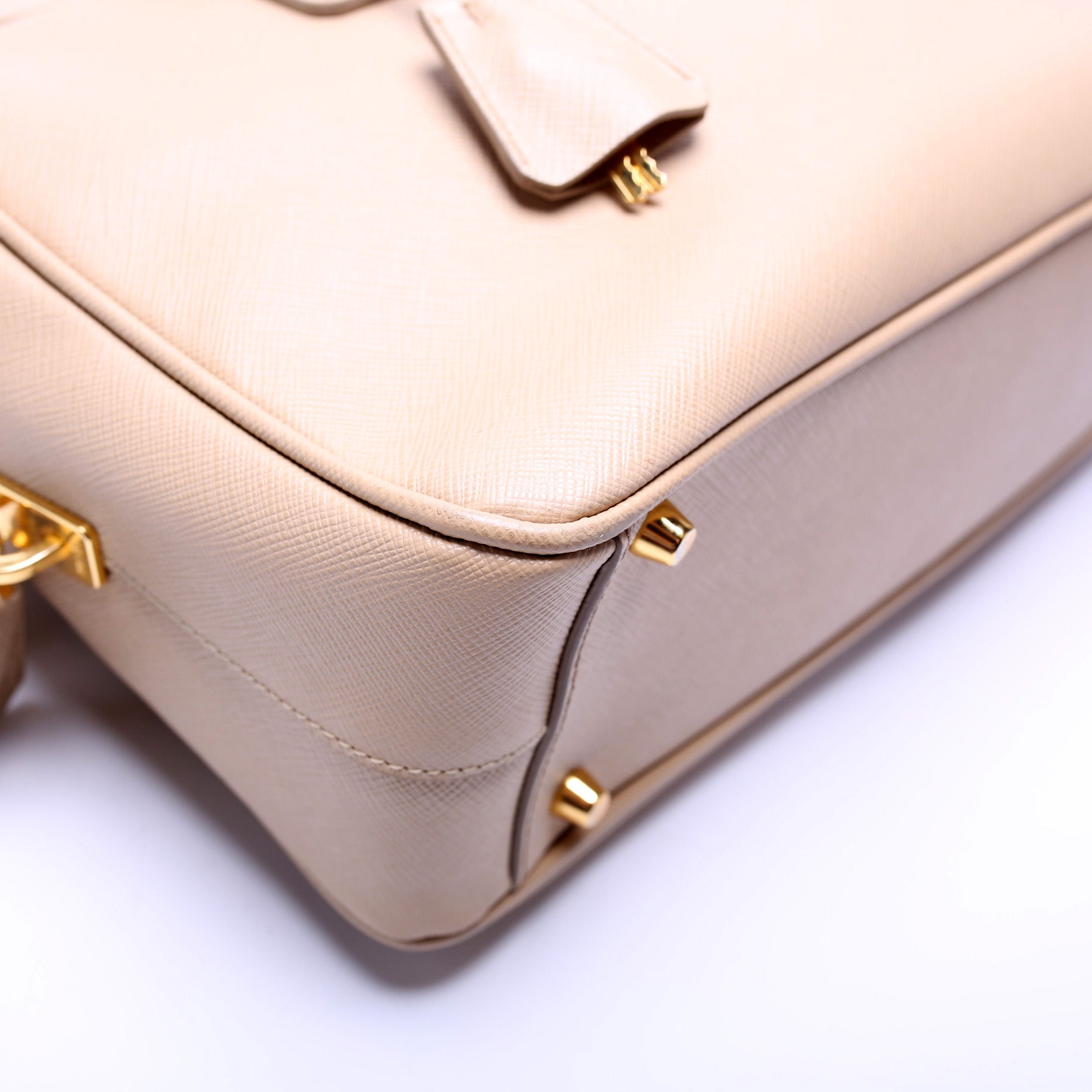 This Prada Saffiano Lux Bauletto Bagis eye catching bag. The exterior is in the classic Prada saffiano leather.
