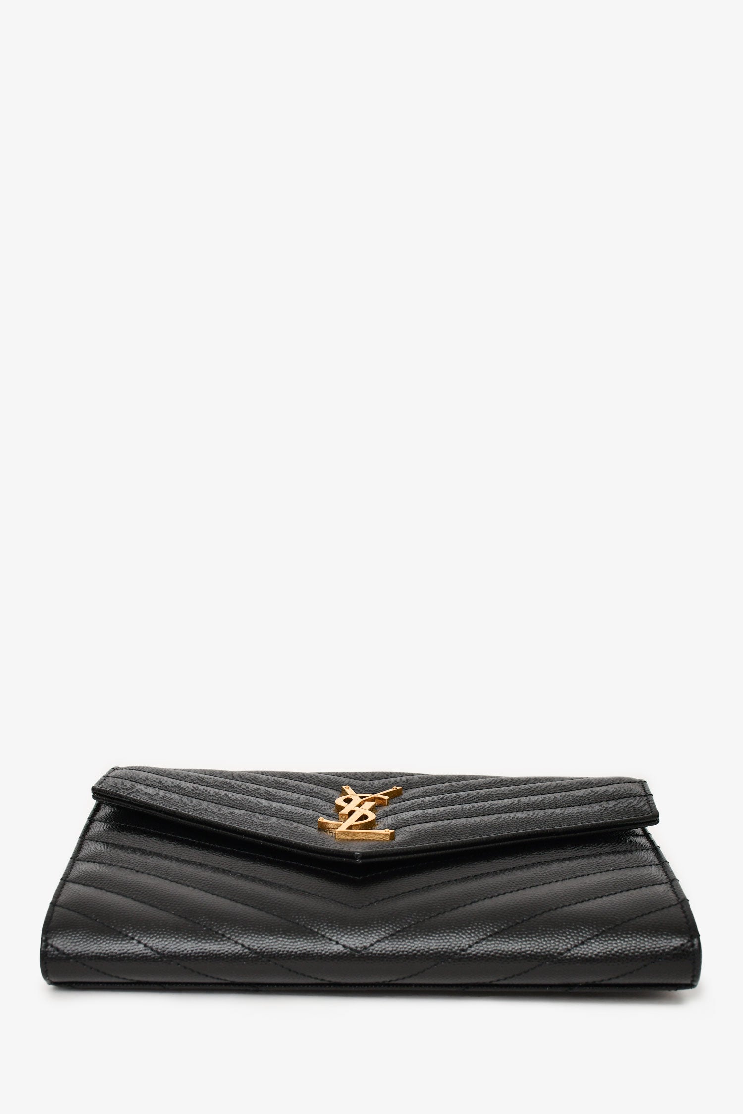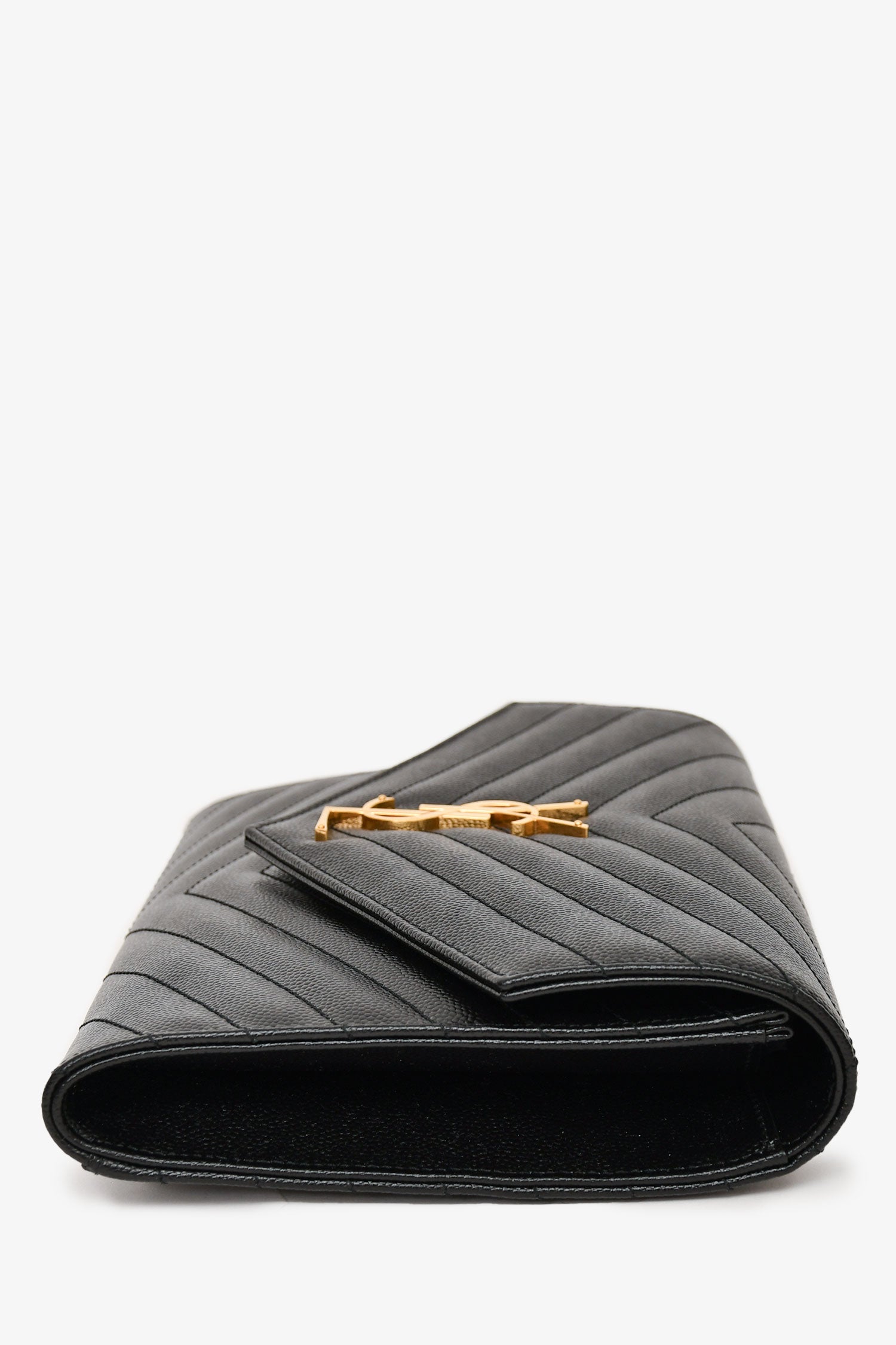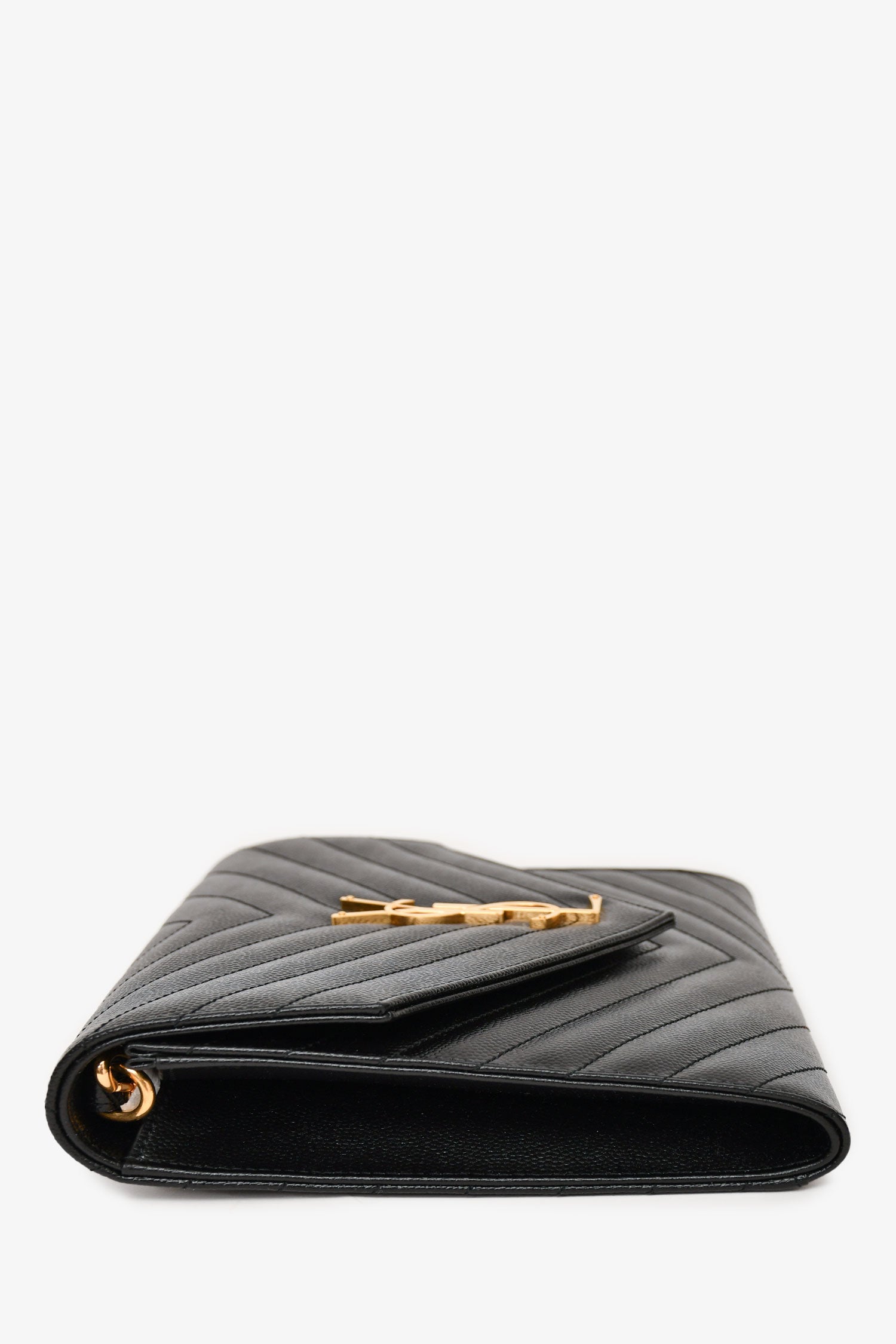 Saint Laurent 2022 Black Leather Chevron Quilted Cassandra Clutch. Front fold-over closure with snap-button. Single interior wall slip pocket. Removable wrist strap. Tonal textile interior lining. Gold-toned hardware. Tonal stitching.