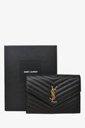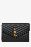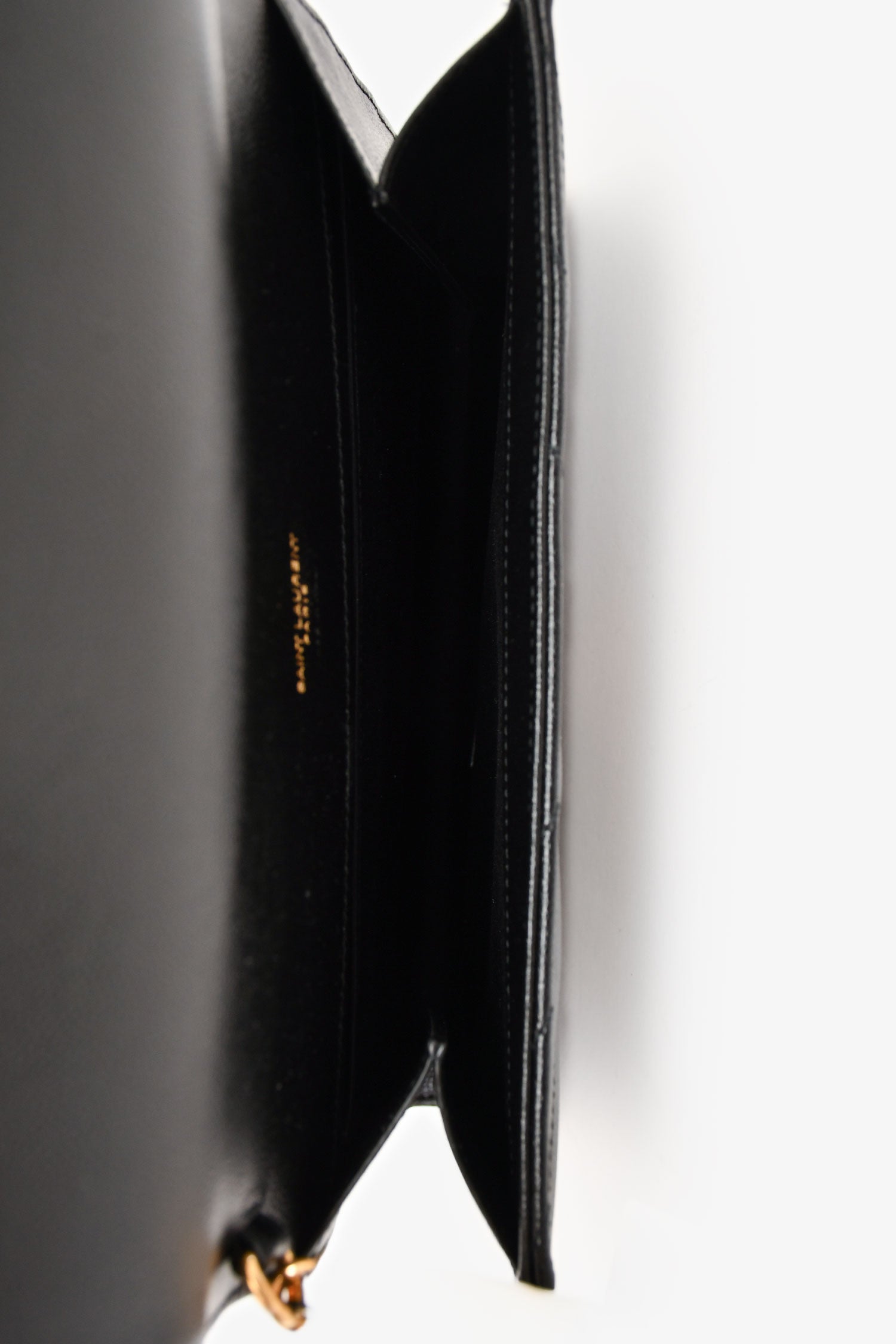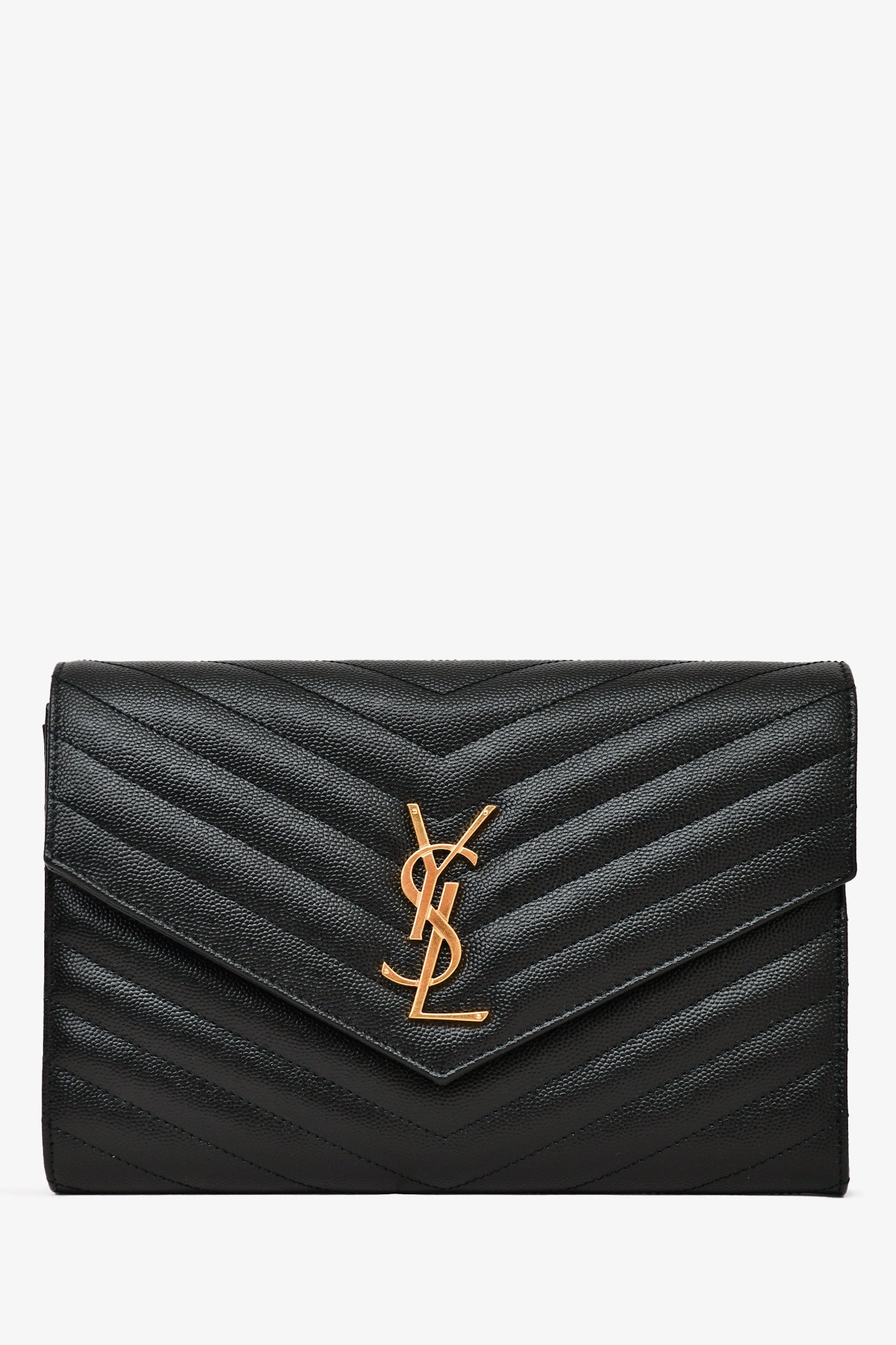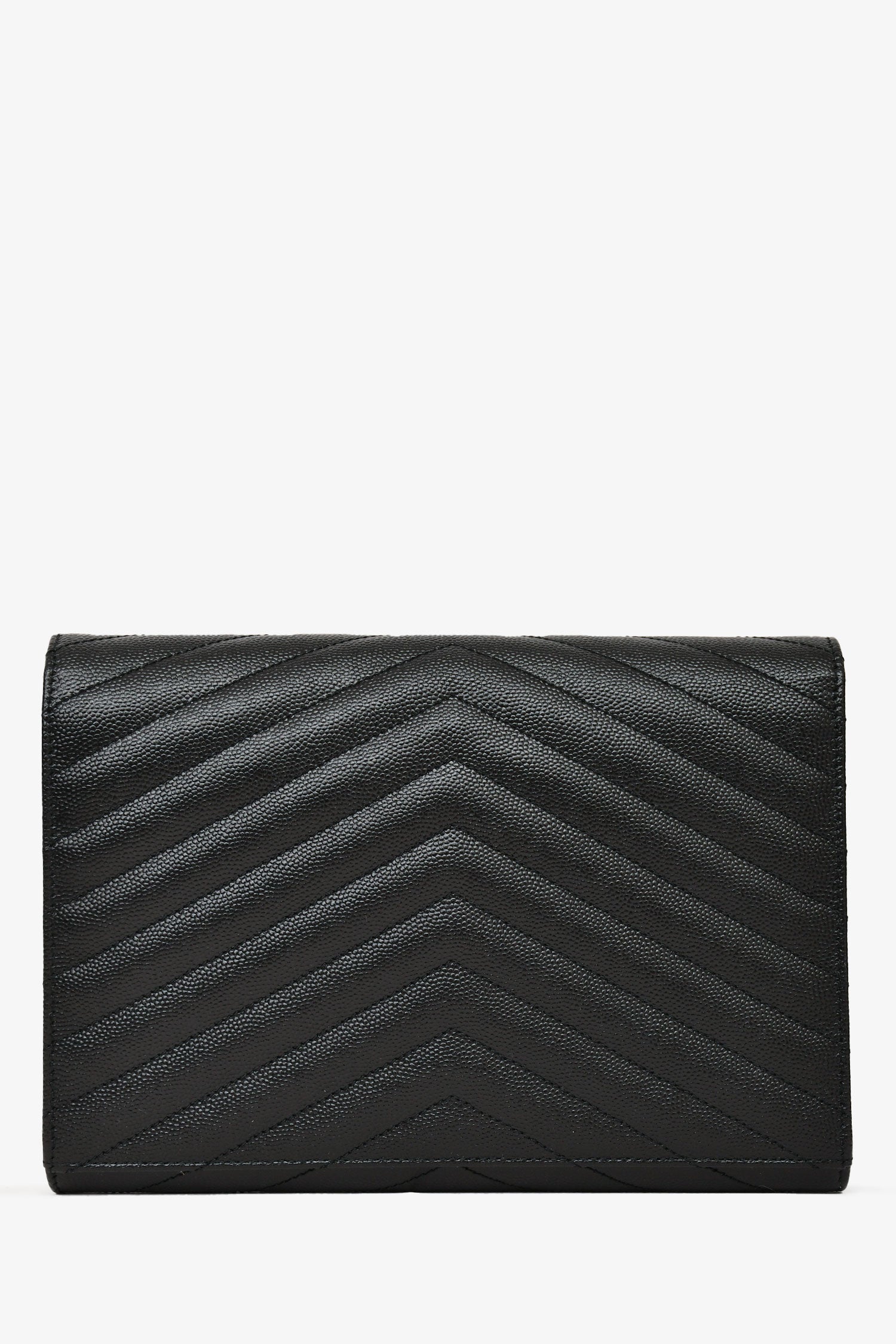 Saint Laurent 2022 Black Leather Chevron Quilted Cassandra Clutch. Front fold-over closure with snap-button. Single interior wall slip pocket. Removable wrist strap. Tonal textile interior lining. Gold-toned hardware. Tonal stitching.