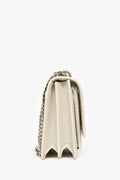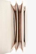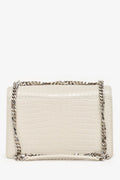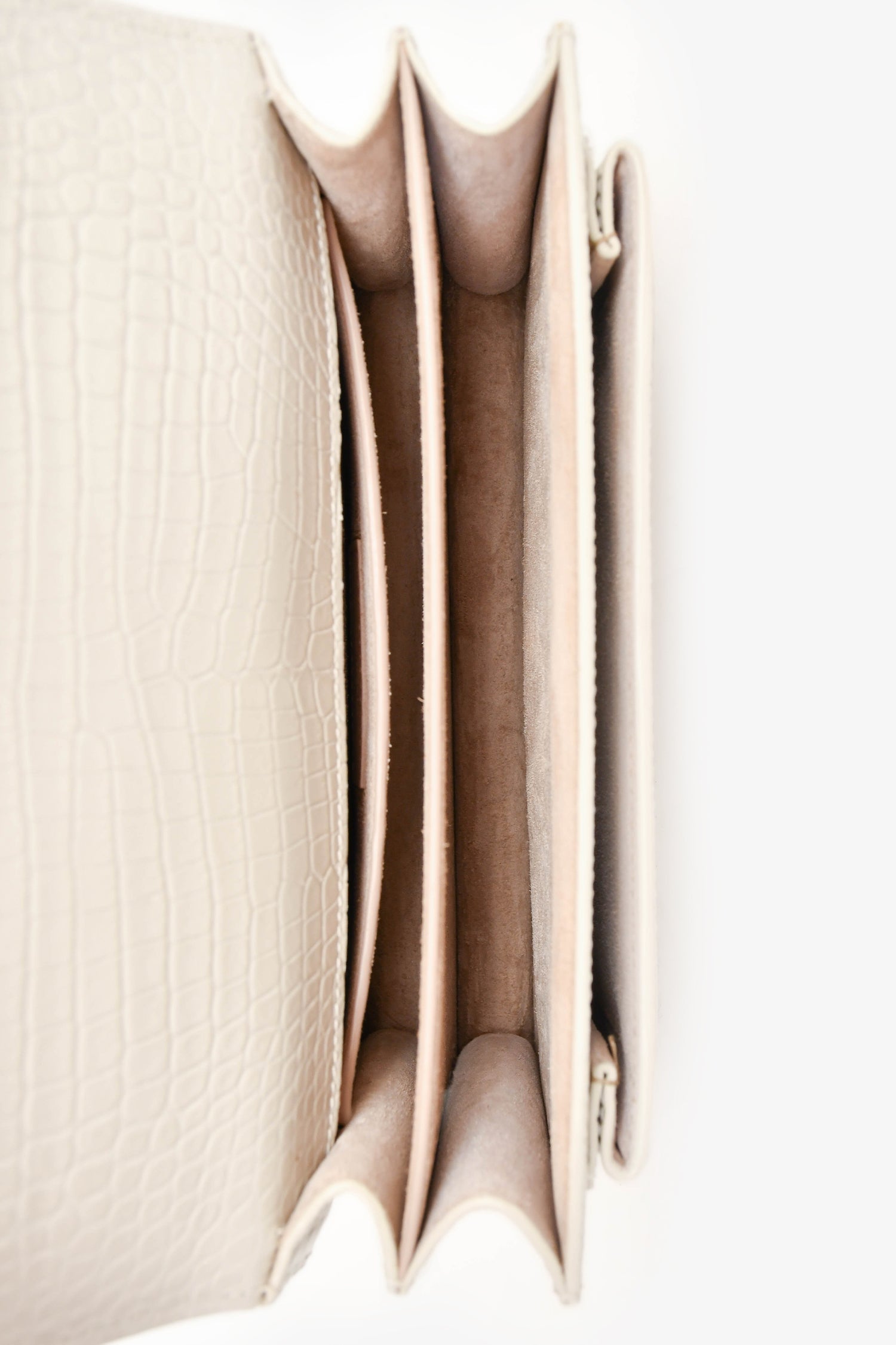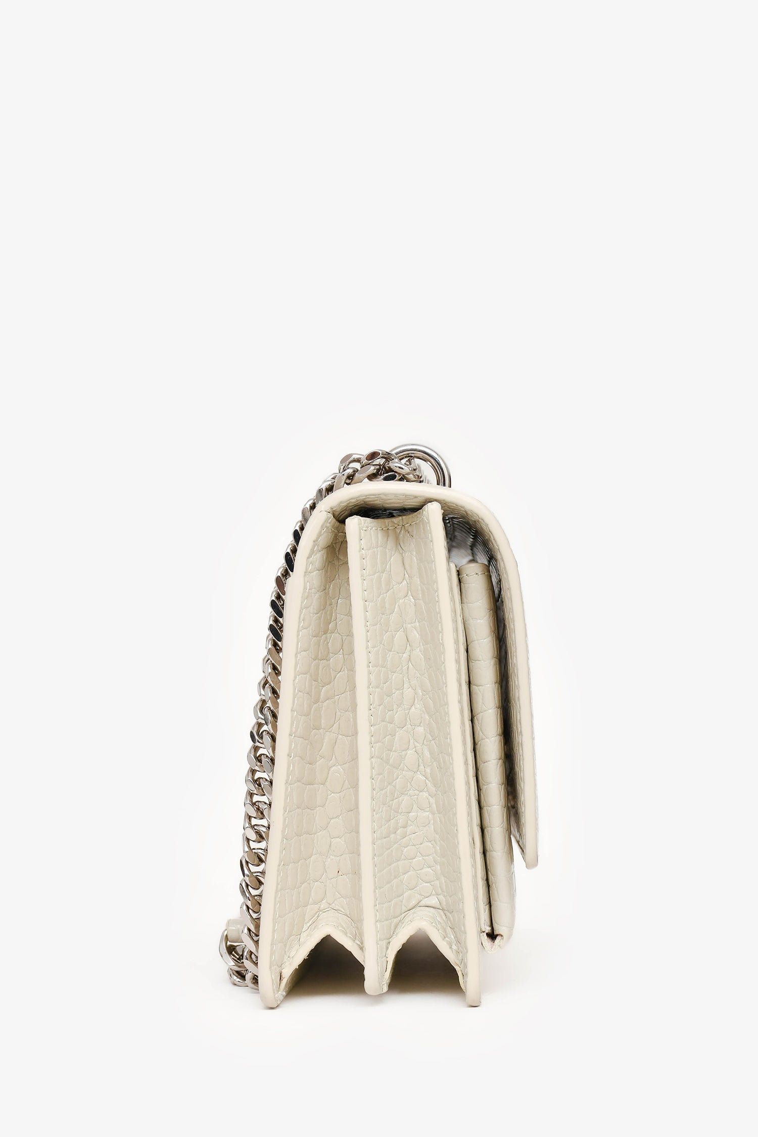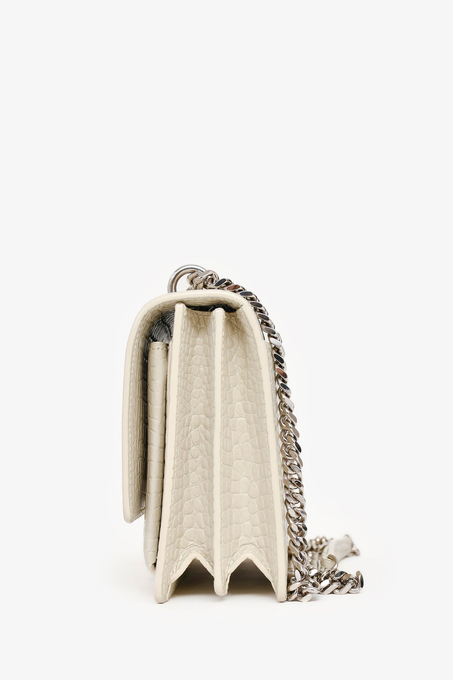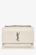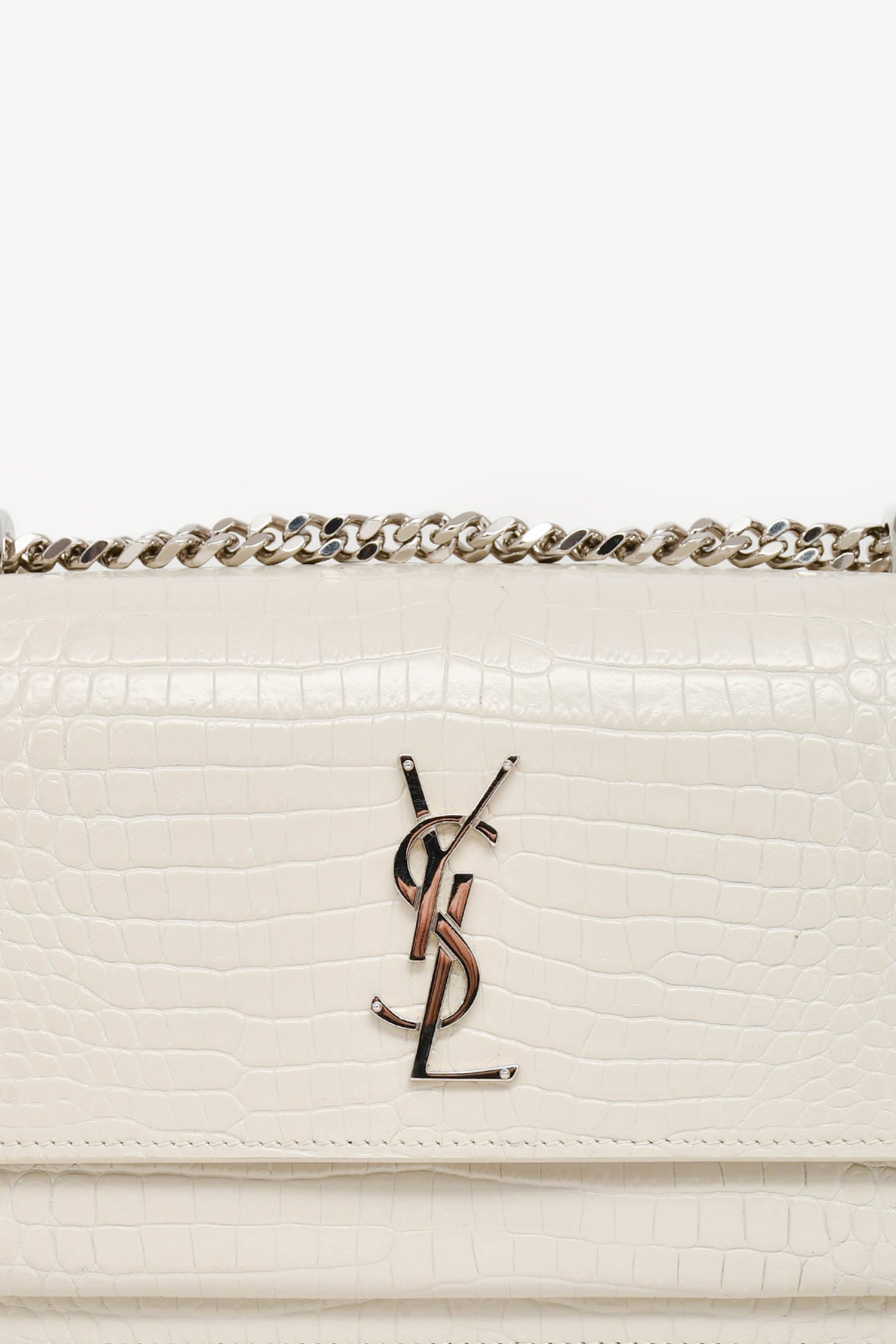 Saint Laurent 2022 Grey Croc Embossed Leather Medium Sunset Shoulder Bag. Fold-over flap with magnetic button closure. Three interior compartments. One wall slip pockets. Single back exterior slip pocket. Silver-tone chain strap. Tonal stitching. Comes with dust bag.