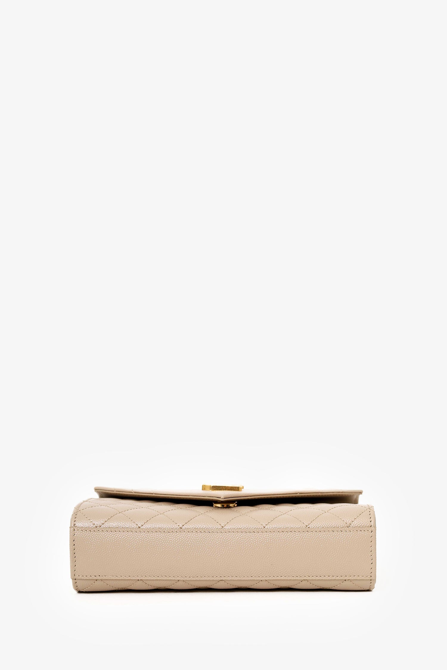 Saint Laurent Beige Grain De Poudre Embossed Leather Small Envelope Shoulder Bag. Magnetic button closure. Interior wall card slip pockets. Gold-tone hardware. Tonal stitching.