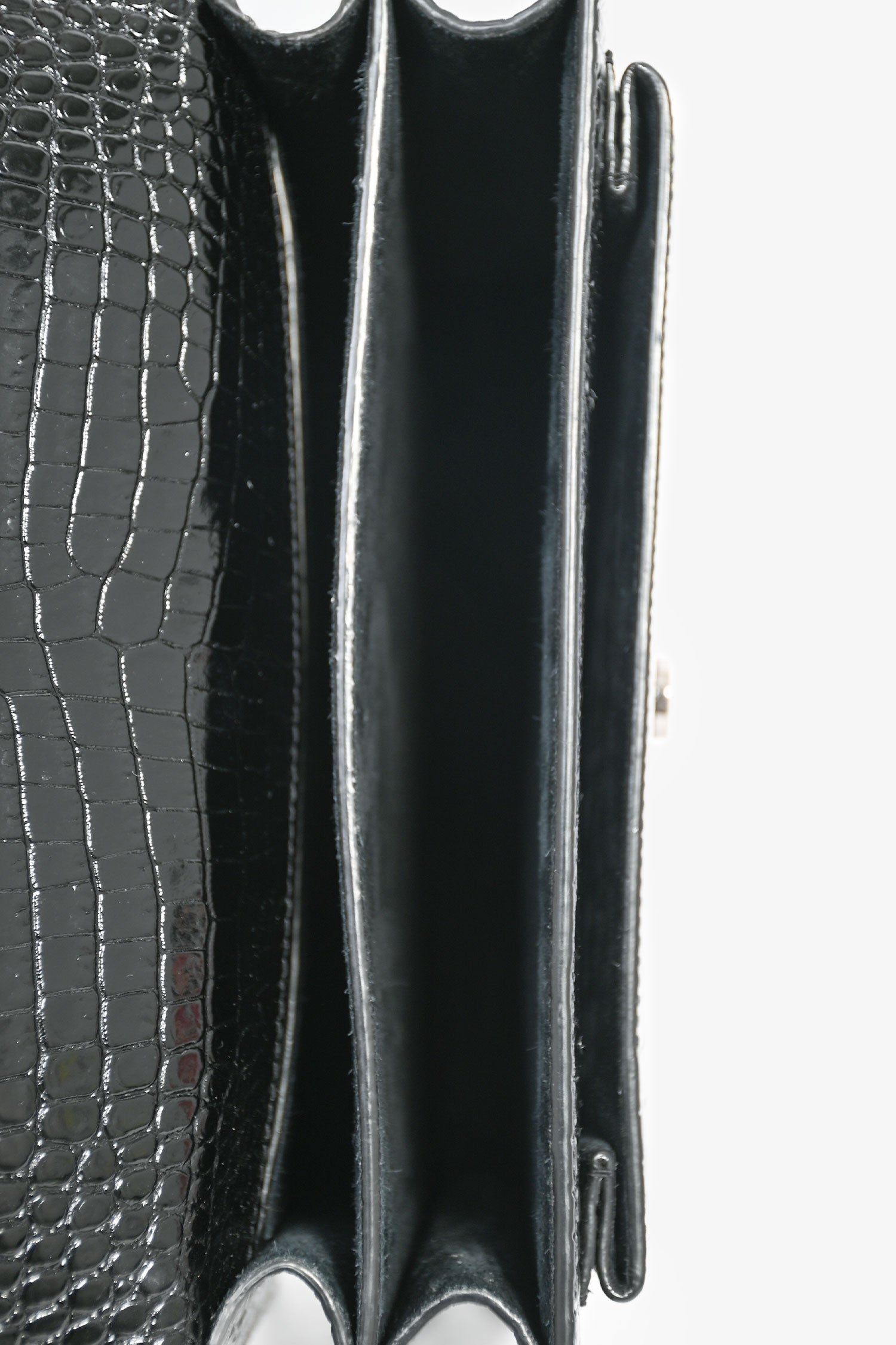 Saint Laurent Black Croc Embossed Sunset Medium Chain Shoulder Bag. Fold-over flap with a snap closure. Black-tone hardware. Chain-link shoulder strap. Attached clochette.