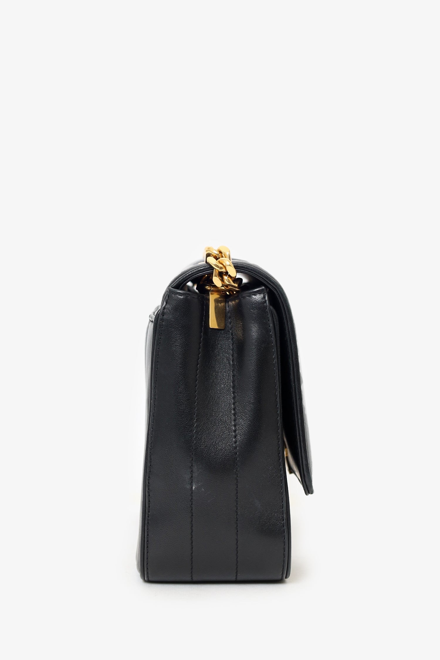 Saint Laurent Black Leather Medium Vicky Matelasse Shoulder Bag. Front fold-over flap with magnetic snap-button closure. Chainlink/leather strap. Rear exterior slip pocket. Leather-lined interior. Single interior slip pocket. Gold-tone hardware. Tonal stitching.