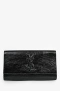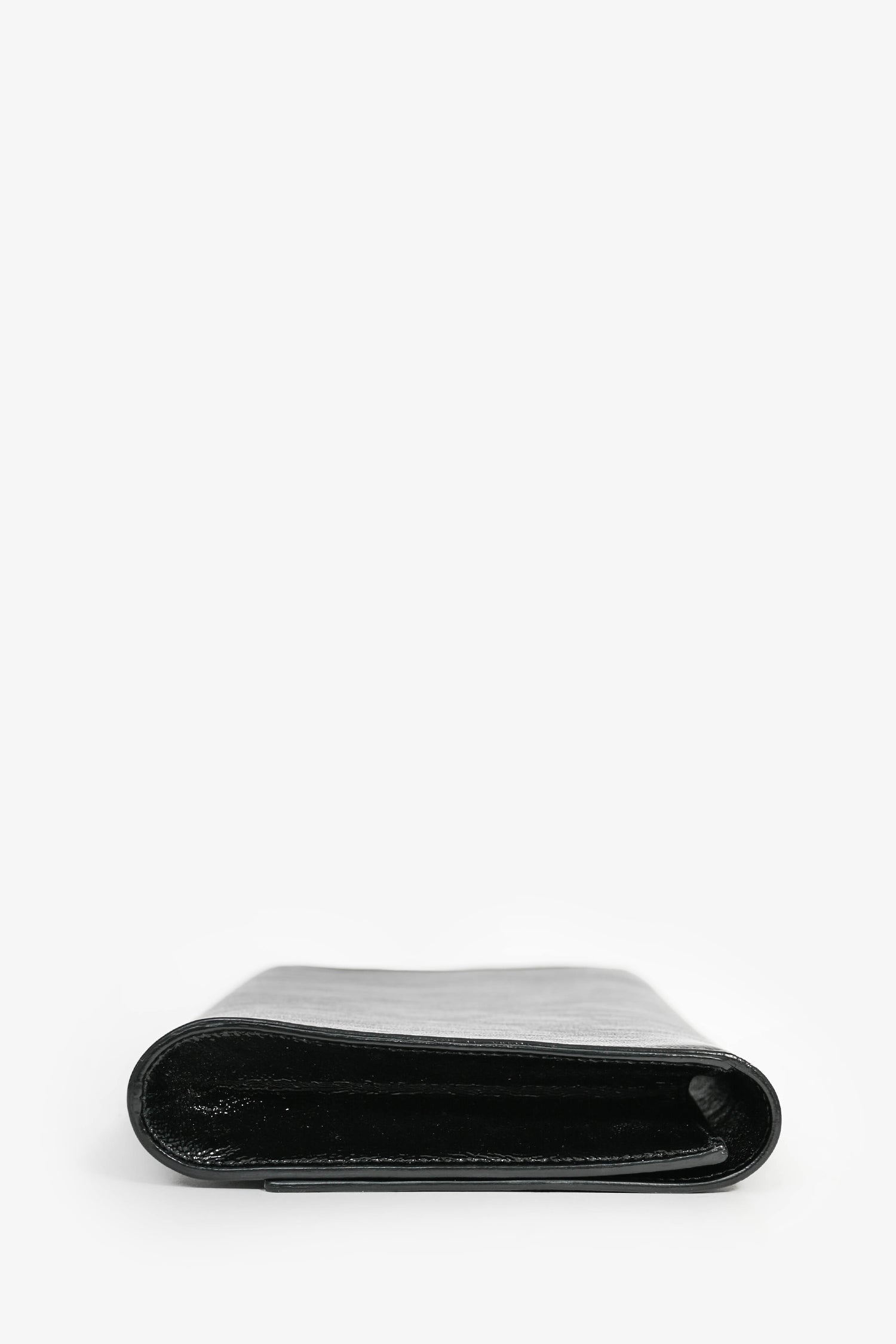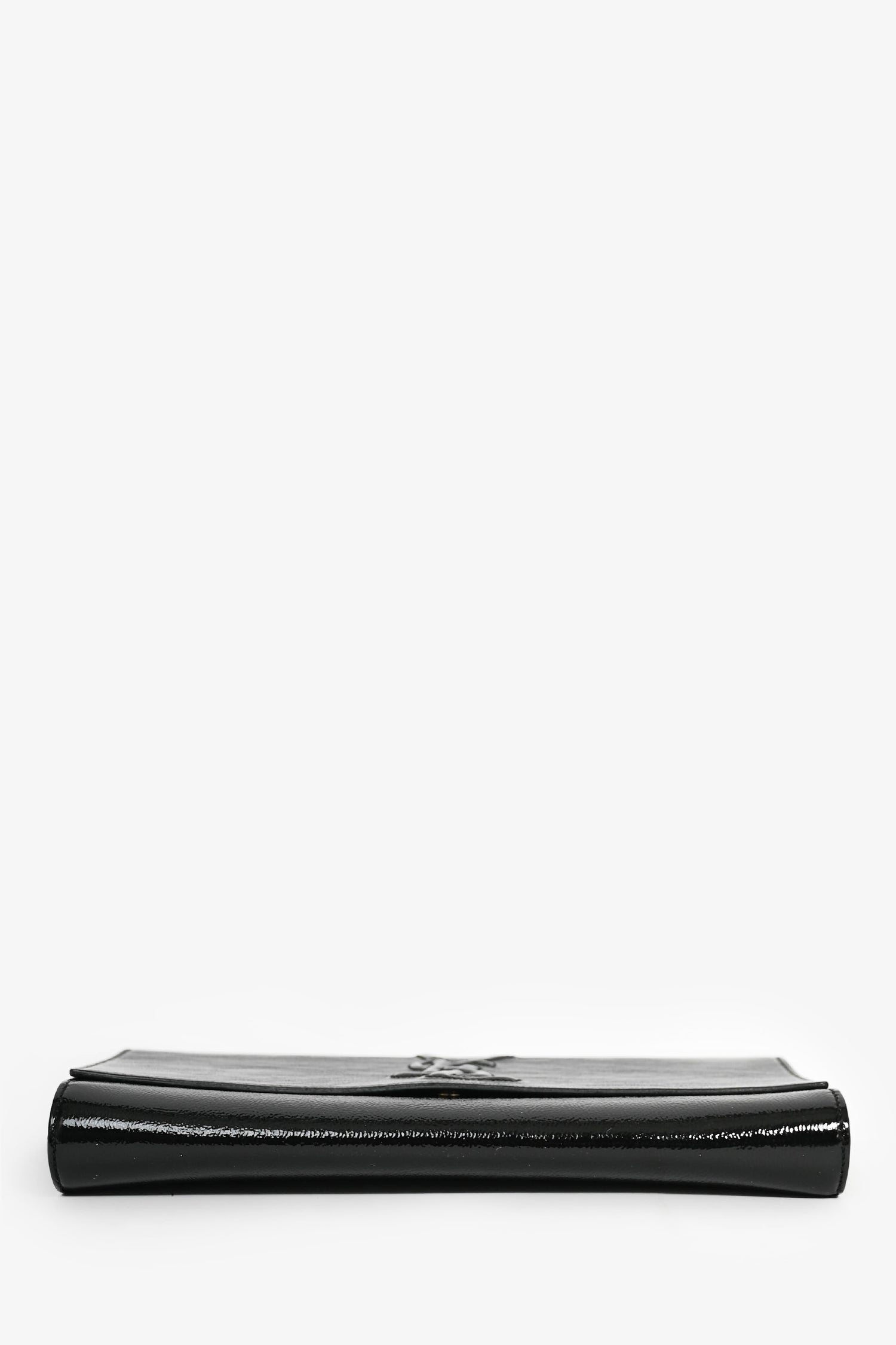 Saint Laurent Black Patent Leather 'Belle de Jour' Clutch. Fold-over flap with a magnetic closure. Interior slip pocket. Coated trimming. Tonal stitching.