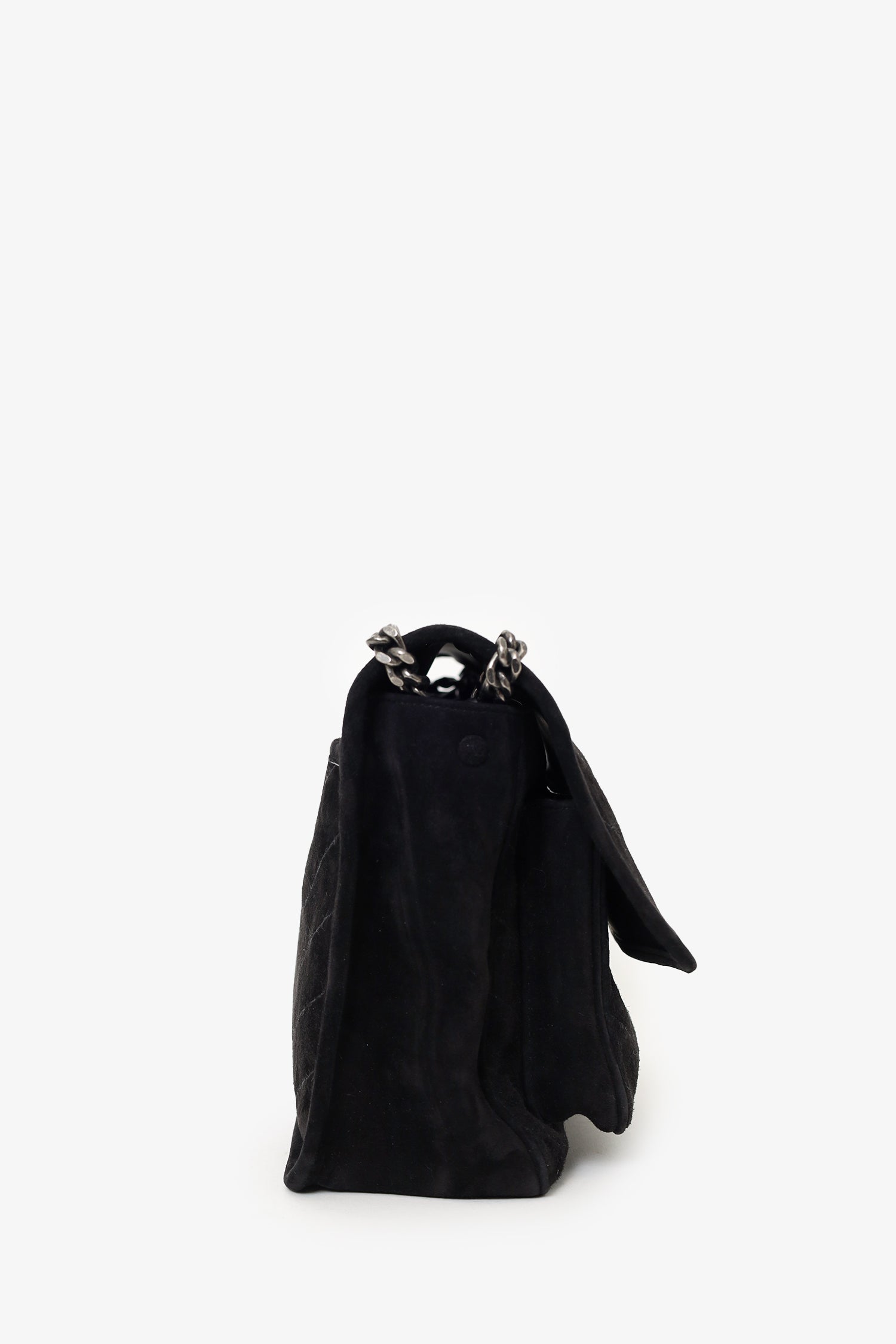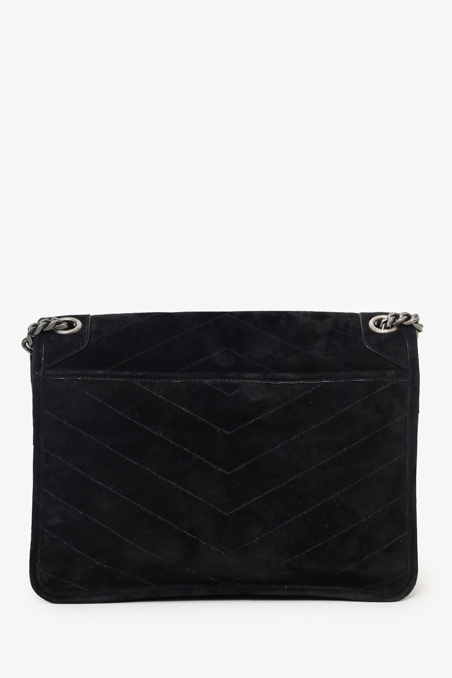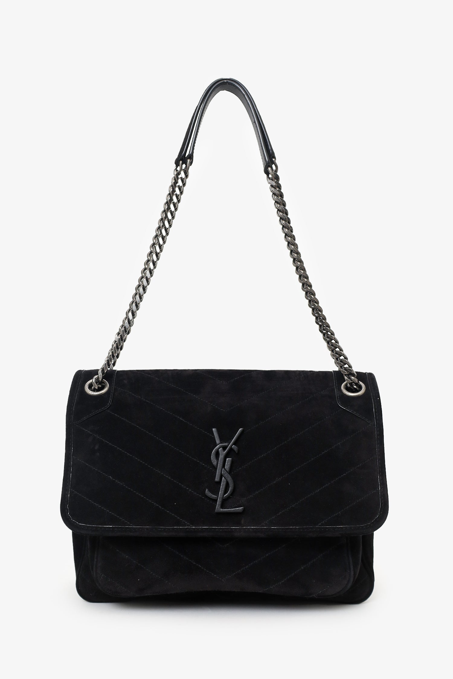 Saint Laurent Black Suede Medium Niki Shoulder Bag. Fold-over flap with magnetic snap-button closure. Twin chainlink strap that can be pulled into one longer strap. Single rear exterior pocket with magnetic closure. Two interior compartments; front open and main compartment with one slip and one zip pocket. Leather-lined interior. Tonal stitching.