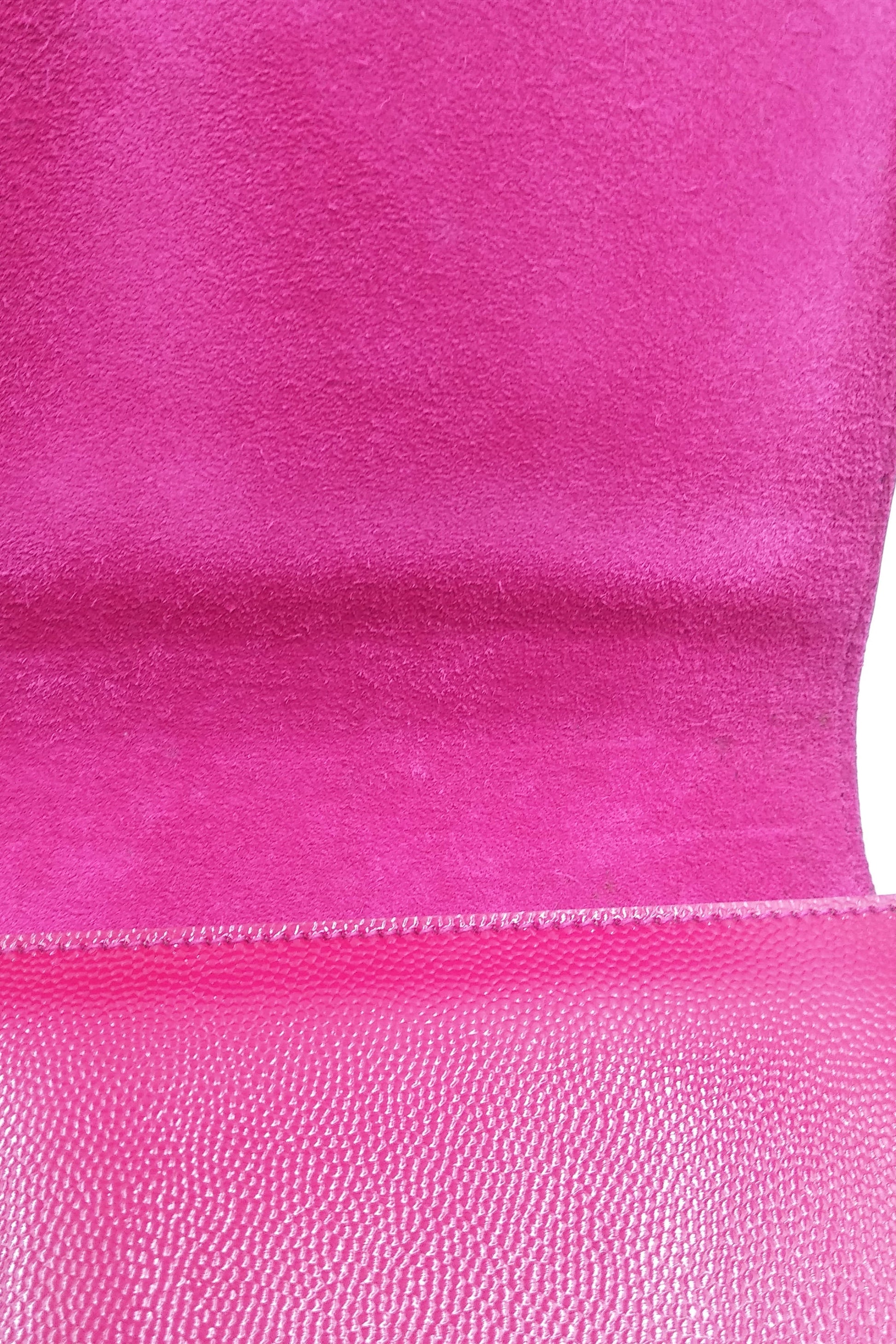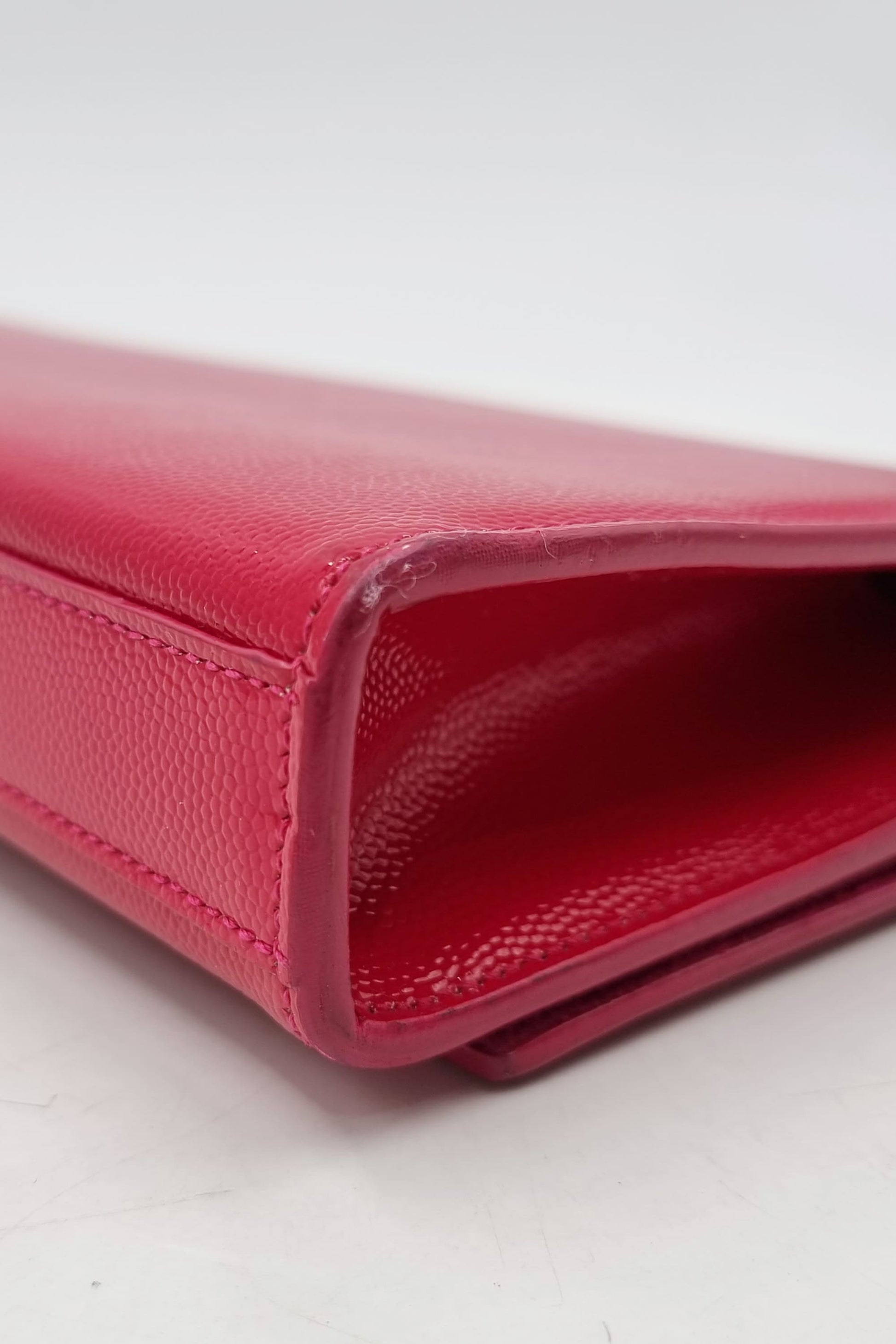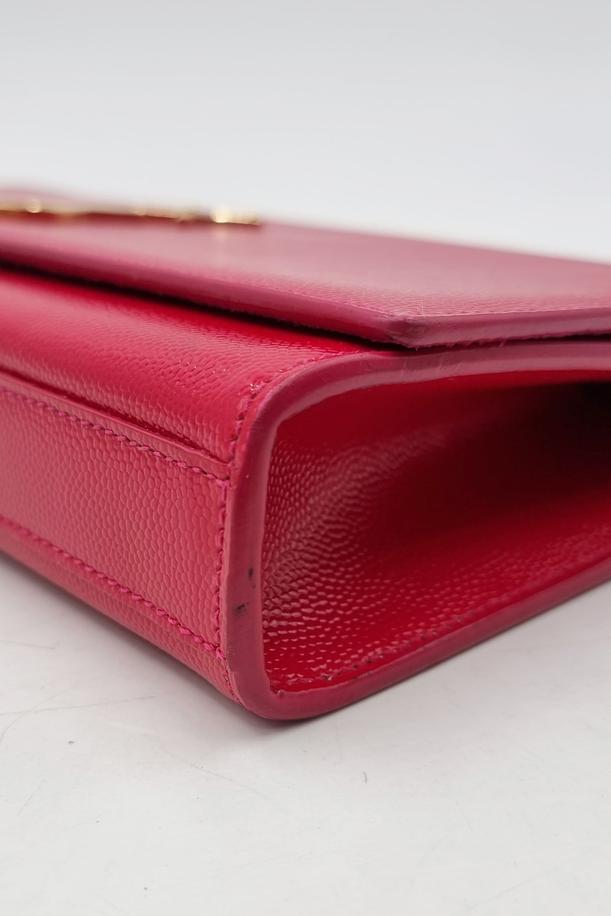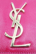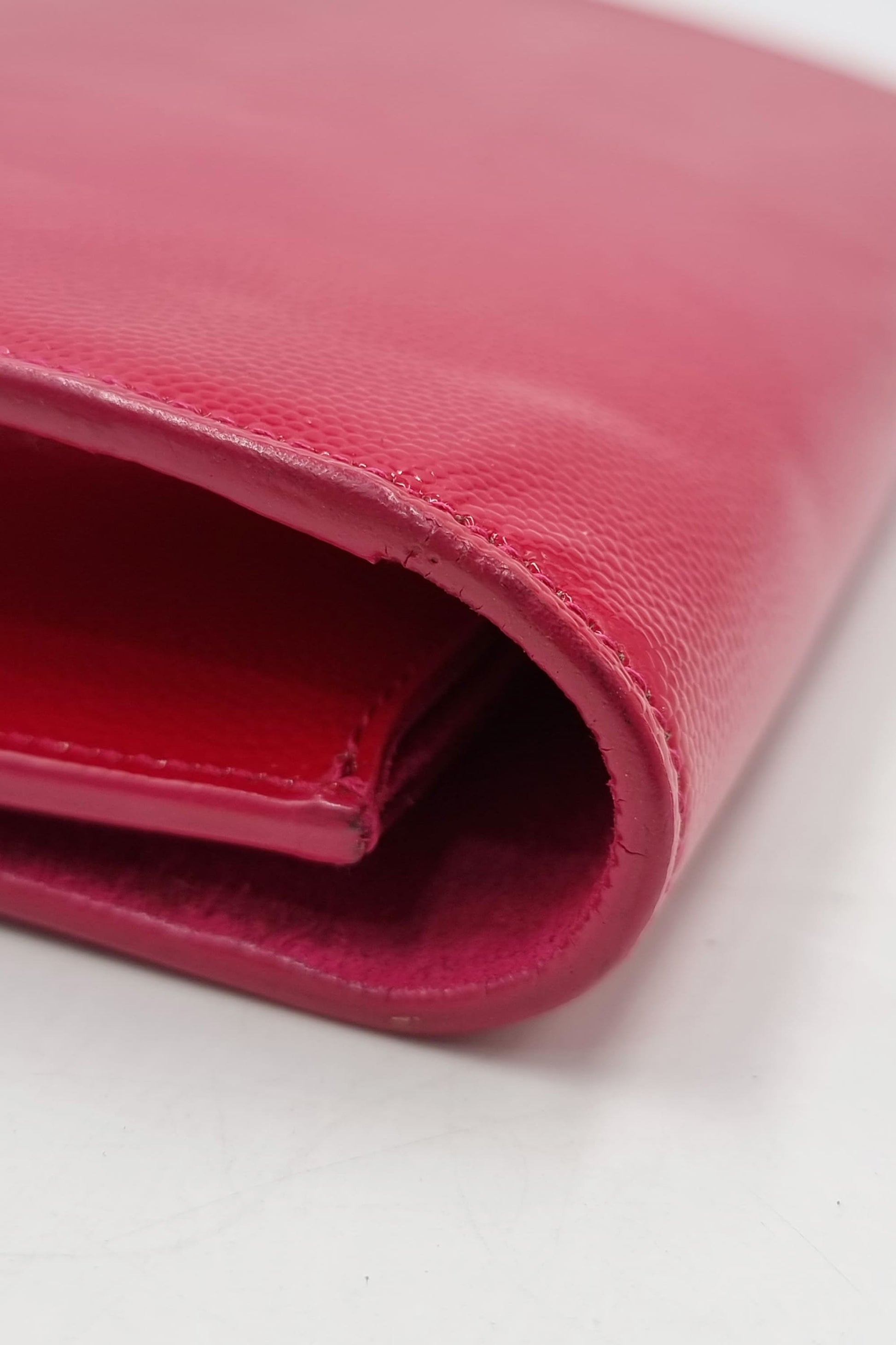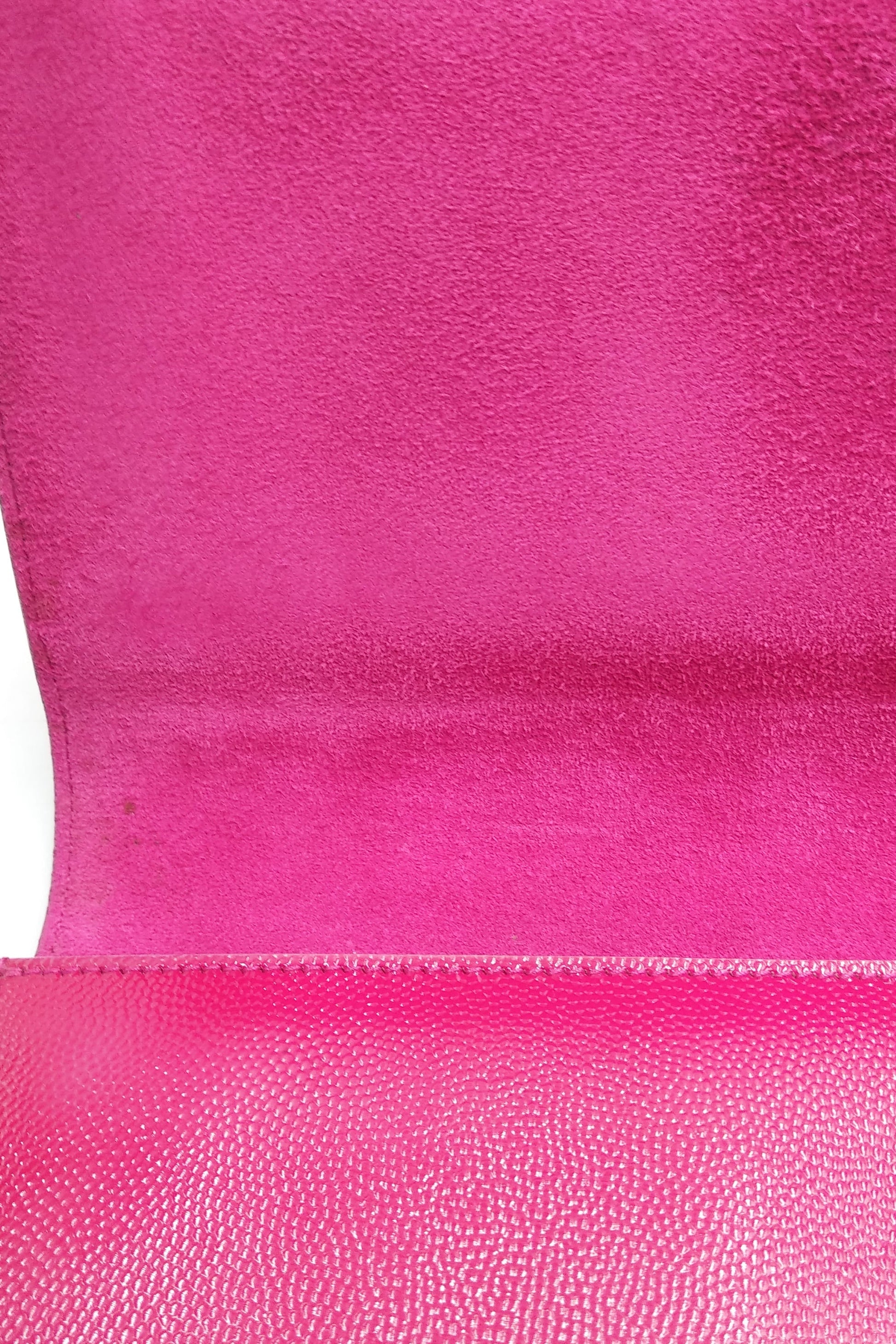 his is an SAINT LAURENT Grain De Poudre Classic Monogram Kate Clutch Lipstick in Fuchsia. This chic clutch is crafted of calfskin leather in bright pink.The front flap features a prominent gold classic YSL symbol which unsnaps to a black fabric interior with a small flat pocket.