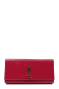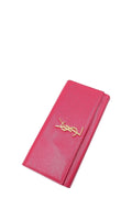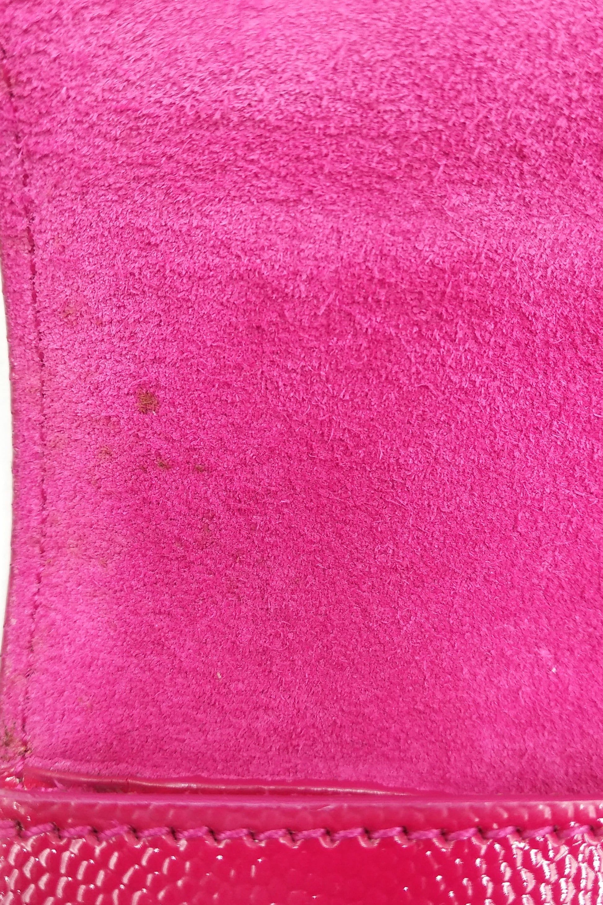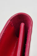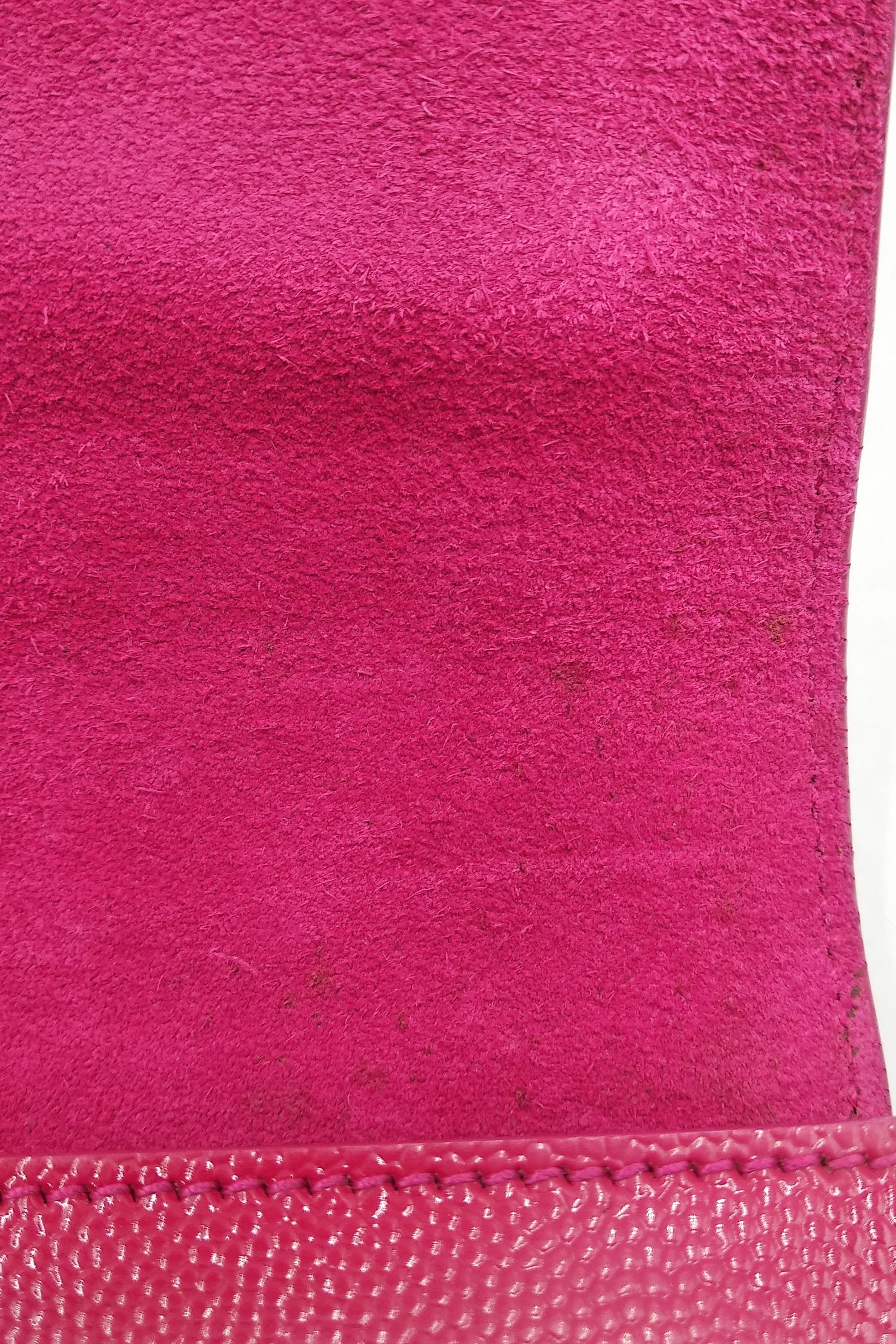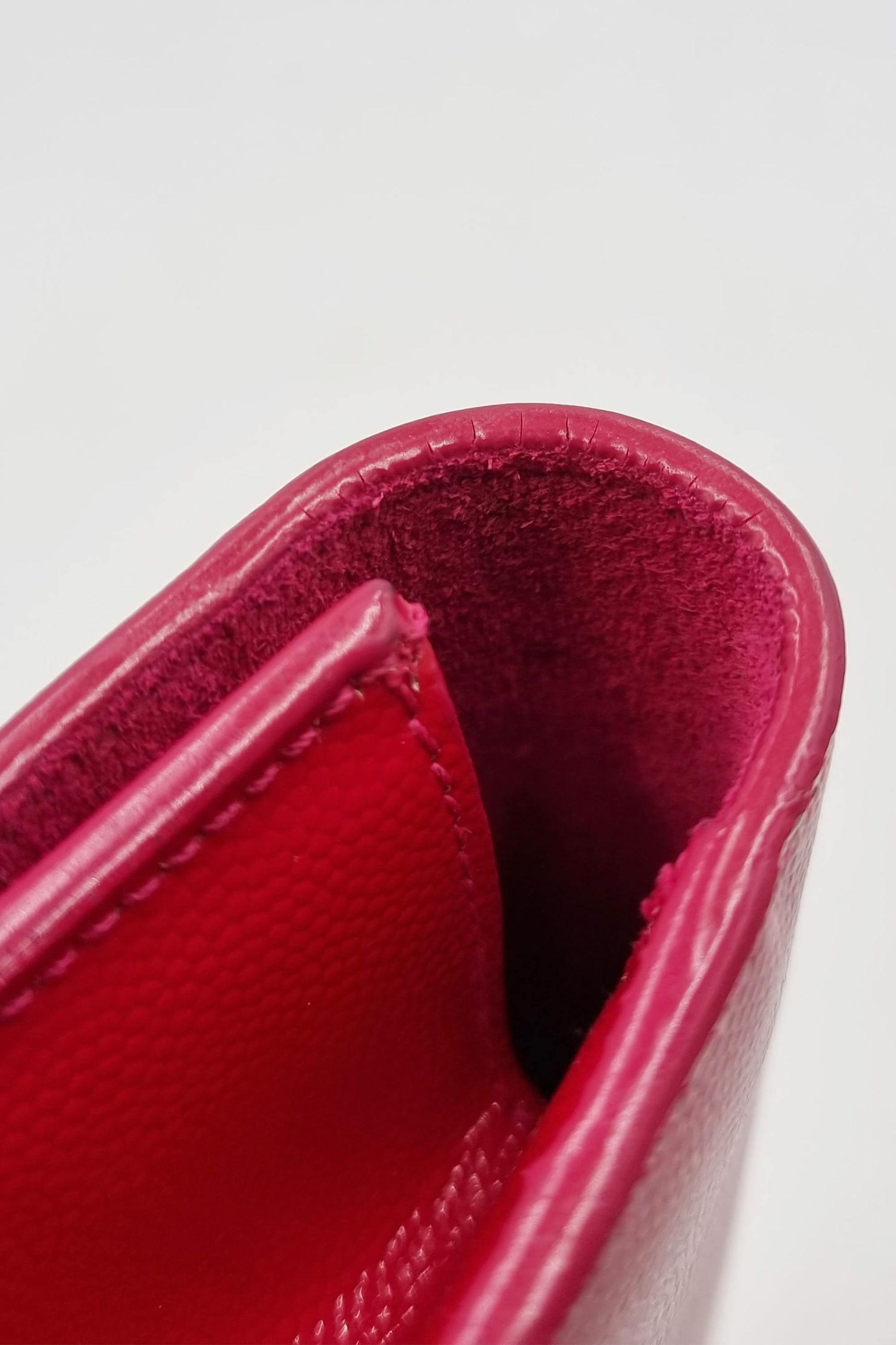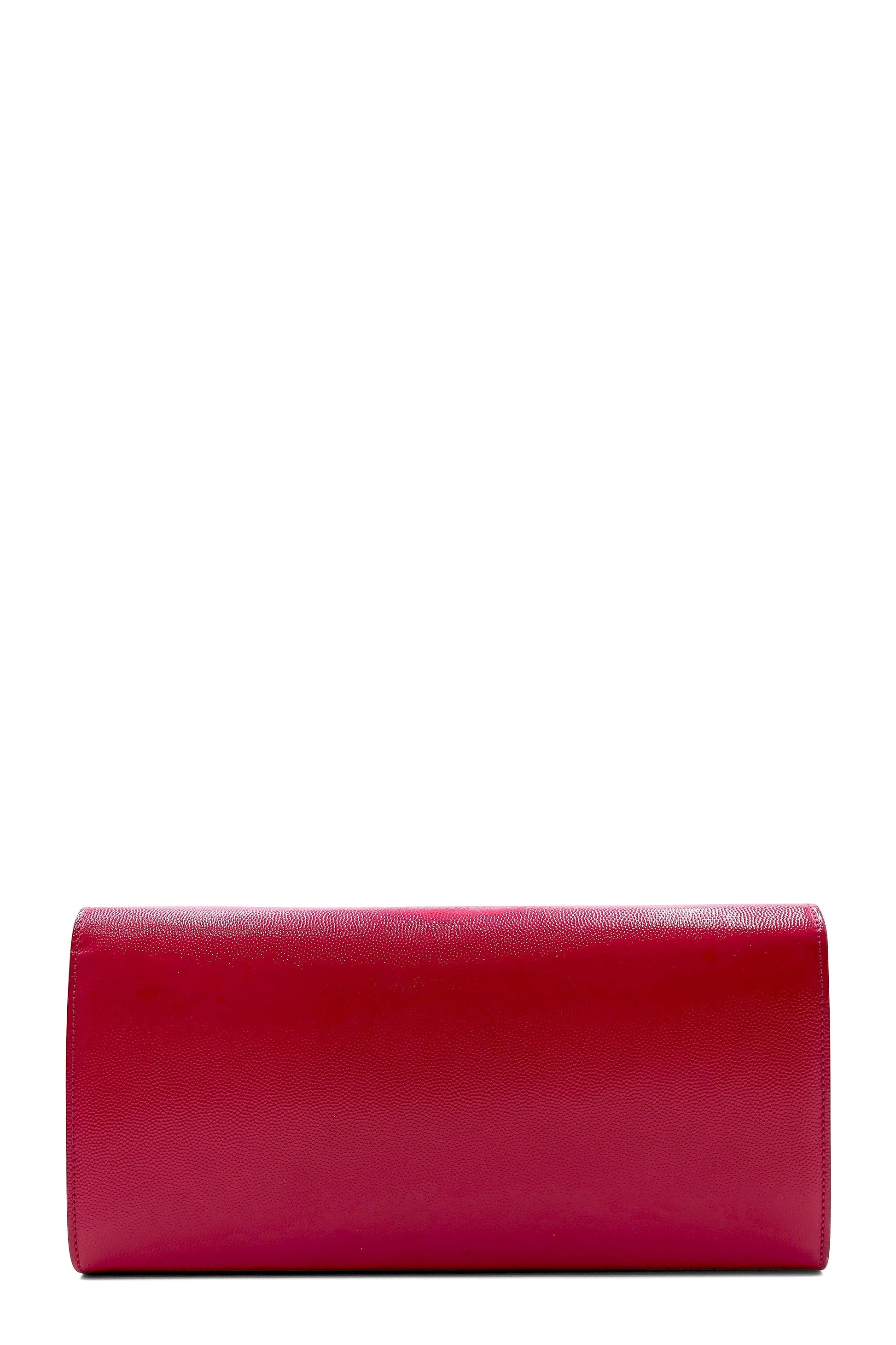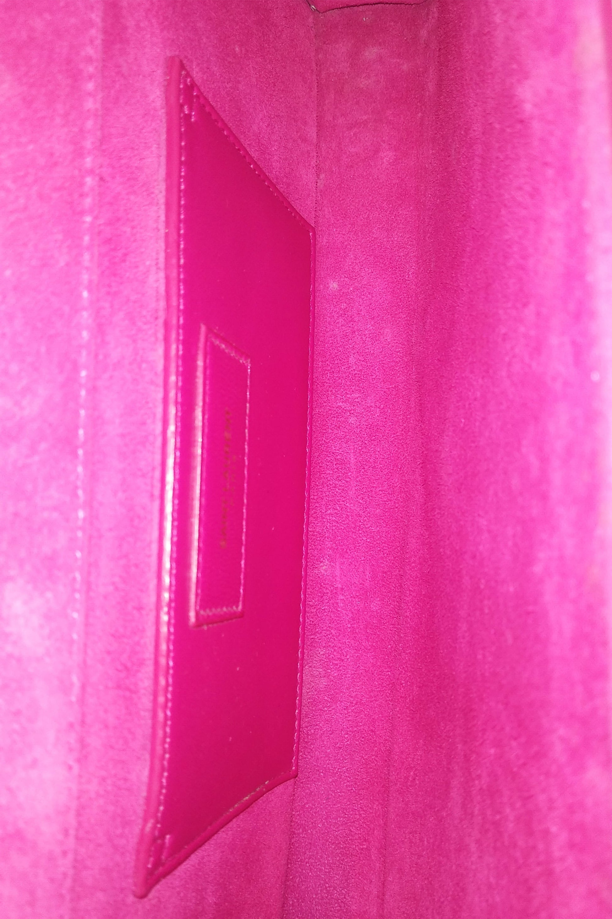 his is an SAINT LAURENT Grain De Poudre Classic Monogram Kate Clutch Lipstick in Fuchsia. This chic clutch is crafted of calfskin leather in bright pink.The front flap features a prominent gold classic YSL symbol which unsnaps to a black fabric interior with a small flat pocket.