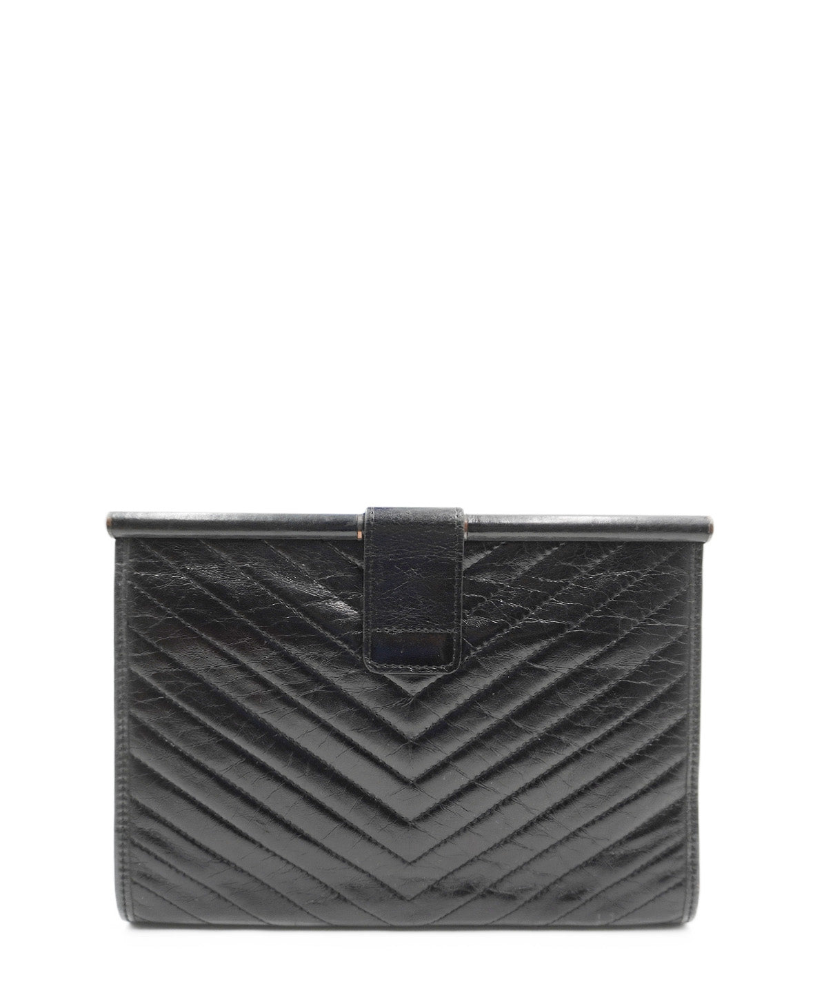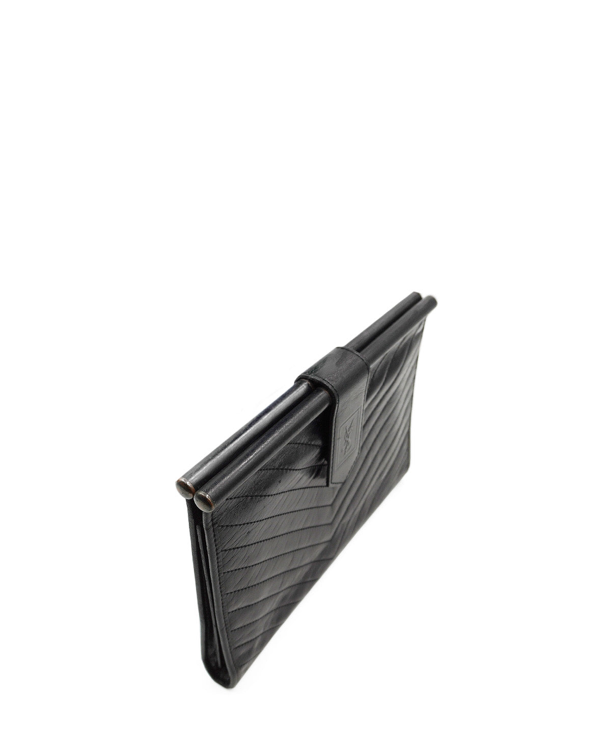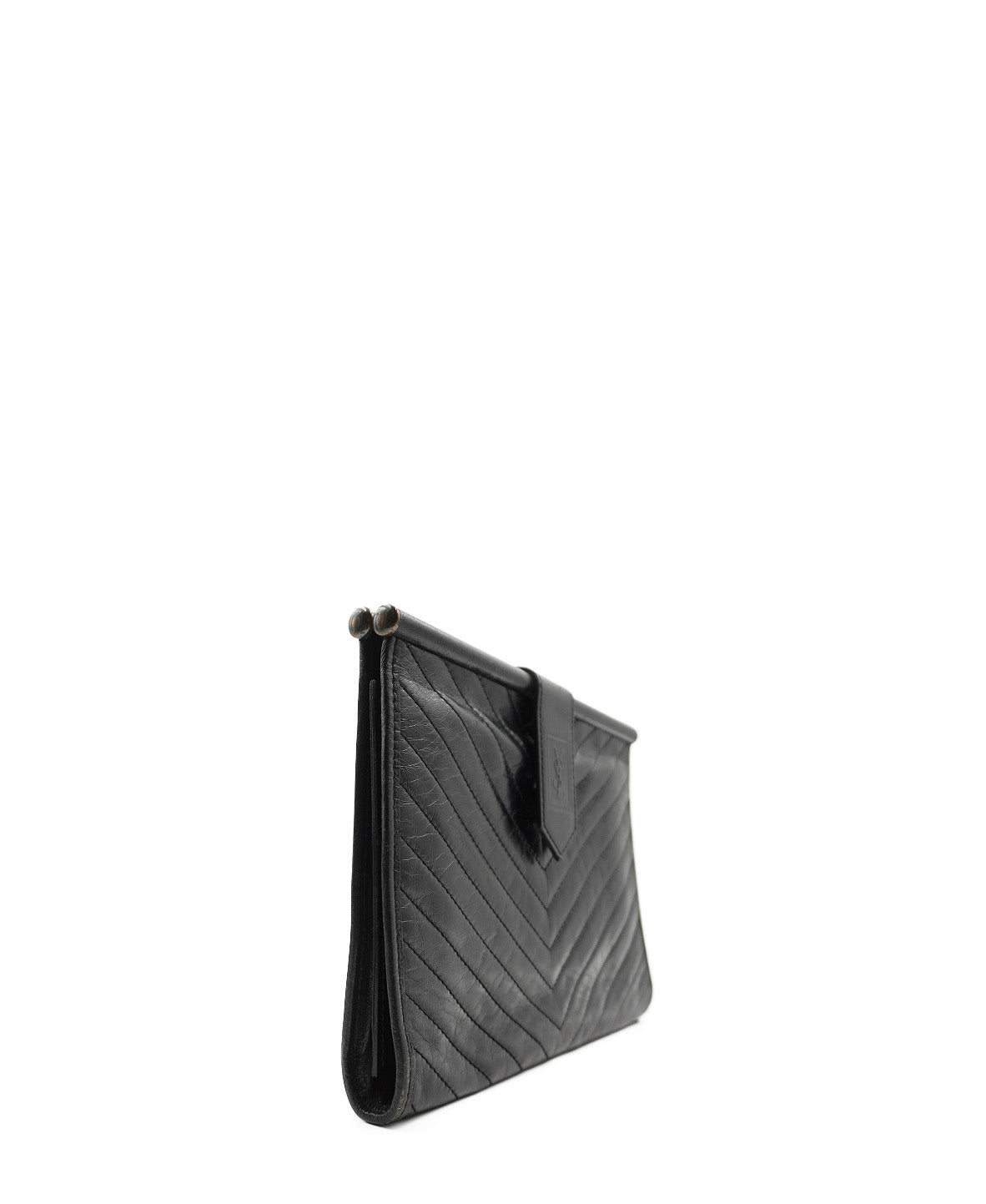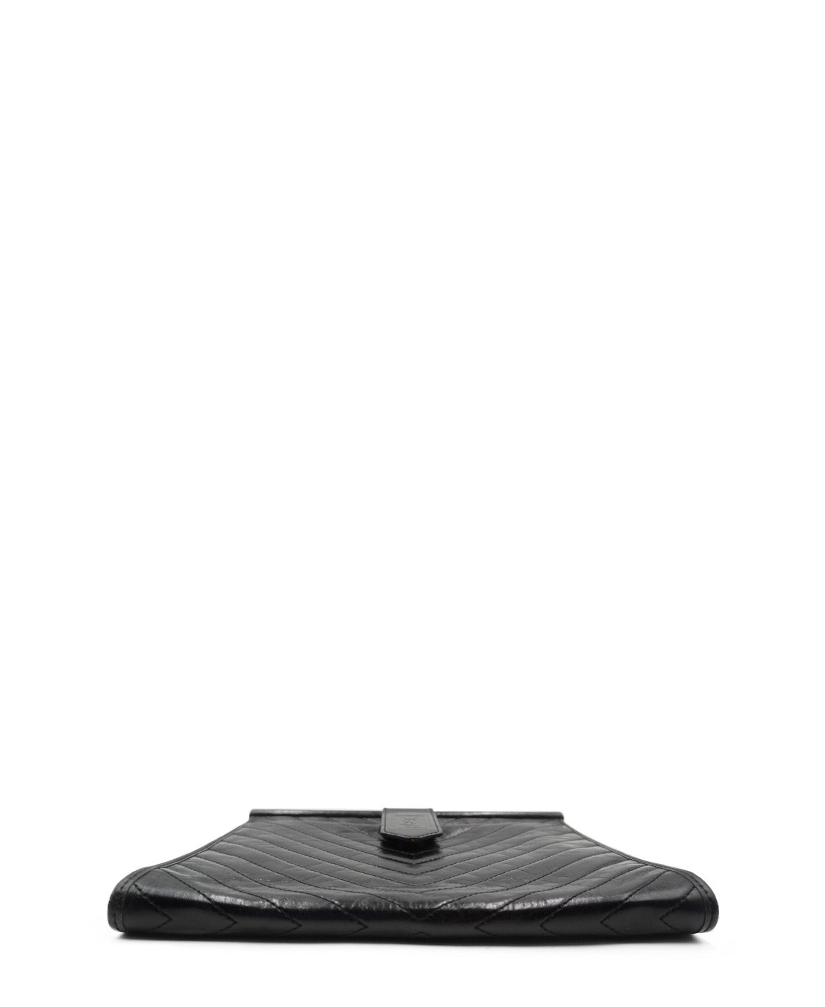 SAINT LAURENT Leather Clutch Black. This chic clutch bag features a quilted leather body, a top strap with a magnetic snap button closure, and interior zip and slip pockets. Great for daily use or night out.