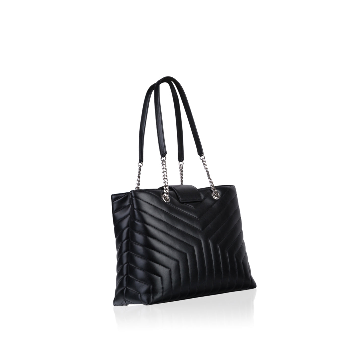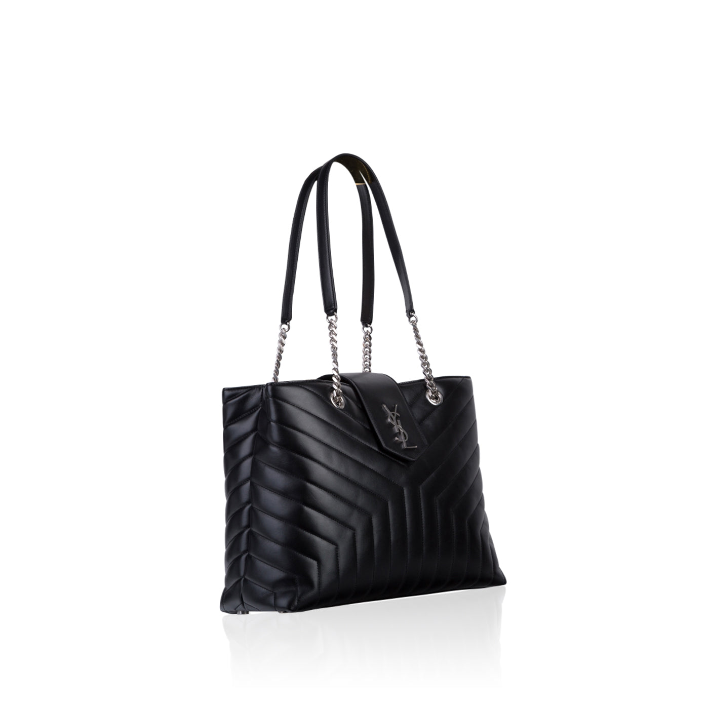Carefully crafted from smooth leather with a matelassé design, the LouLou shopping tote is the newest addition to the LouLou collection. Fans of this signature line can now carry their whole worlds with them everywhere they go by throwing whatever they may need throughout the day inside the spacious interior. With its classic, prominent YSL logo embossed on the closing strap, this is a true must-have for any Saint Laurent lover. The LouLou shopping tote is sleek, sophisticated and stylish - exuding the perfect mix of elegance and edginess. The perfect bag for any woman with a love for luxury and high fashion!