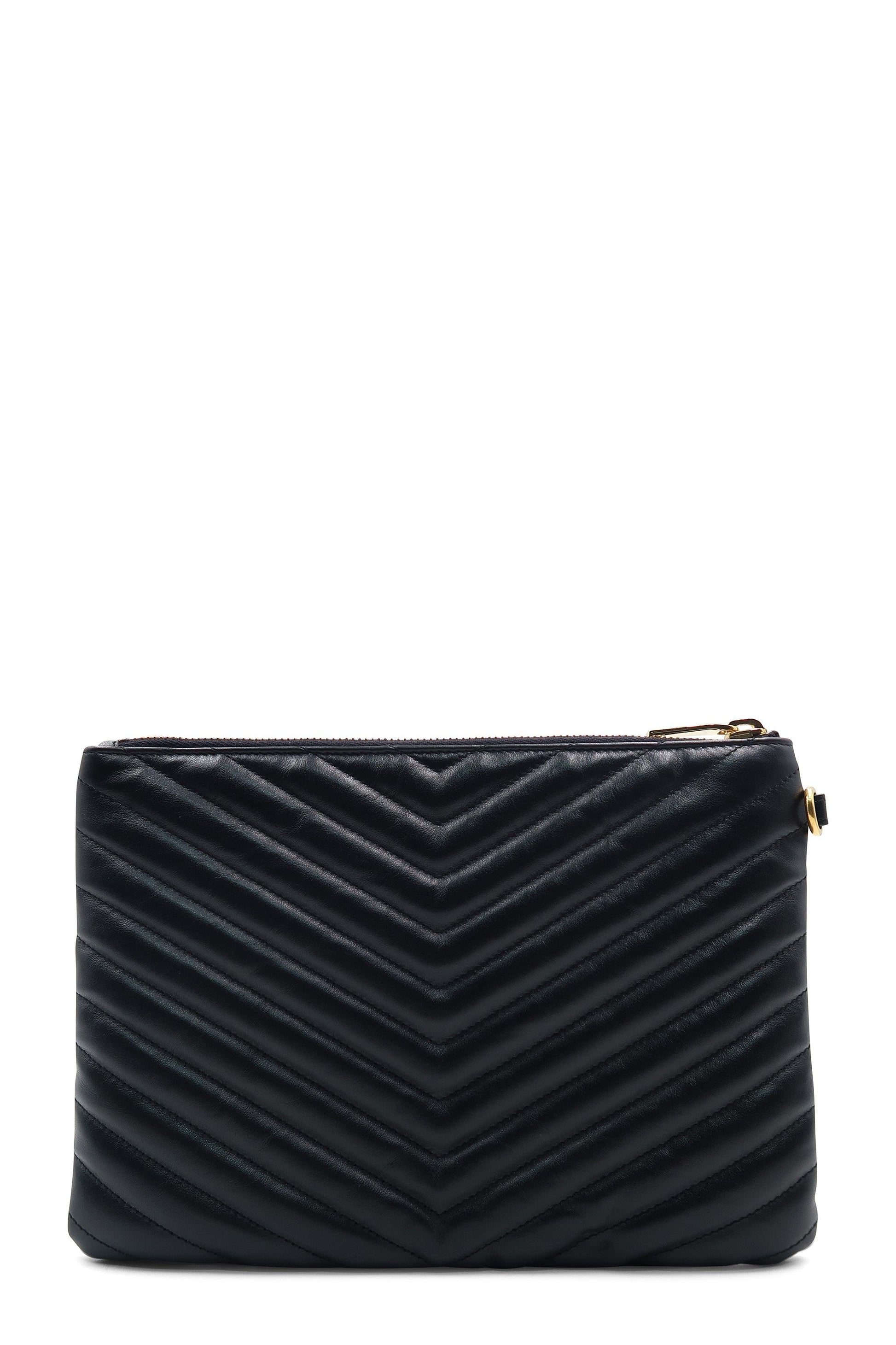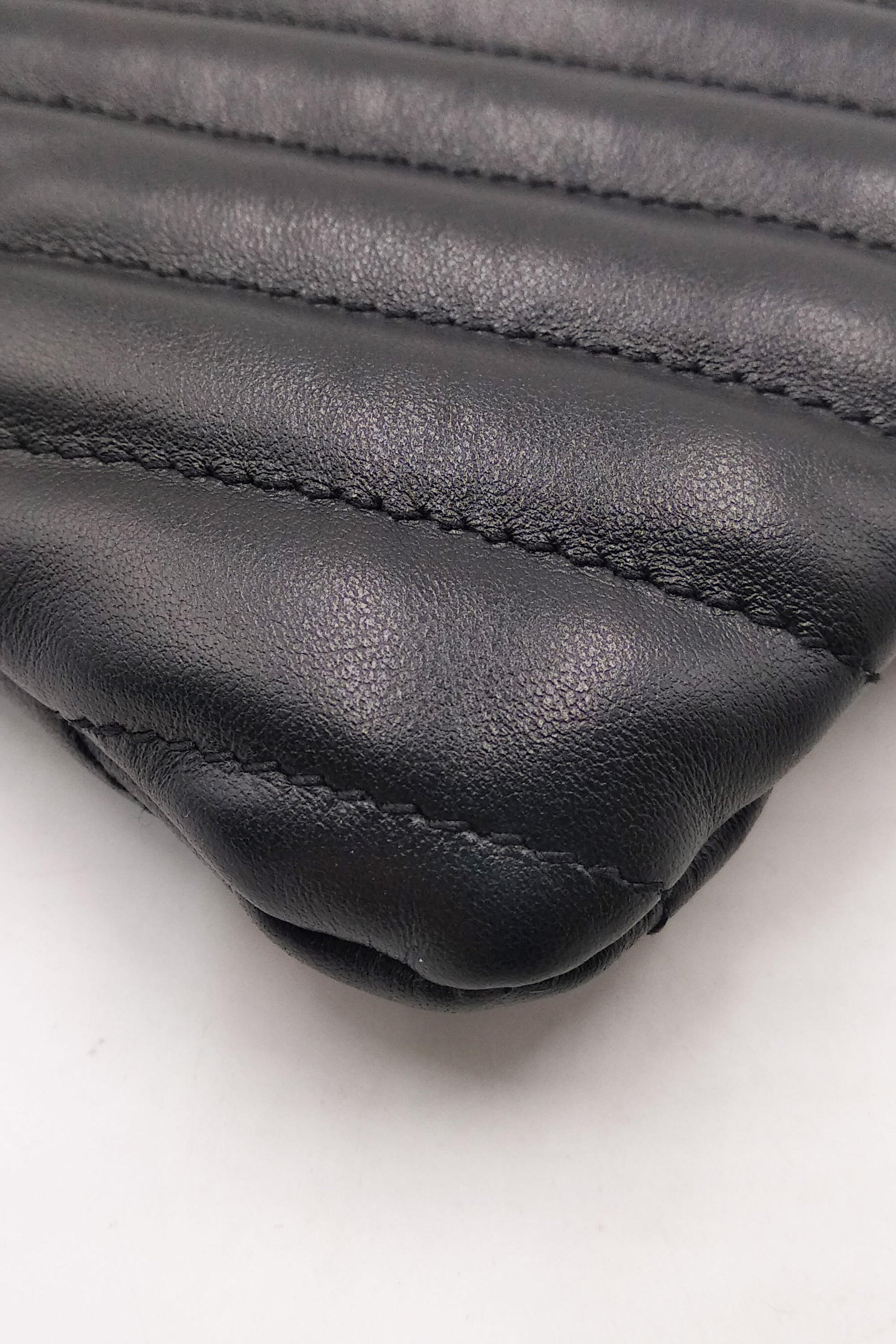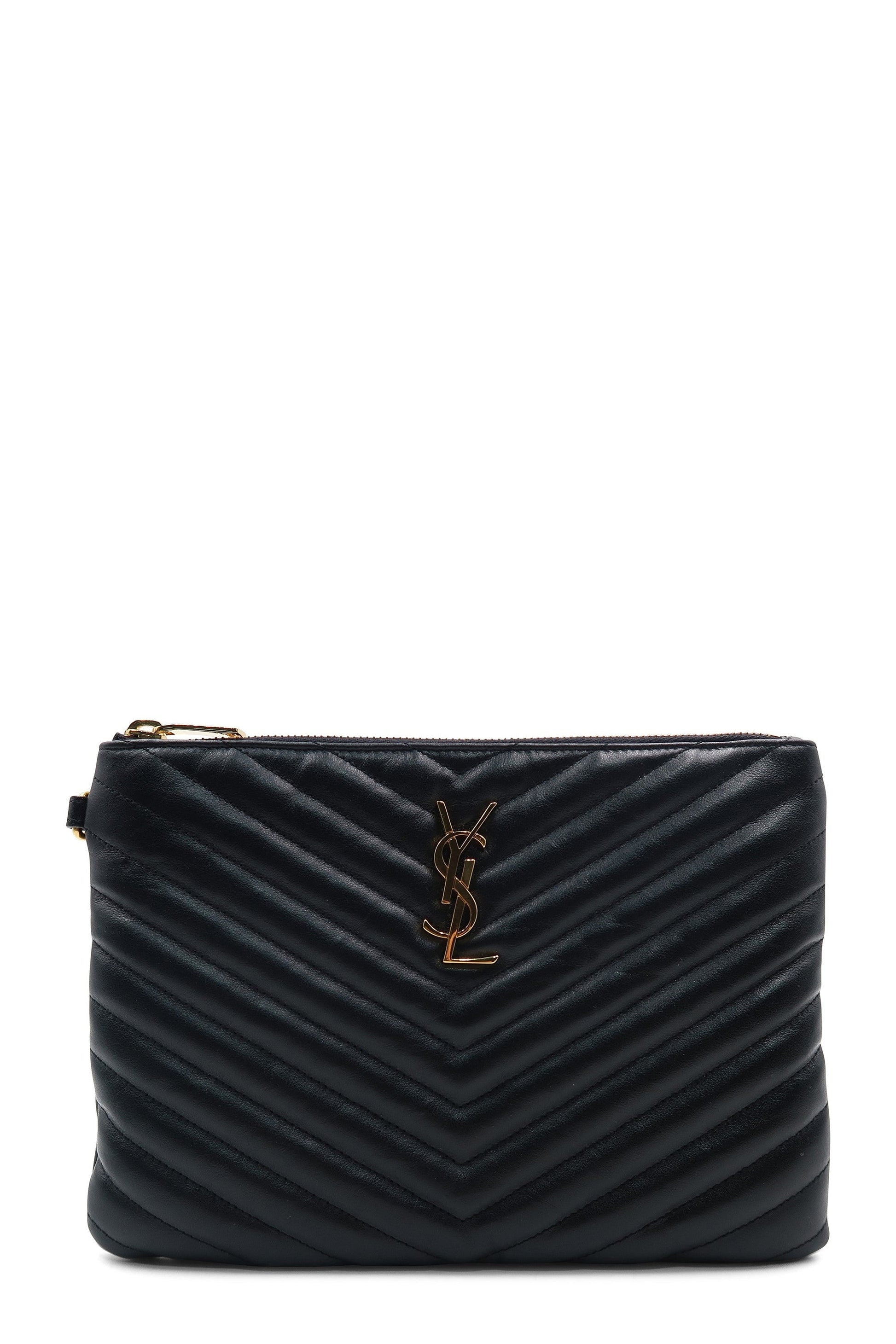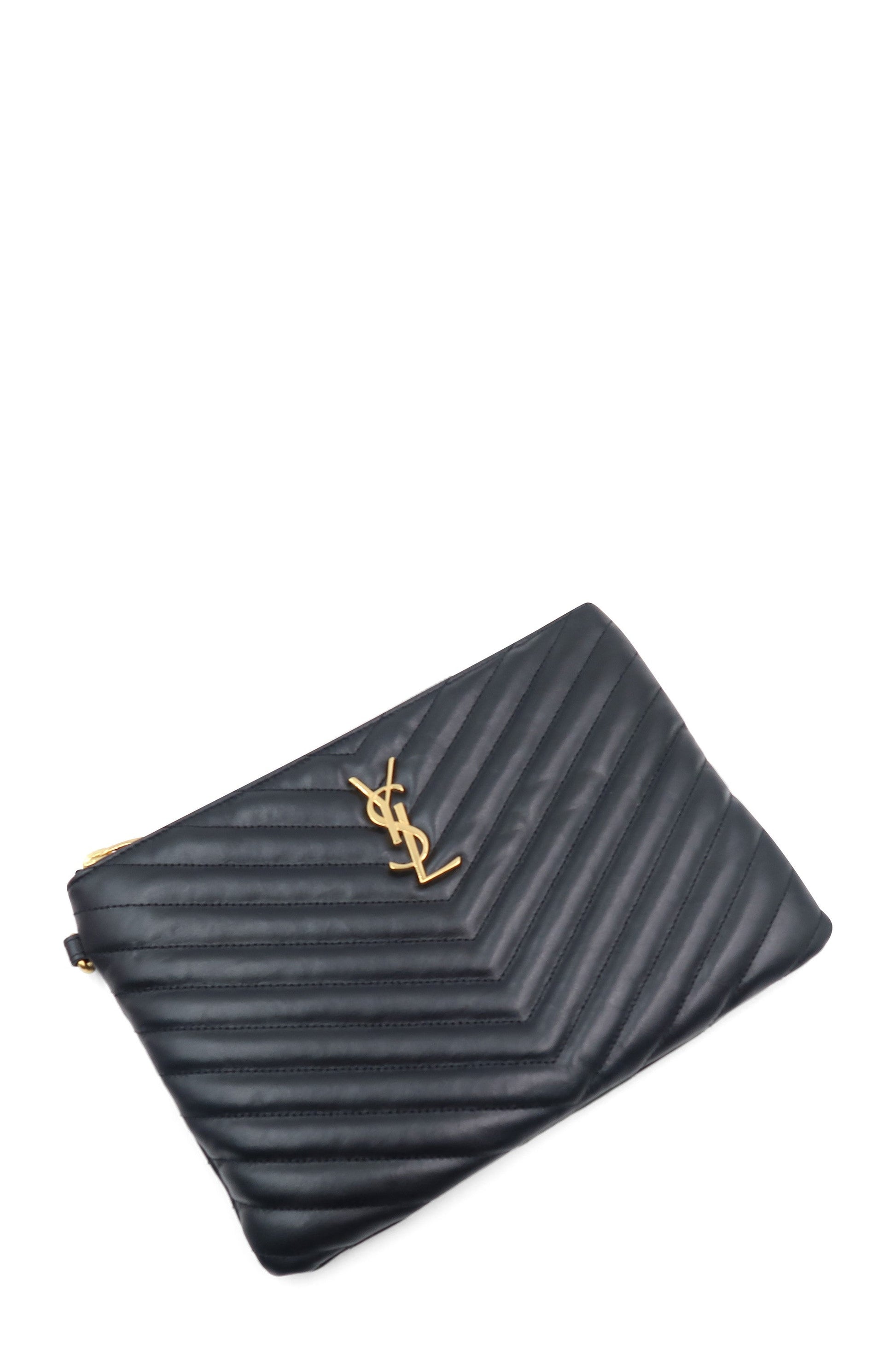 This Yves Saint Laurent clutch is an instant classic. The Monogram pouch wristlet features chevron Matelassé quilted leather with a raised gold-tone YSL monogram on the front. A detachable wristlet strap sits on the side. The interior is the perfect size to fit you phone, lipstick, and cash on a night out.