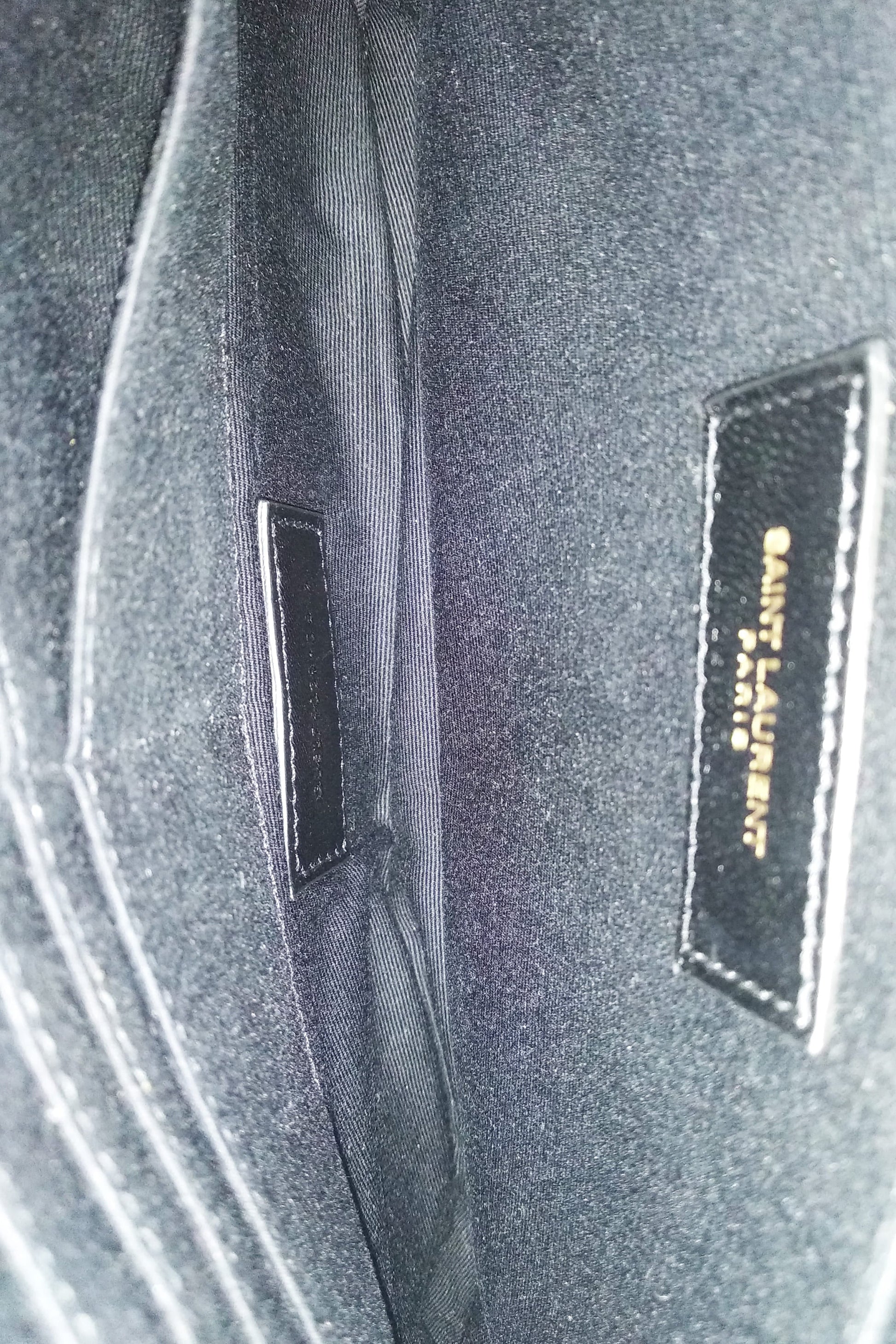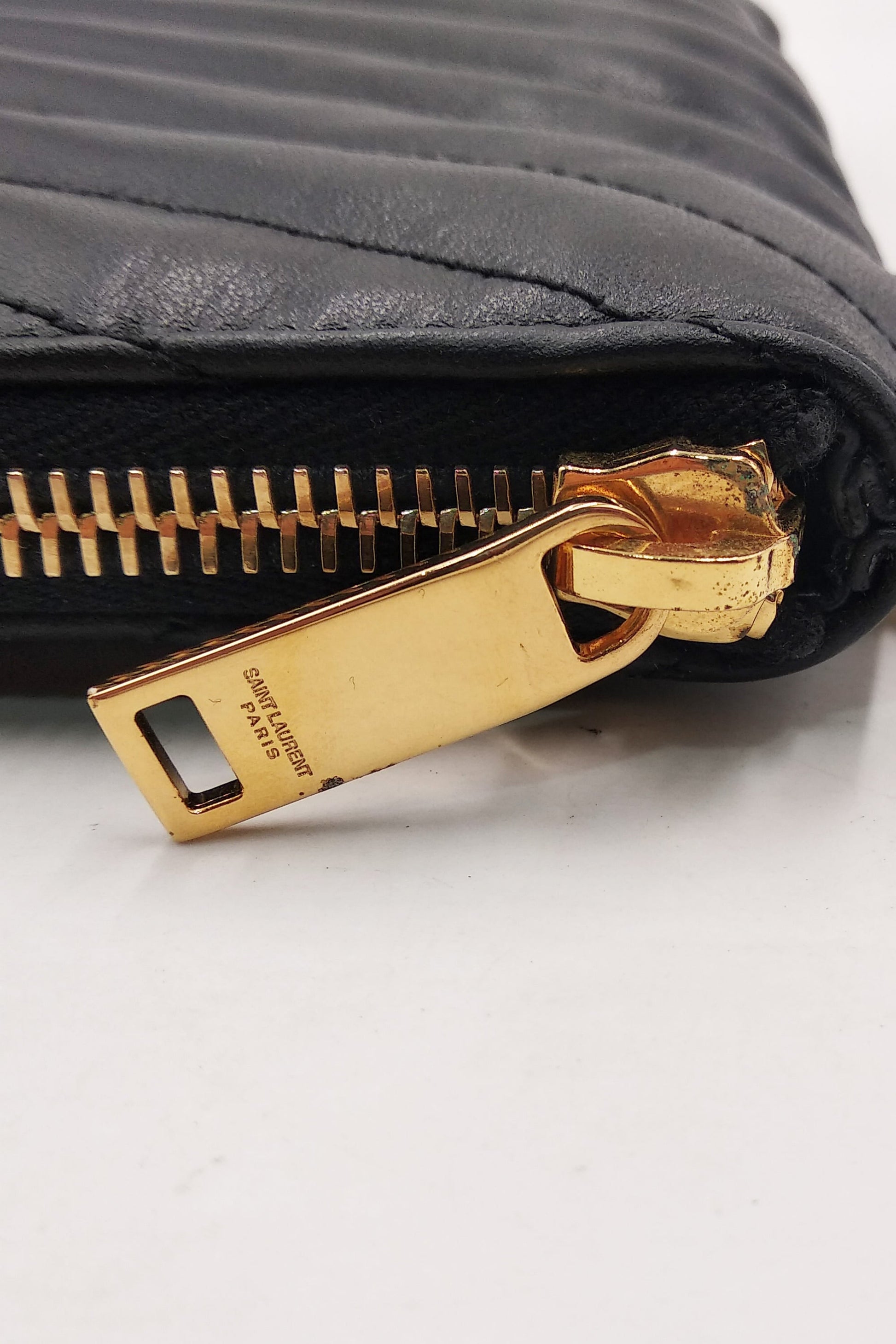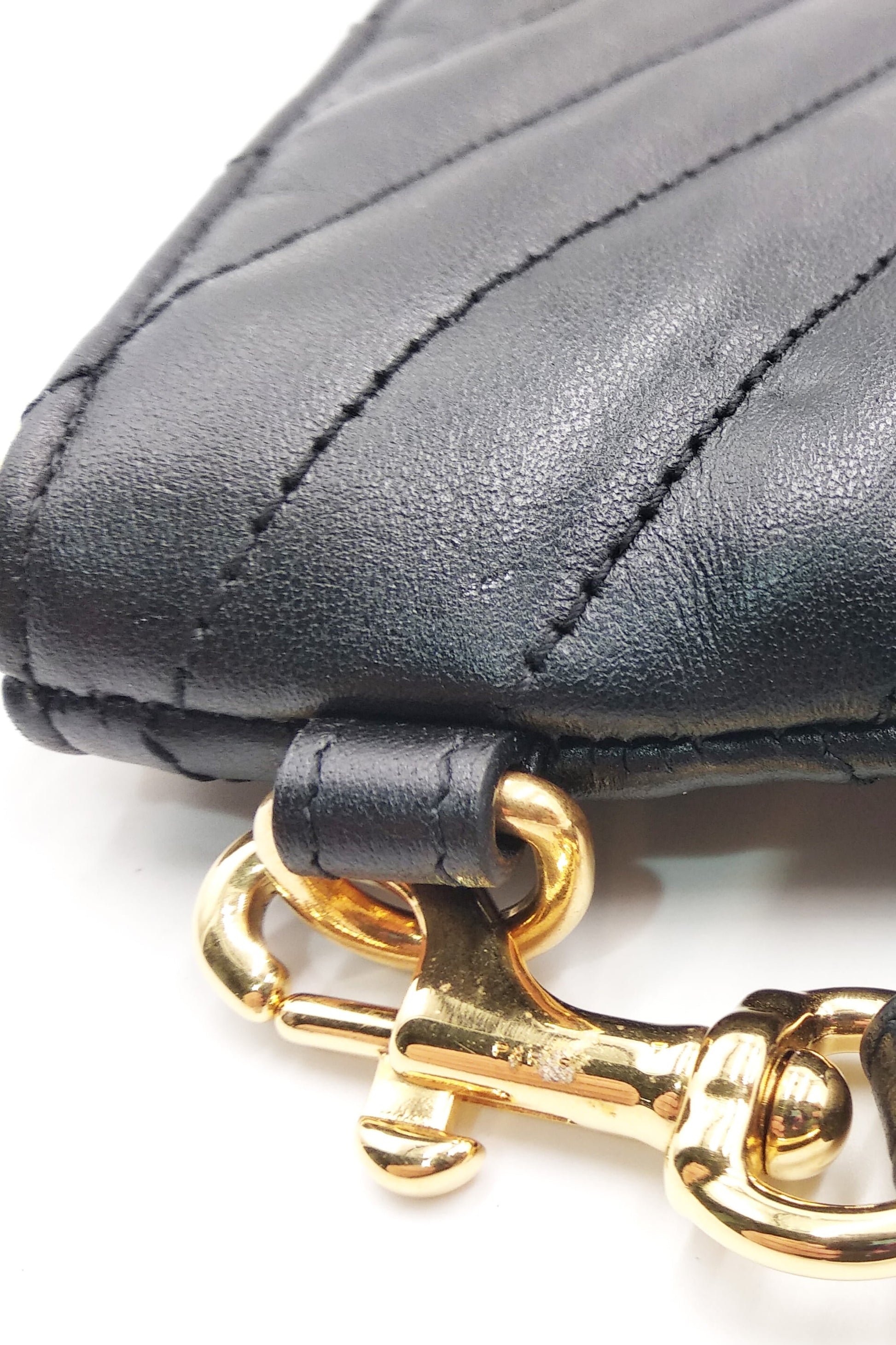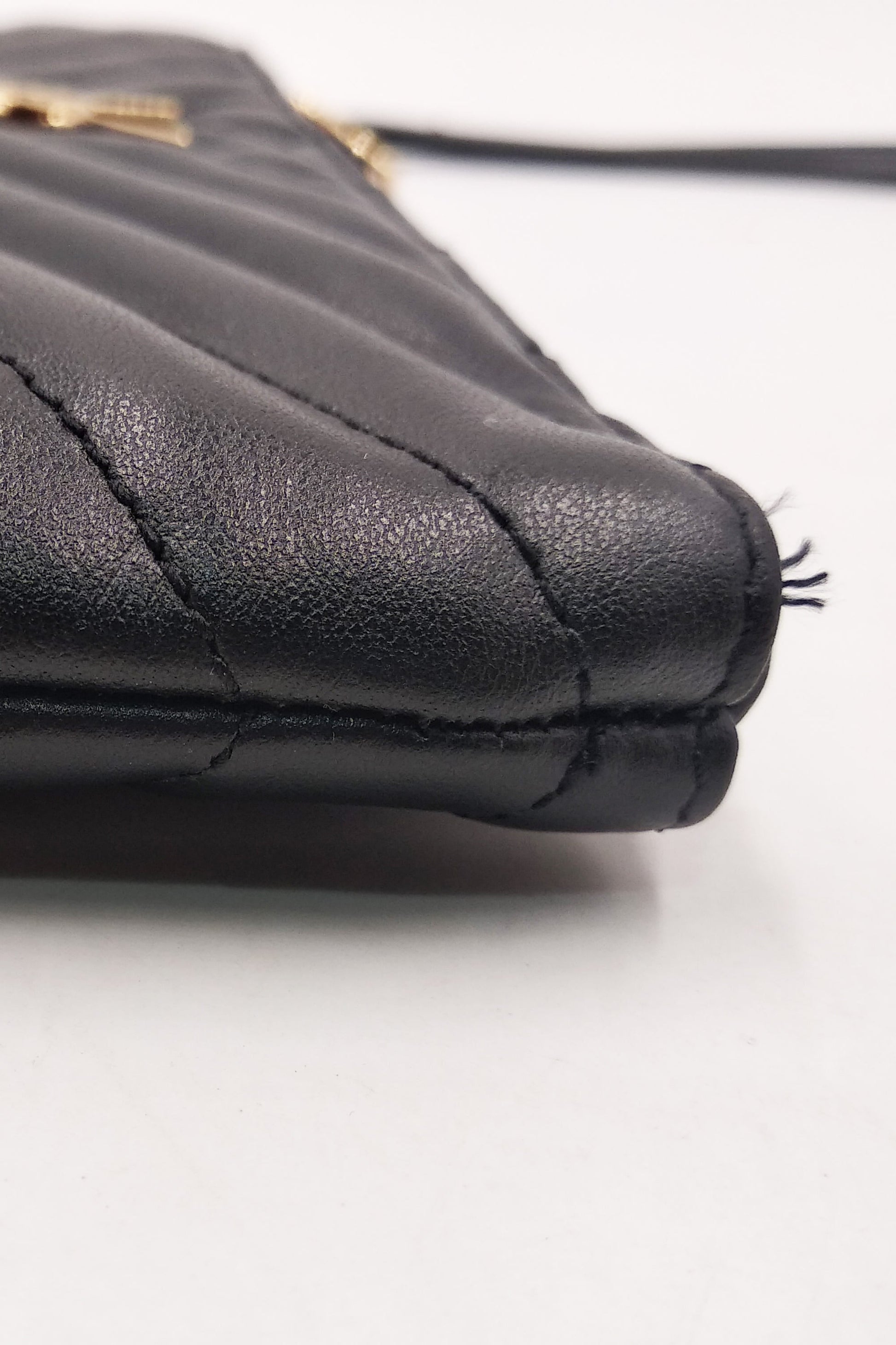 This Yves Saint Laurent clutch is an instant classic. The Monogram pouch wristlet features chevron Matelassé quilted leather with a raised gold-tone YSL monogram on the front. A detachable wristlet strap sits on the side. The interior is the perfect size to fit you phone, lipstick, and cash on a night out.
