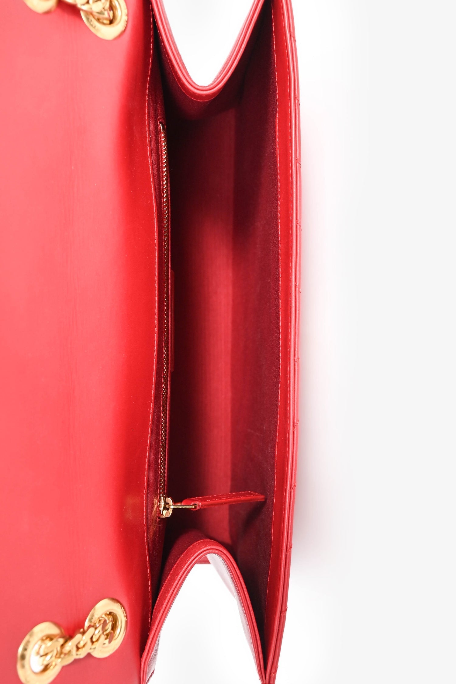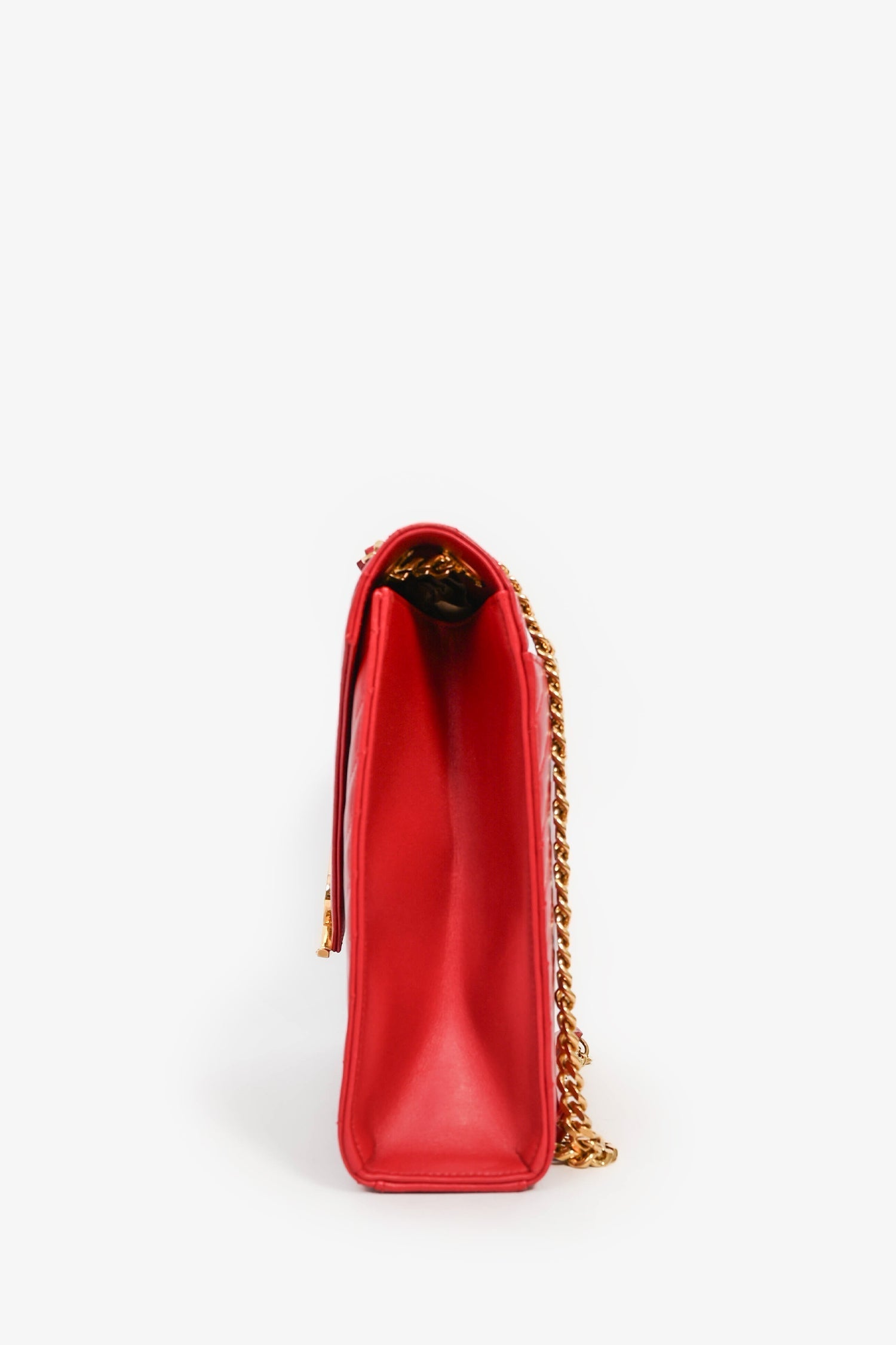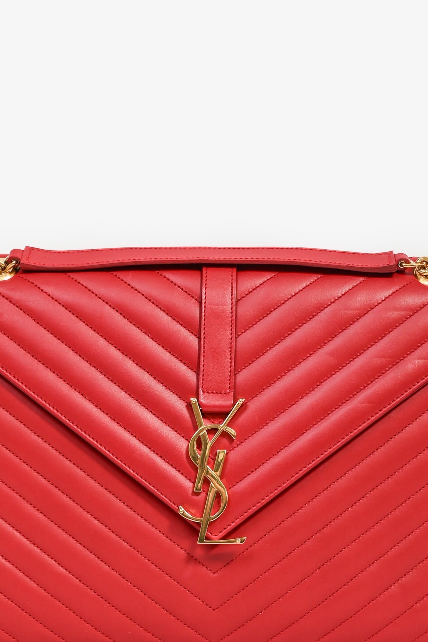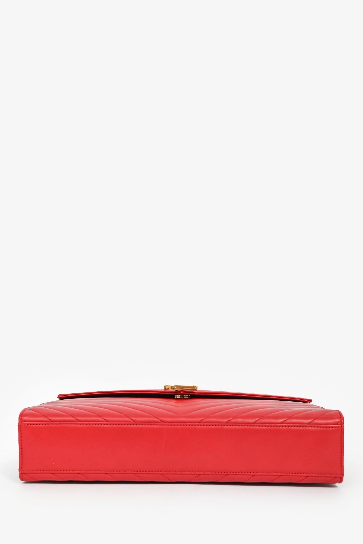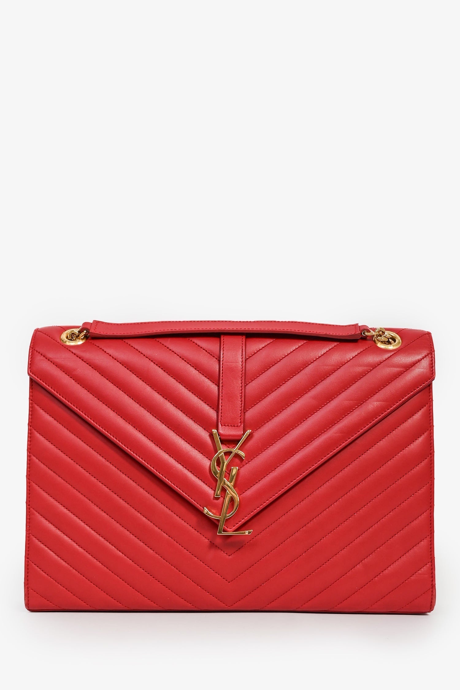 Saint Laurent Red Chevron Leather Envelope Large Chain Shoulder Bag. Front fold-over flap with magnetic closure. Slide-around chain strap. Exterior rear slip pocket. Single compartment with a wall zip pocket. Tonal textile lining. Gold-tone hardware. Tonal stitching.