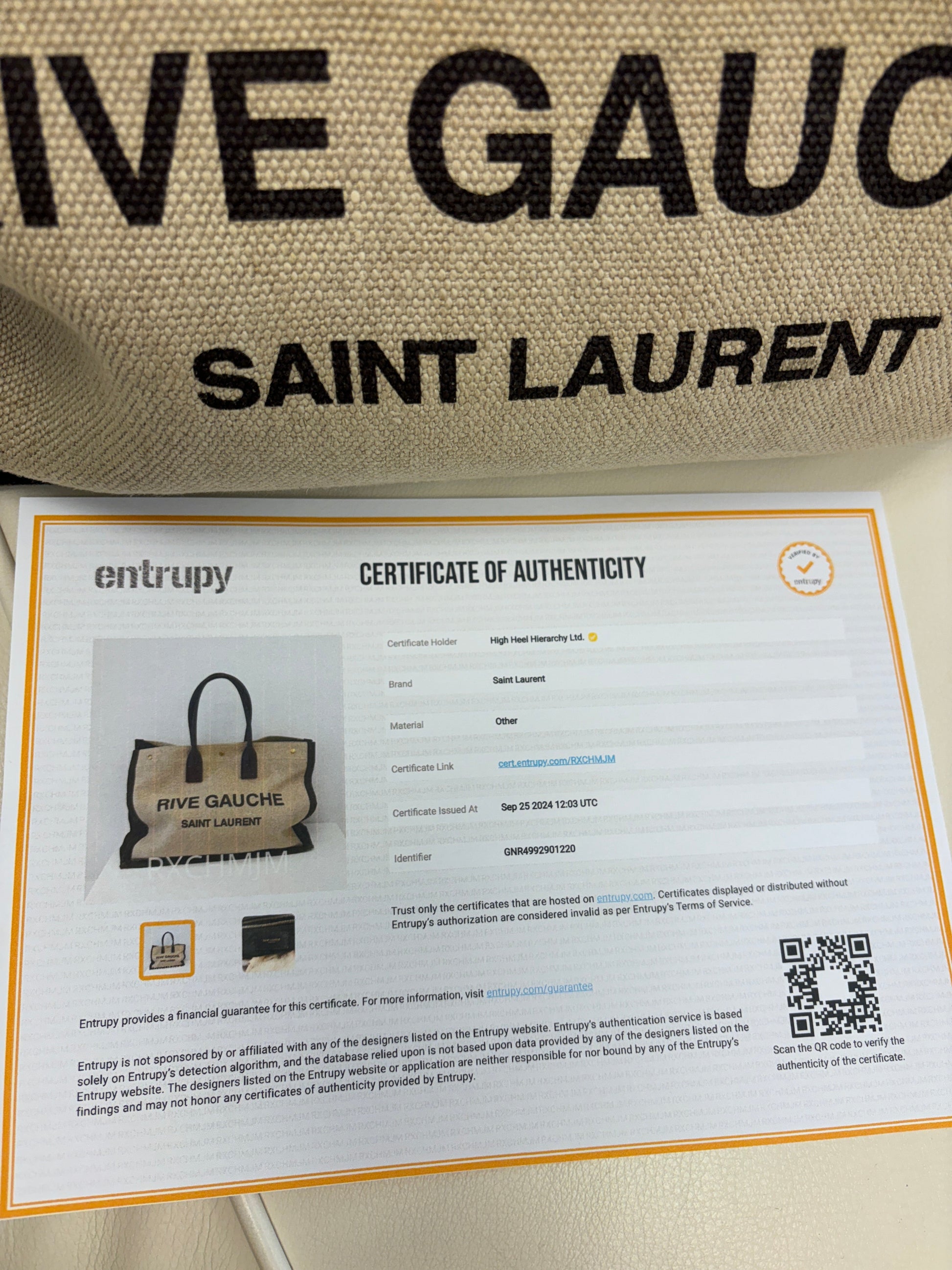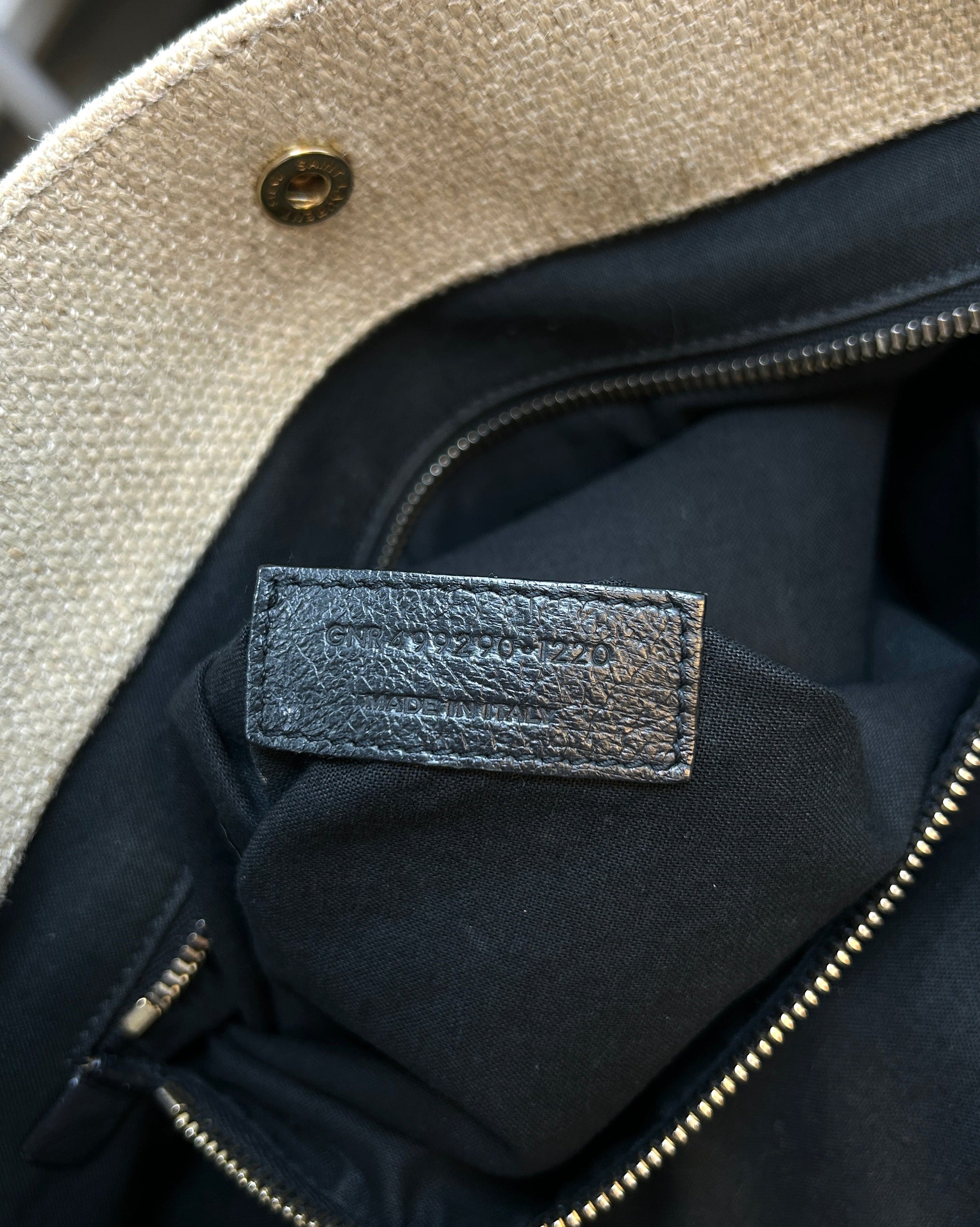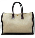 - Beige and dark brown canvas tote bag featuring two rolled leather top handles, gold tone snap button closure, the bag is printed with 'Rive Gauche', the Parisian cultural hub where founder Yves Saint Laurent met many of his muses in the '60s