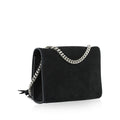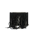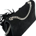 The Saint Laurent Classic Monogram Fringe Flap Crossbody Bag Suede Small has an edgy, boho chic design. Perfect for the most daring fashionistas. The petite envelope-style flap bag crafted in black suede features a long silver chain-link strap, cascading suede fringes, signature YSL logo and silver-tone hardware. Its magnetic snap closure opens to a black fabric-lined interior with slip pocket storing bare essentials.