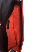 Salvatore Ferragamo black leather clutch with tonal stitching, orange interior lining and magnetic snap closure. Shows signs of wear.