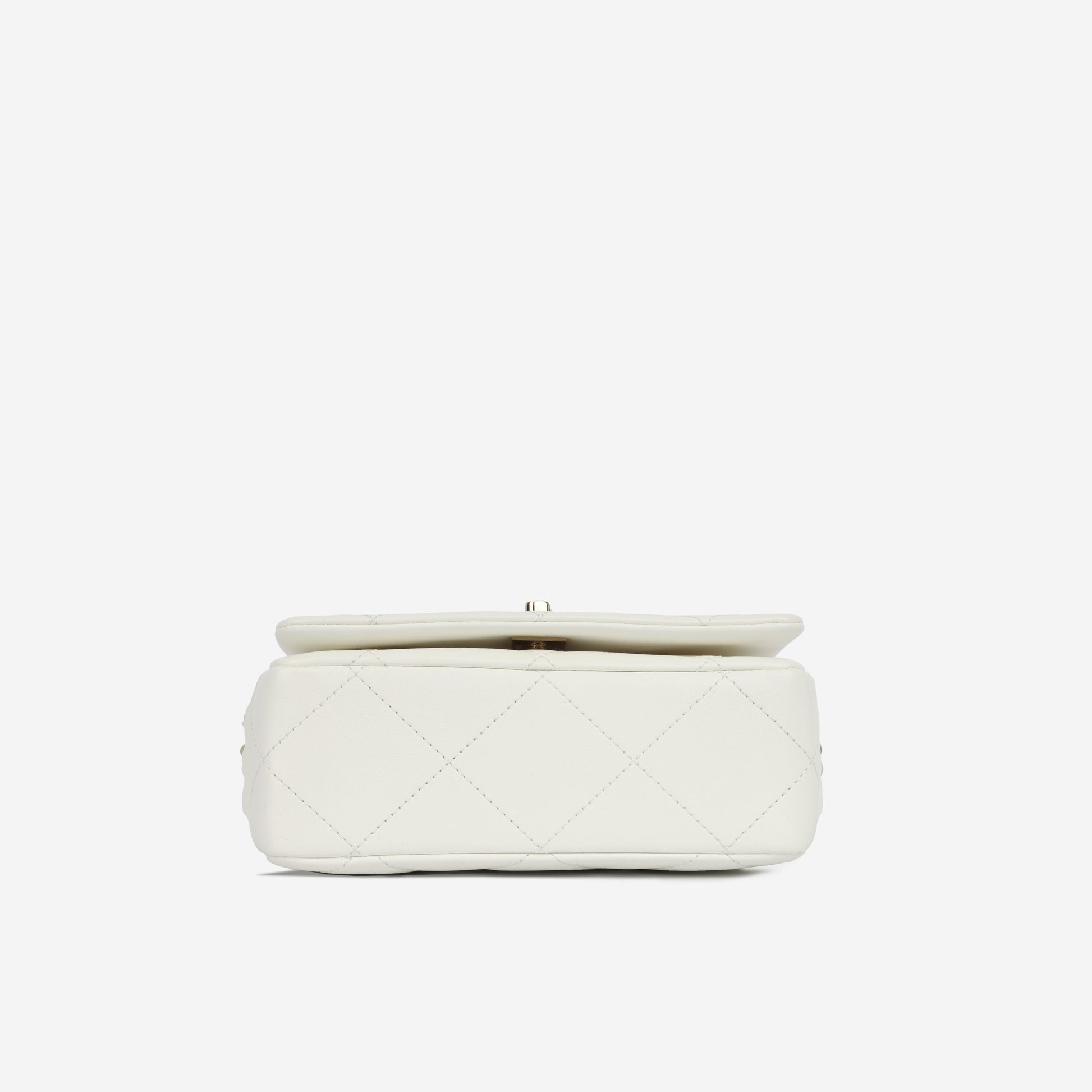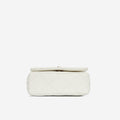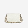 Meticulously crafted from luxurious white lambskin leather, adorned with exquisite champagne gold tone hardware. This classic piece is a testament to timeless style and sophistication. The bag features a short leather and chain strap, adding a touch of versatility to its design. Whether you're attending a formal event or heading out for a casual outing, this bag effortlessly complements any ensemble with its understated yet refined aesthetic.
