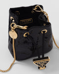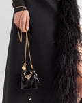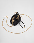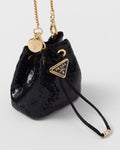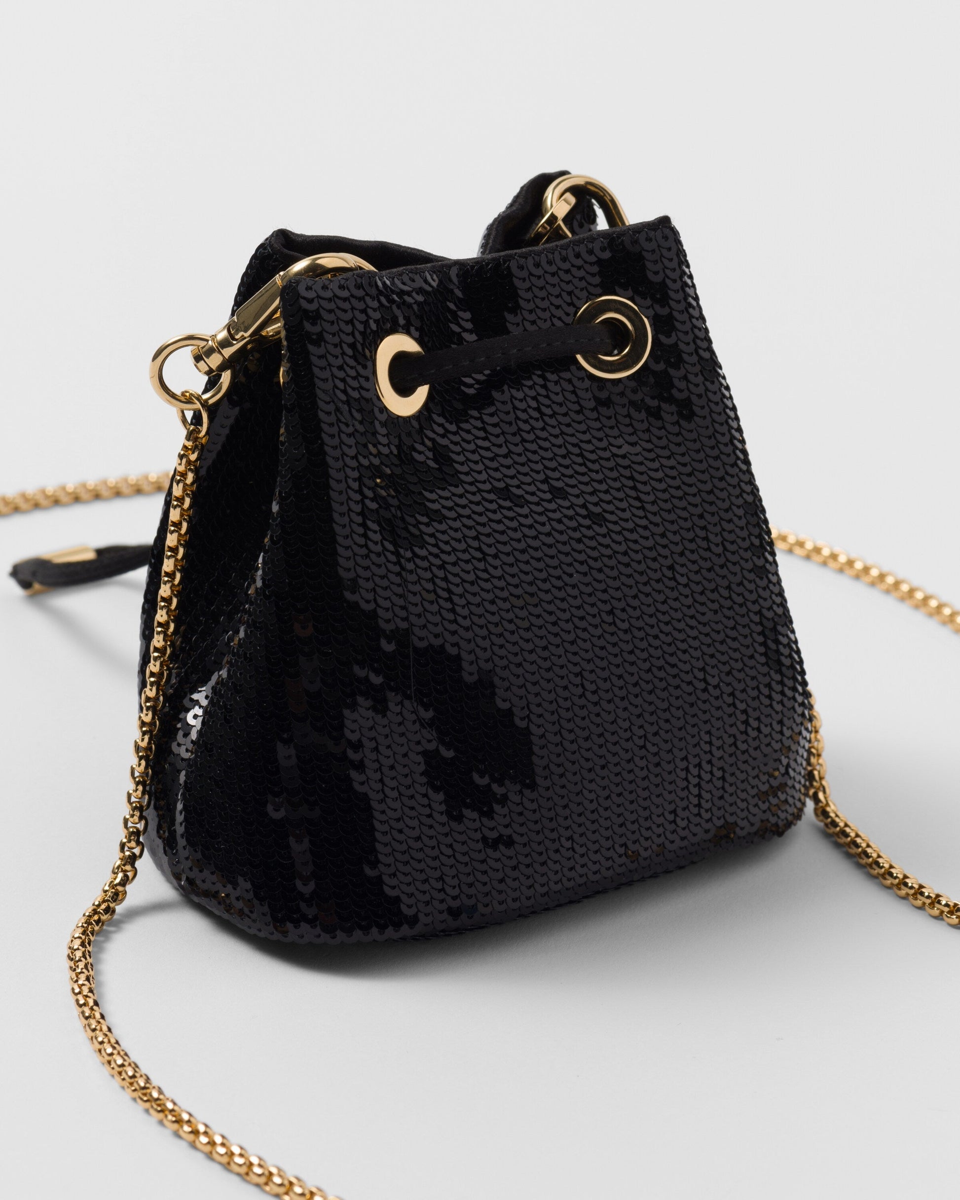 This precious and sophisticated satin mini-pouch covered in sequins plays with elegant, sparkling details. The accessory, which comes with a removable chain shoulder strap, is decorated with the enameled metal triangle logo that accents the drawstring closure