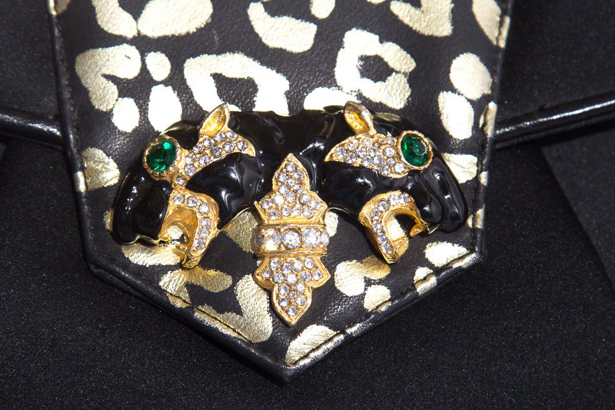 Sharif Black Satin Leopard Rhinestone Evening Clutch. This item is in good condition.