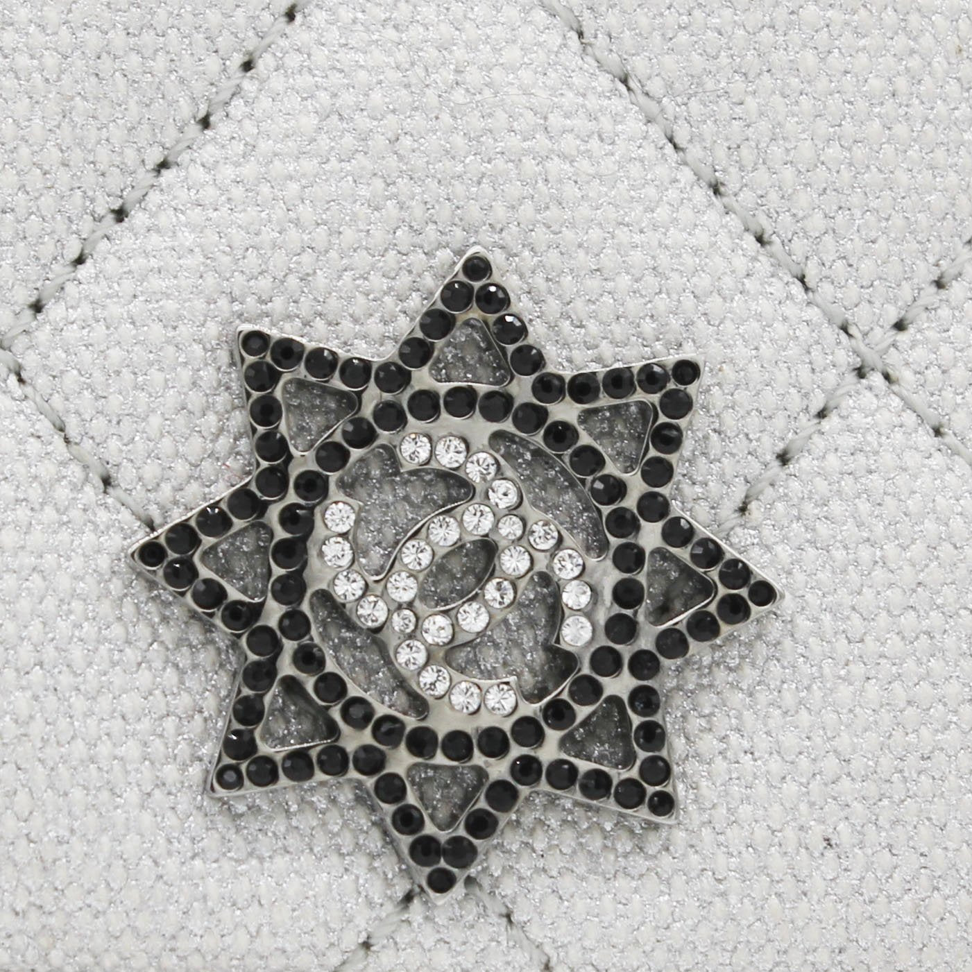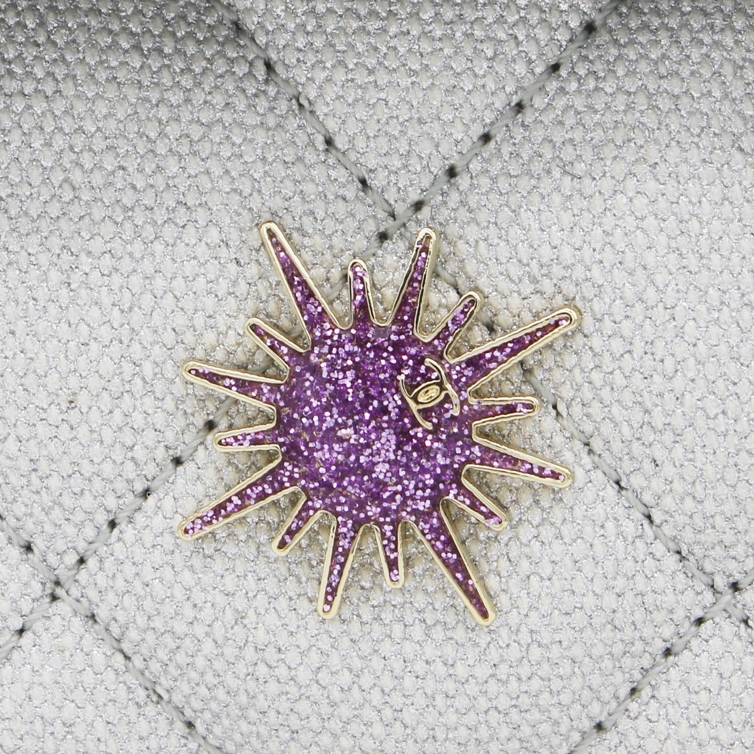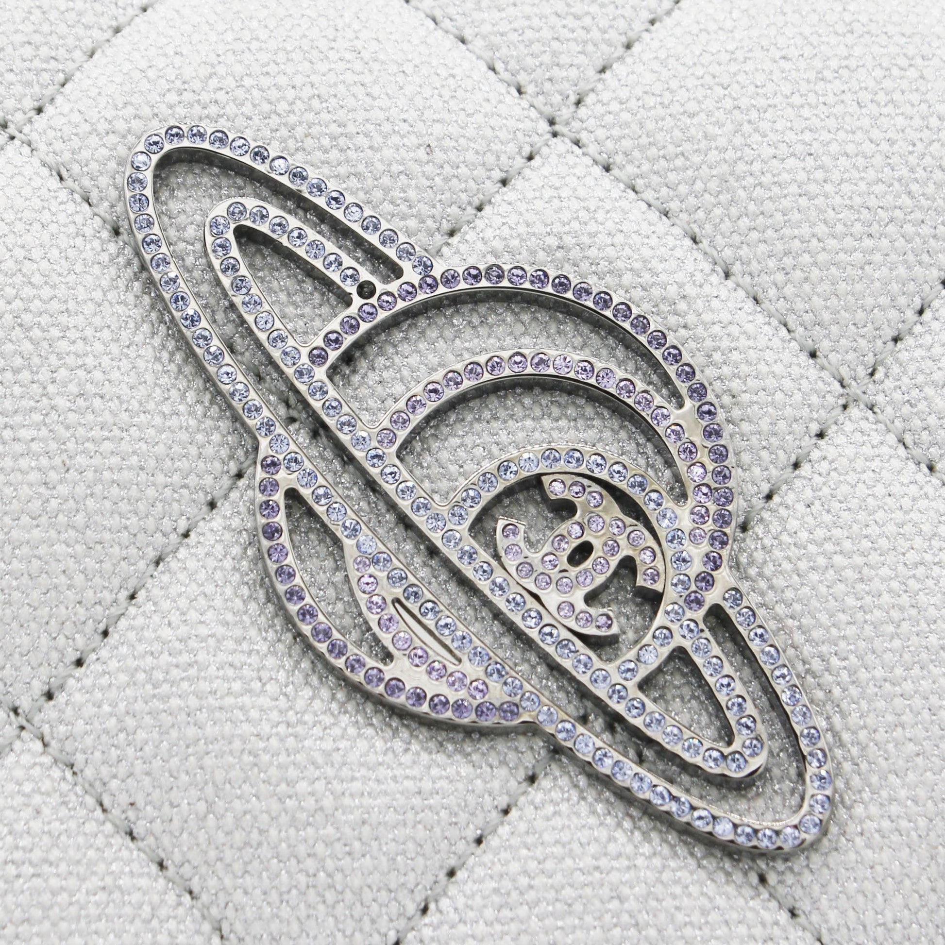 | Go glam with this gorgeous Limited Edition Chanel 2.55 Reissue Quilted Canvas 227 Space Charms Flap Bag. It is made of durable canvas and features a mademoiselle turnlock closure and double flap interior. The versatile chain strap can be worn on the shoulder or lengthened to wear with a longer drop. This particular Reissue bag has multicolor crystal Space Charms throughout for an elegant and timeless piece to add to any collection. | Exterior Material: ?Silver canvas exterior with multicolour crystal space charms embellishments and silver chain shoulder strap. Interior Material: Silver leather lining with one main compartment and slip pockets. Accessories: Dust Bag Serial Number: 25026935 Bought Year: 2018 | ![]() |