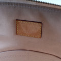 Exterior: The exterior coated canvas is free of any rips or cracks. The corners and leather detail show signs of wear and discoloration.