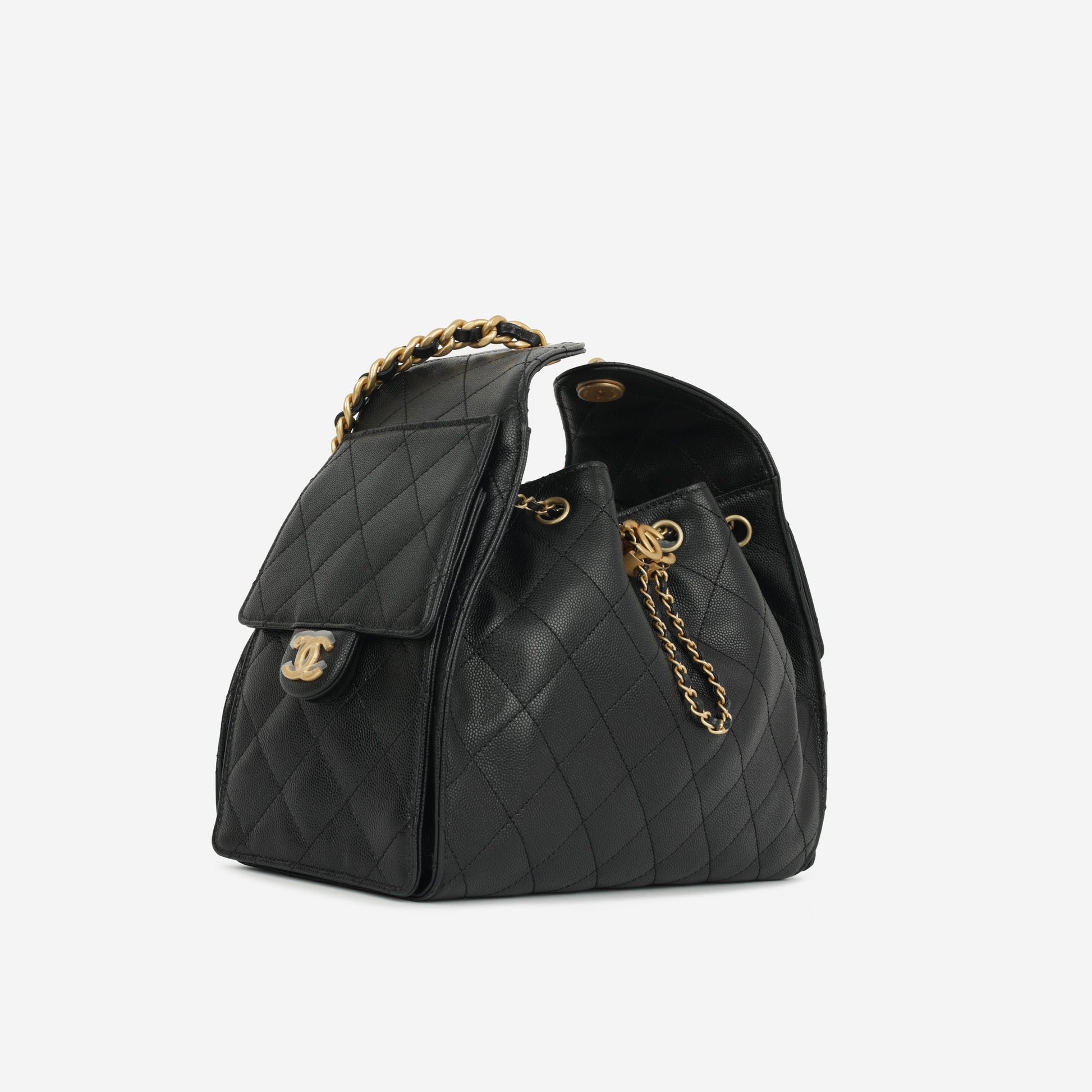 The Chanel 25 Small Handbag combines timeless elegance with practical design. Inspired by the Chanel 22, its relaxed, slouchy shape and sleek trapezoid silhouette are complemented by quilted leather, CC emblems, and a chunky chain strap, adding a vintage touch to this modern piece. The bag features a roomy main compartment and convenient side pockets secured with CC fastenings, while the drawstring closure enhances its bucket-like silhouette for easy access and security.