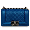 An absolute must-have for any fashion lover with a soft spot for Chanel. The Boy bag is not only an iconic piece that will remain in style forever, but it's the perfect balance between classic elegance and modern edge. Wear this bag with absolutely anything in your wardrobe, from casual jeans and a basic tee to a dressy skirt and blazer - you'll be sure to compliment any look with the Small Boy by your side. Crafted from blue caviar leather and quaint aged silver hardware, this bag is the ideal investment for any modern young woman with a fashion forward sense of style and a love for classic luxury.