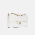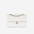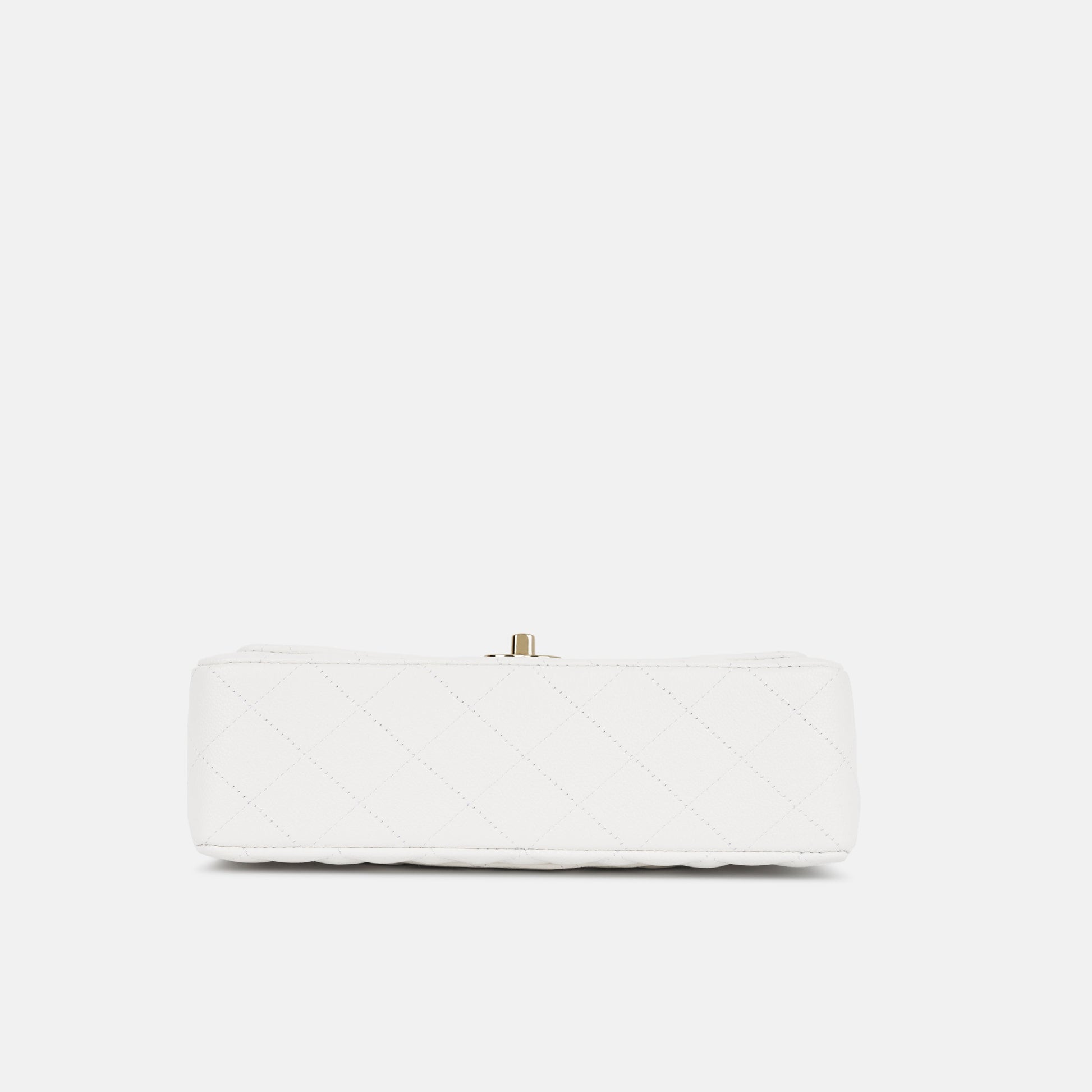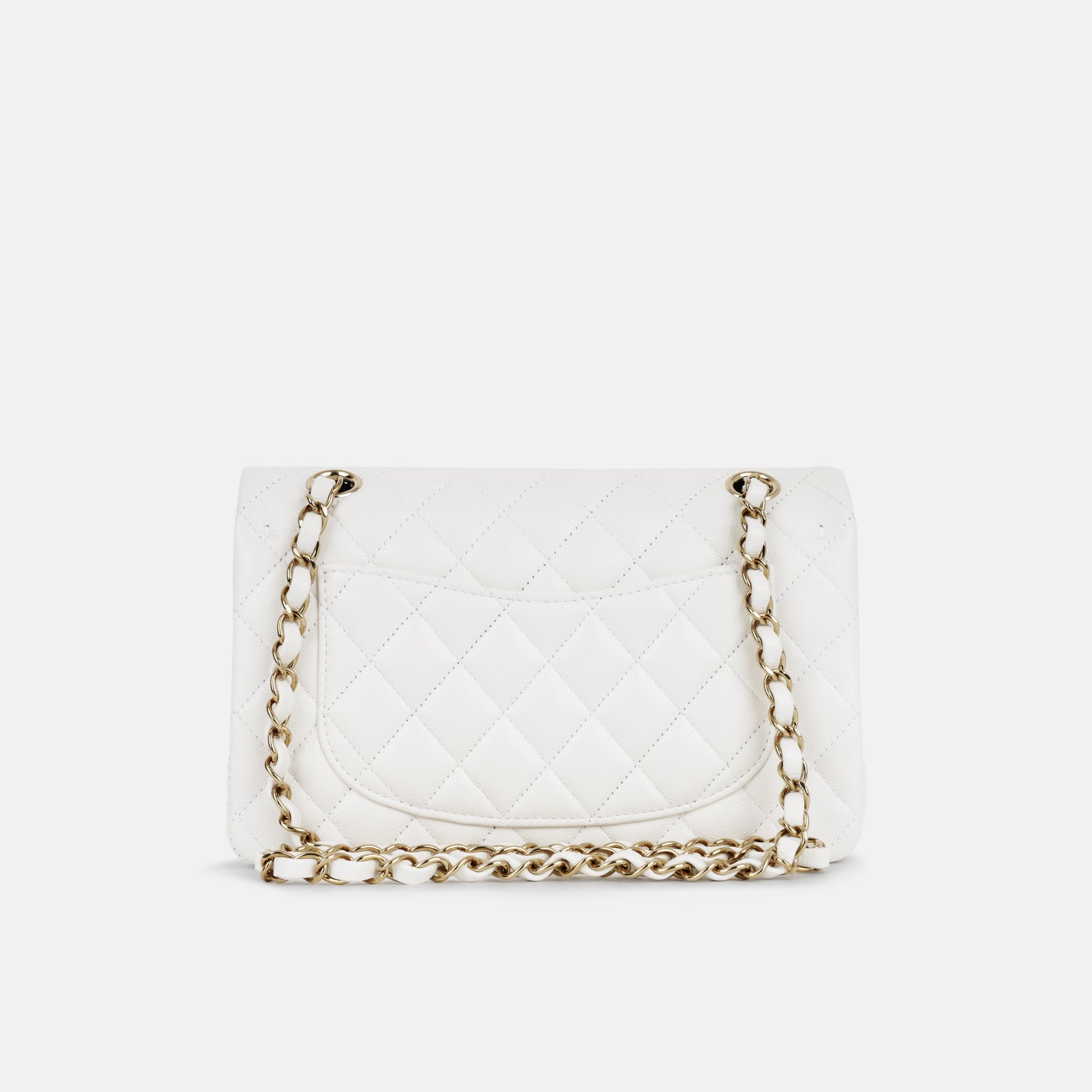 Sleek, refined and effortlessly chic, the Classic Small Flap Bag in embodies Chanel’s non-traditionally feminine aesthetic. One of the most iconic handbags in the history of fashion, this bag is an absolute must-have. Crafted in a white quilted caviar leather with champagne gold hardware; there is nothing more beautiful than this.