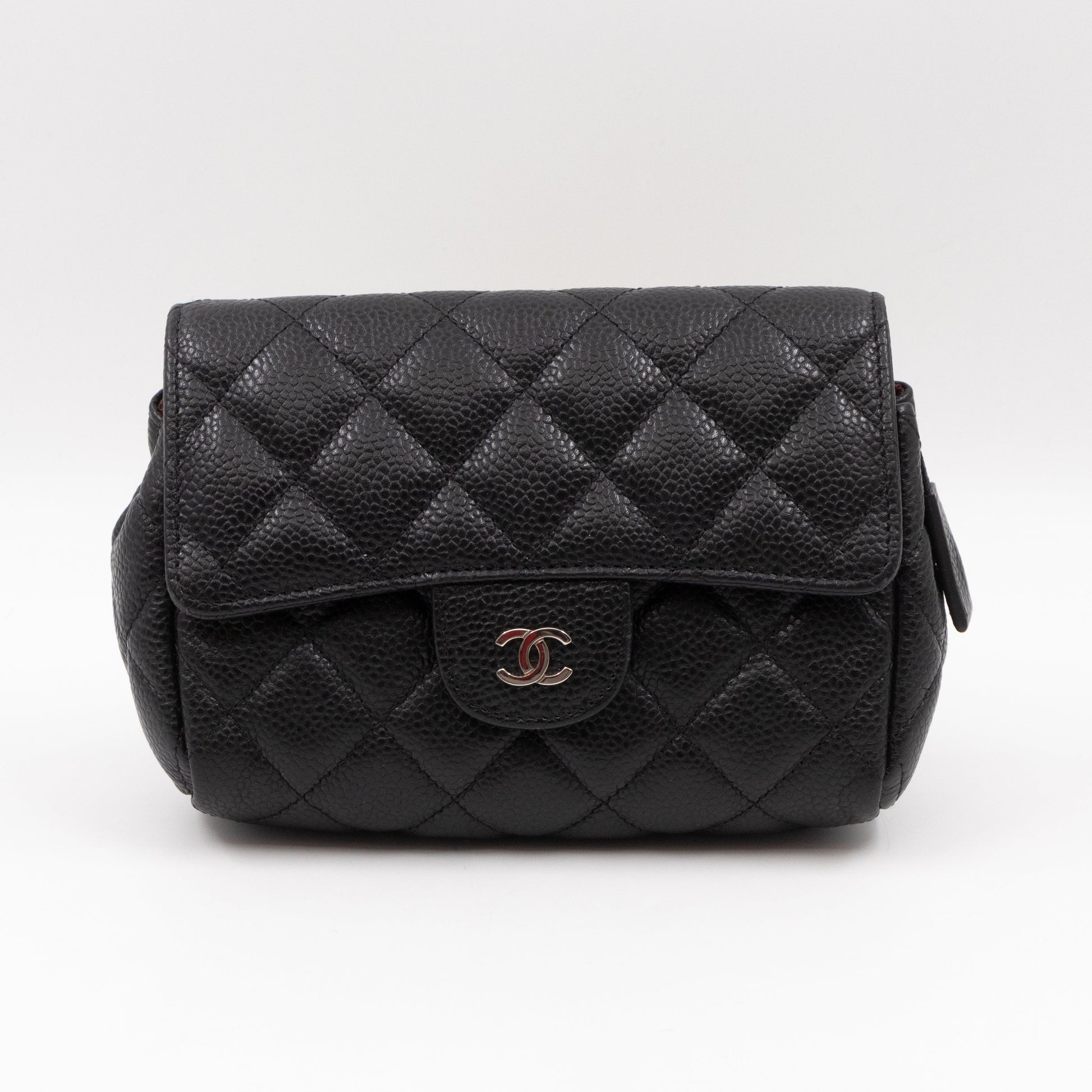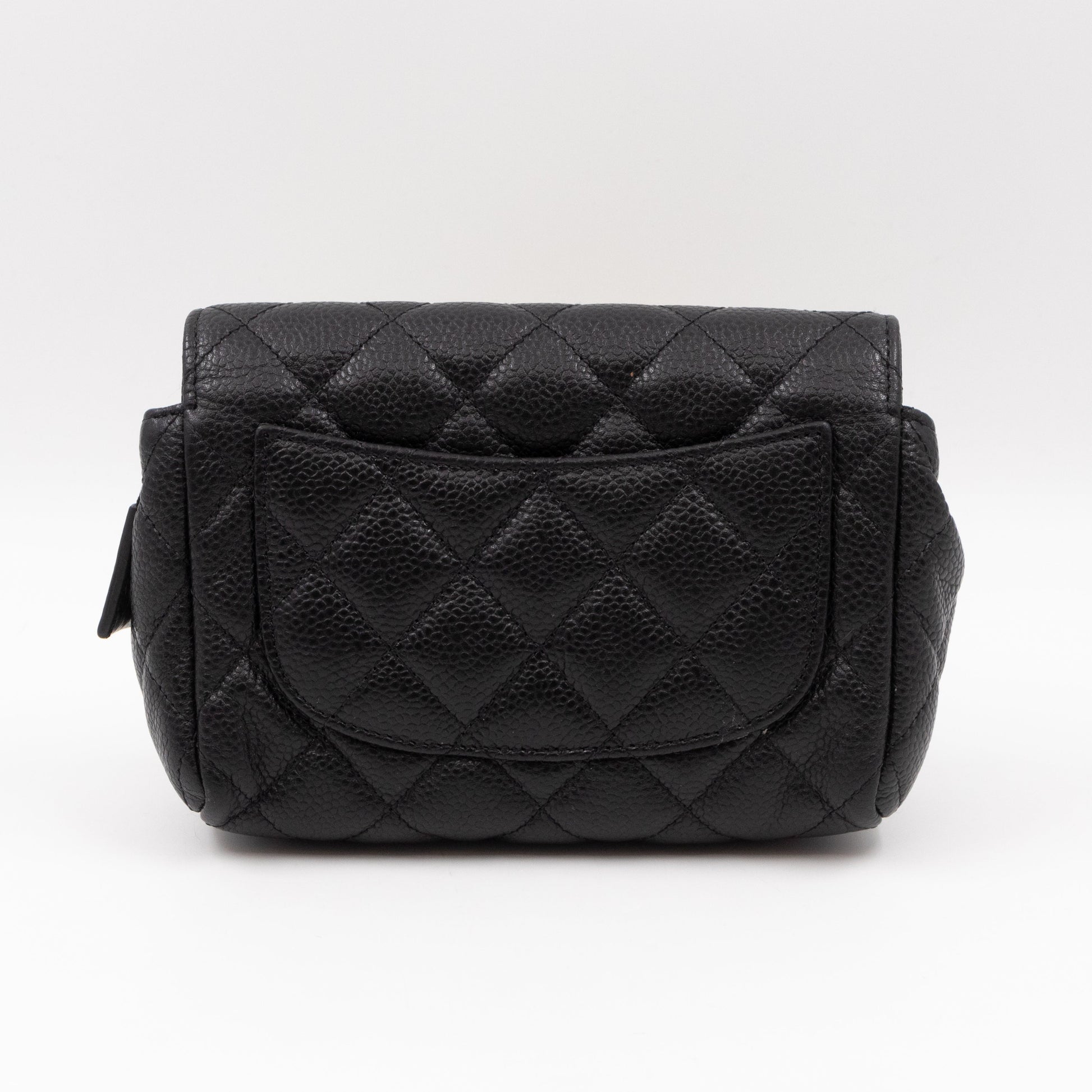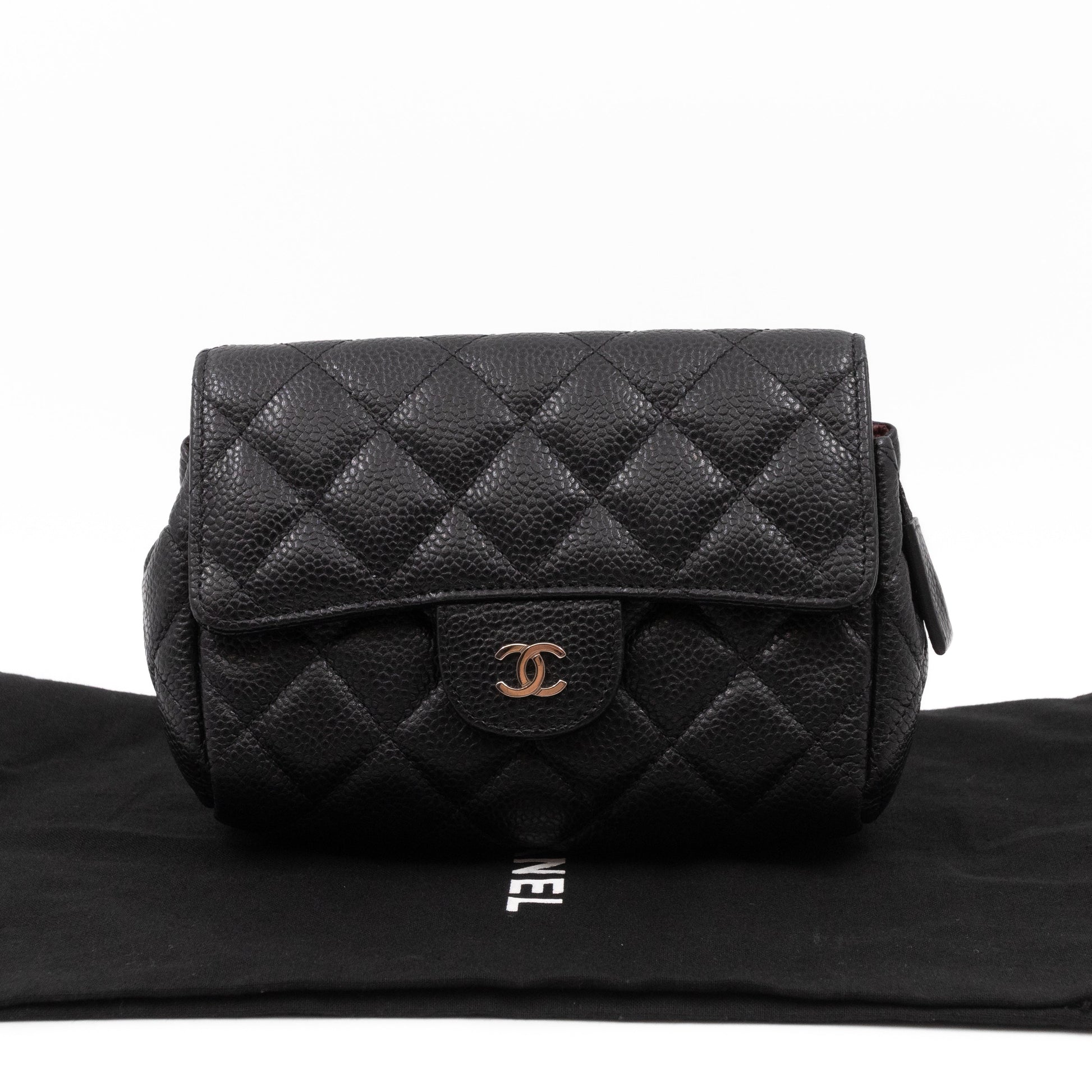 This is a convenient small Chanel quilted flap cosmetic case. Made of black caviarskin leather and silver-tone hardware. The top flap and zipper opens to a burgundy nylon compartment with room for all your cosmetic needs and a mirror on the inner side of the flap. Light-weight and soft, a great companion when traveling, or as a daily clutch.