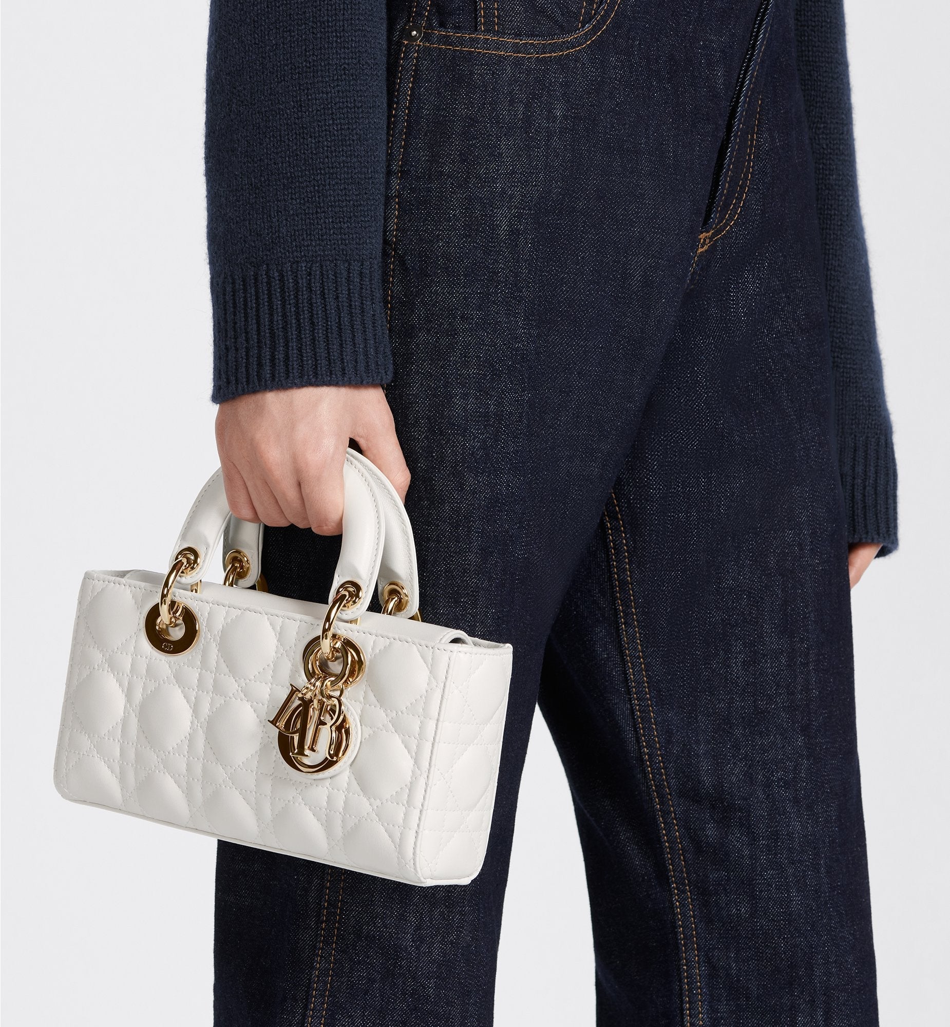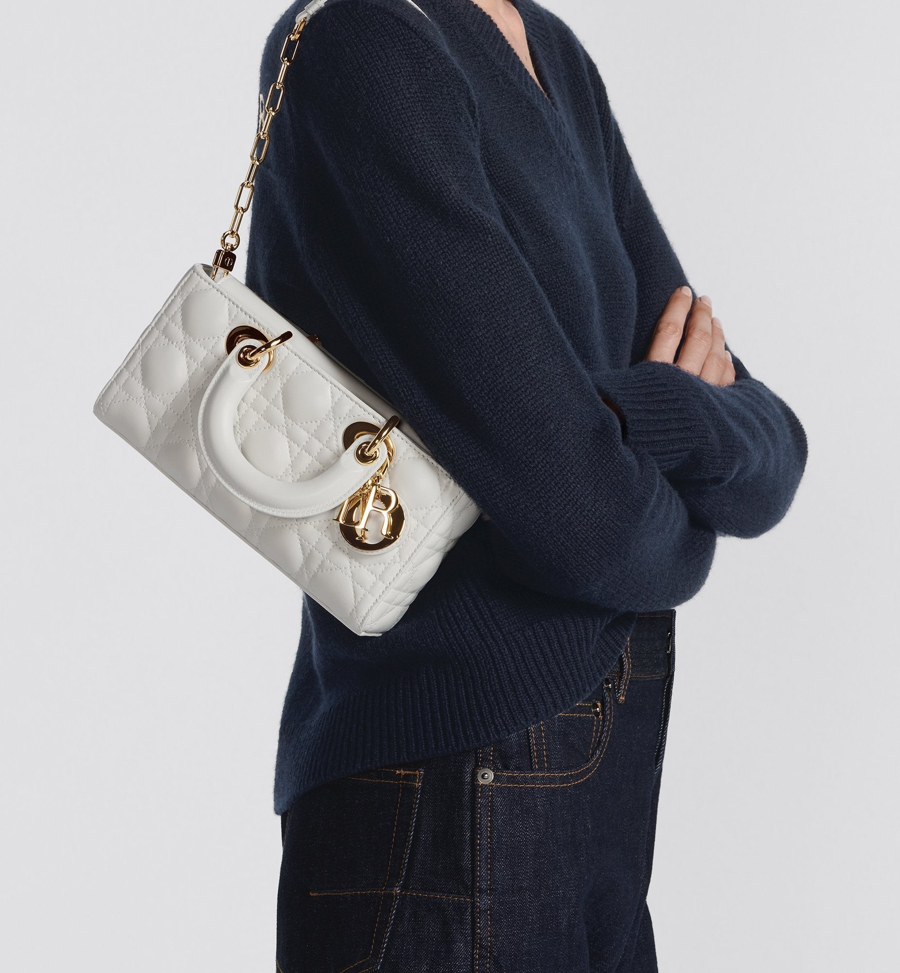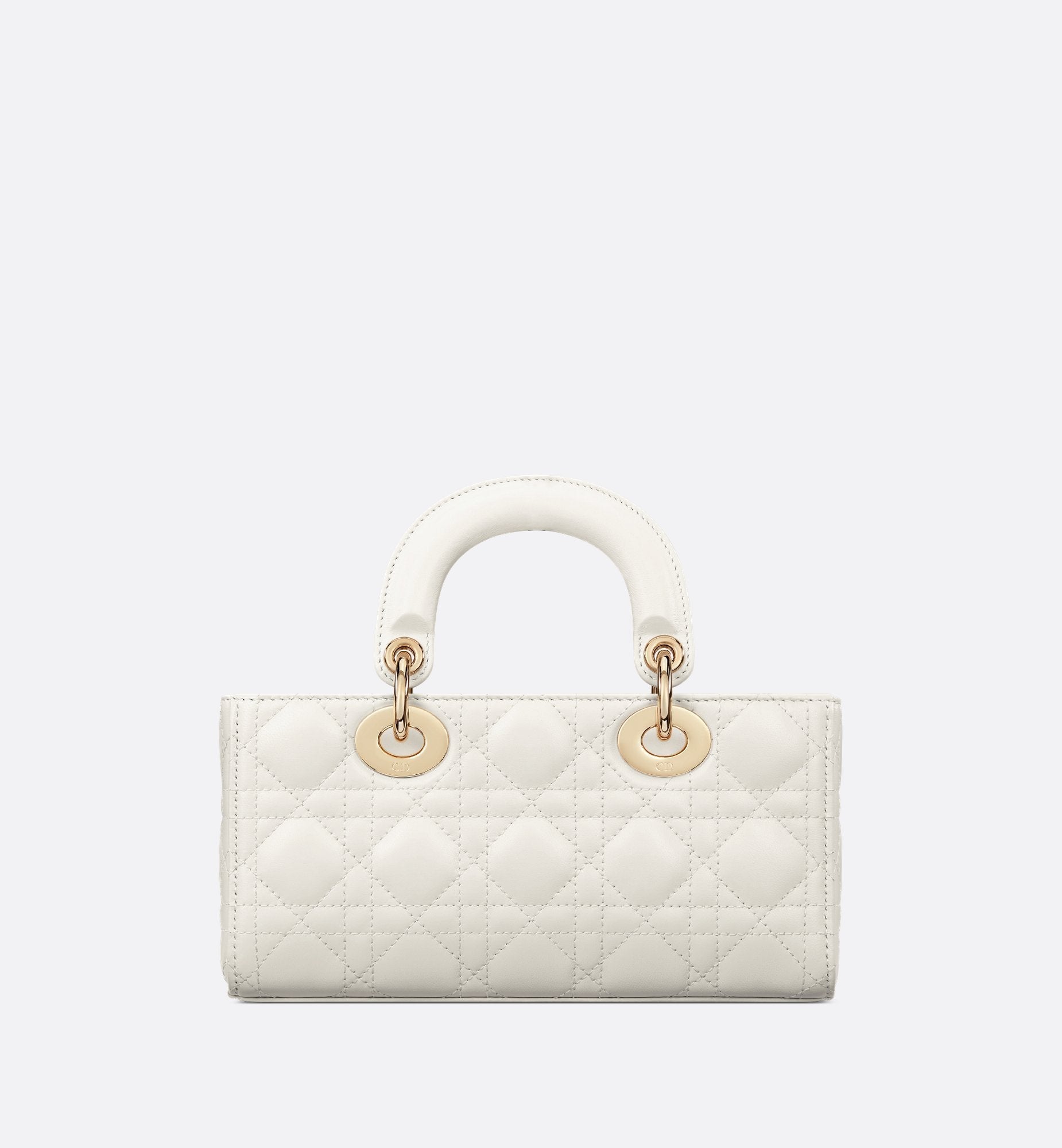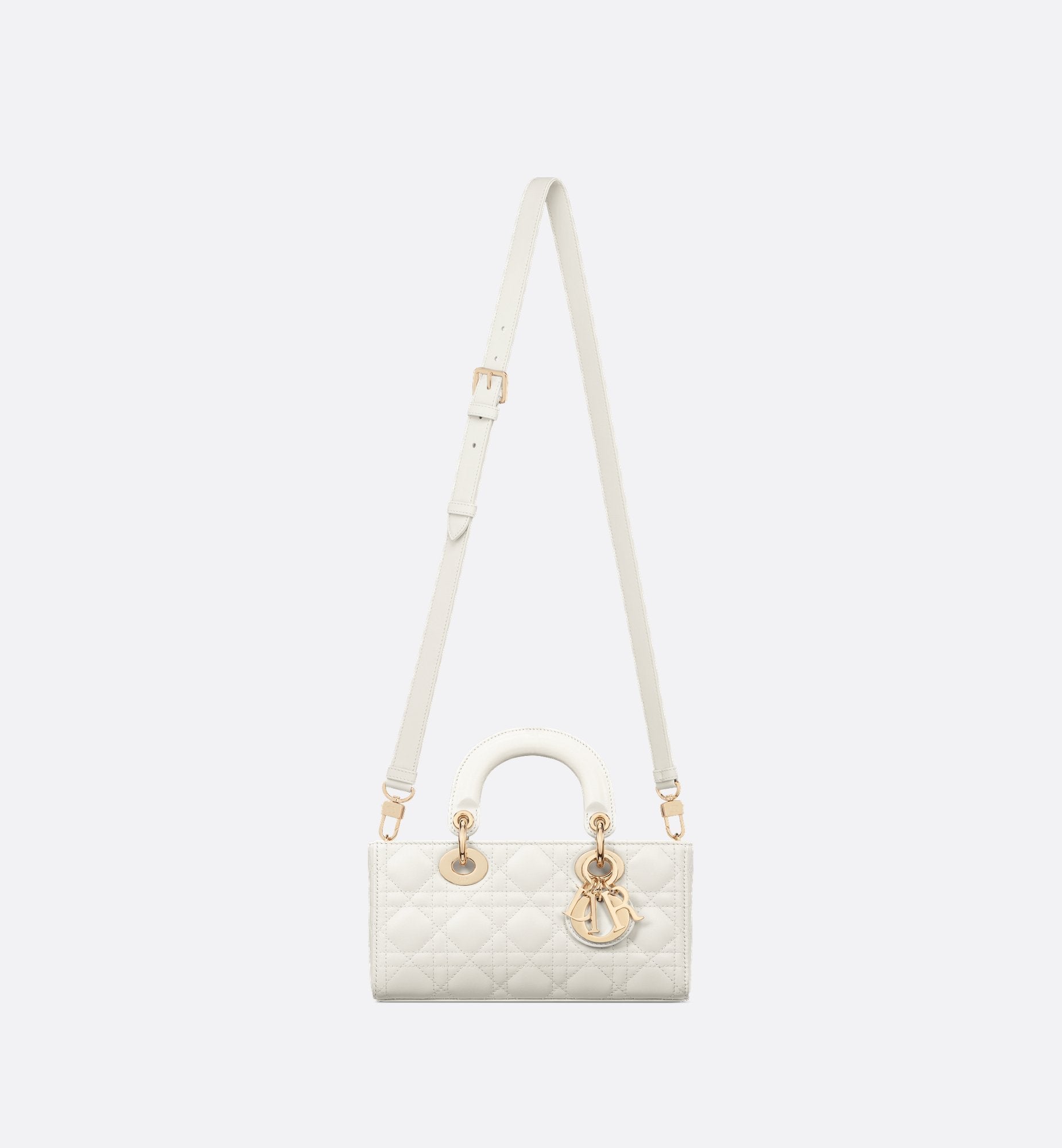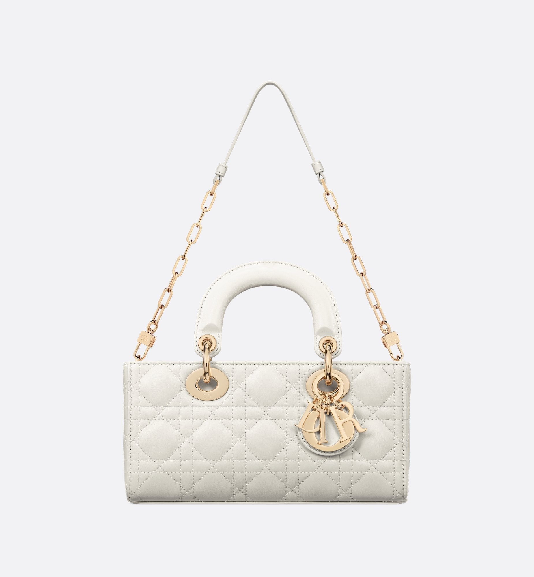 The Lady D-Joy bag captures the House's vision of elegance and beauty by showcasing the iconic streamlined aesthetic of the Lady Dior line. Crafted in latte lambskin with Cannage stitching, the refined and timeless style is enhanced by pale gold-finish metal D.I.O.R. charms elegantly embellishing its silhouette. Featuring one removable chain strap and another adjustable and removable leather strap, the small Lady D-Joy bag can be carried by hand, worn over the shoulder or crossbody as a daily companion.