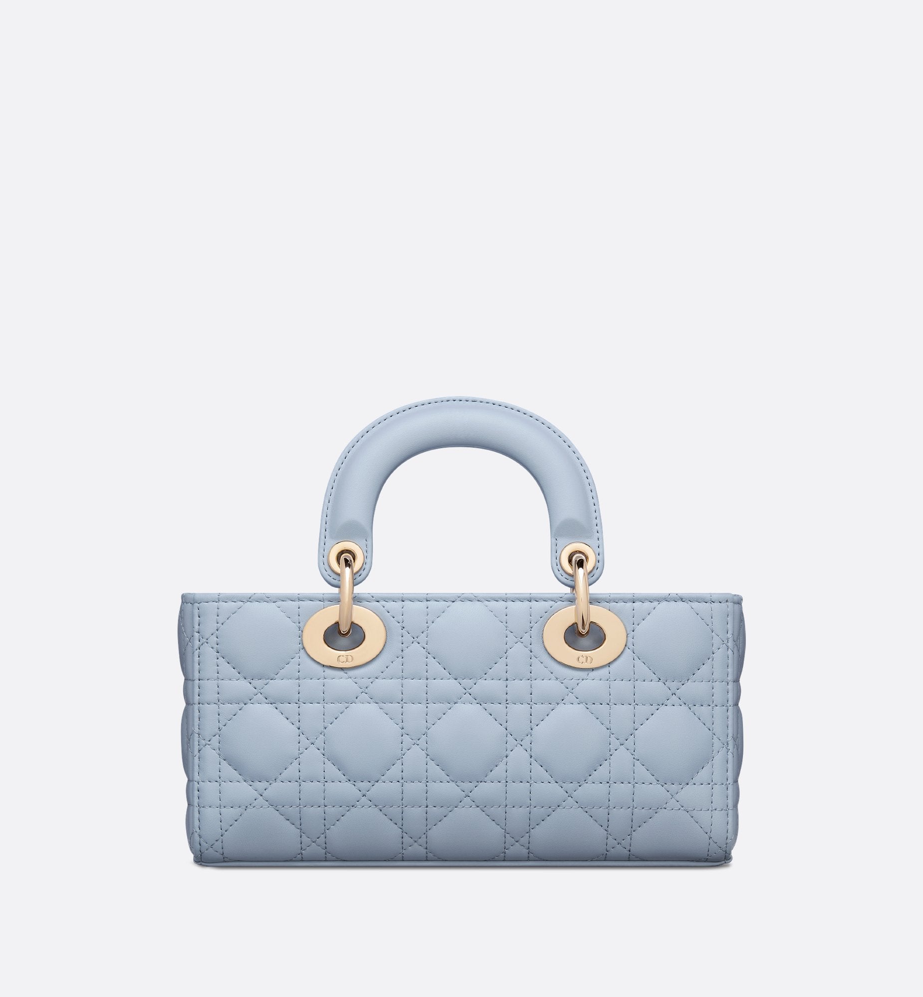 The Lady D-Joy bag captures the House's vision of elegance and beauty by showcasing the iconic streamlined aesthetic of the Lady Dior line. Crafted in pale blue lambskin with Cannage stitching, the refined and timeless style is enhanced by pale gold-finish metal D.I.O.R. charms illuminating its silhouette. Featuring one removable chain strap and another adjustable and removable leather strap, the small Lady D-Joy bag can be carried by hand, worn over the shoulder or crossbody as a daily companion.