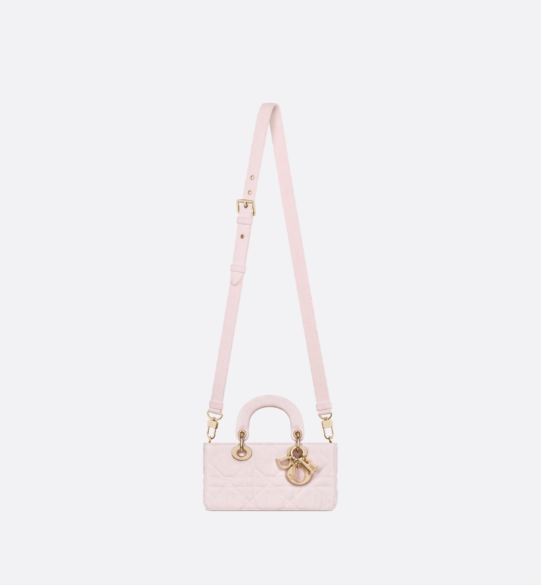 The Lady D-Joy bag captures the House's vision of elegance and beauty by showcasing the streamlined aesthetic of the iconic Lady Dior line. Crafted in pink denim with Macrocannage stitching, the refined and timeless style's quilted texture is immediately recognizable. The D.I.O.R. charms embellished in transparent tonal resin adorn its silhouette. Featuring one removable chain strap and another adjustable and removable leather strap, the small Lady D-Joy bag can be carried by hand, worn over the shoulder or crossbody as a daily companion.