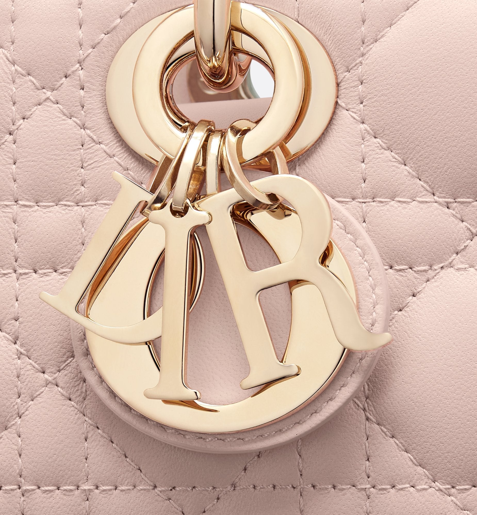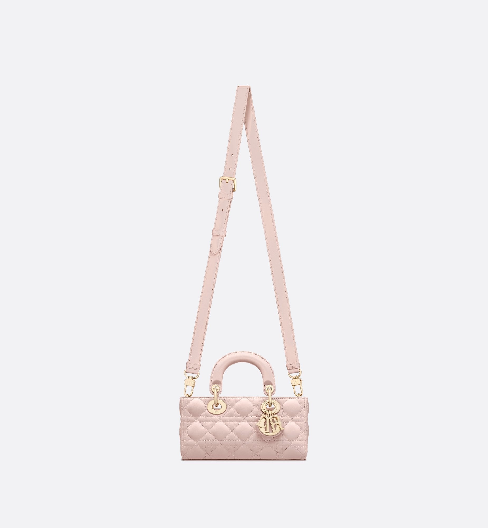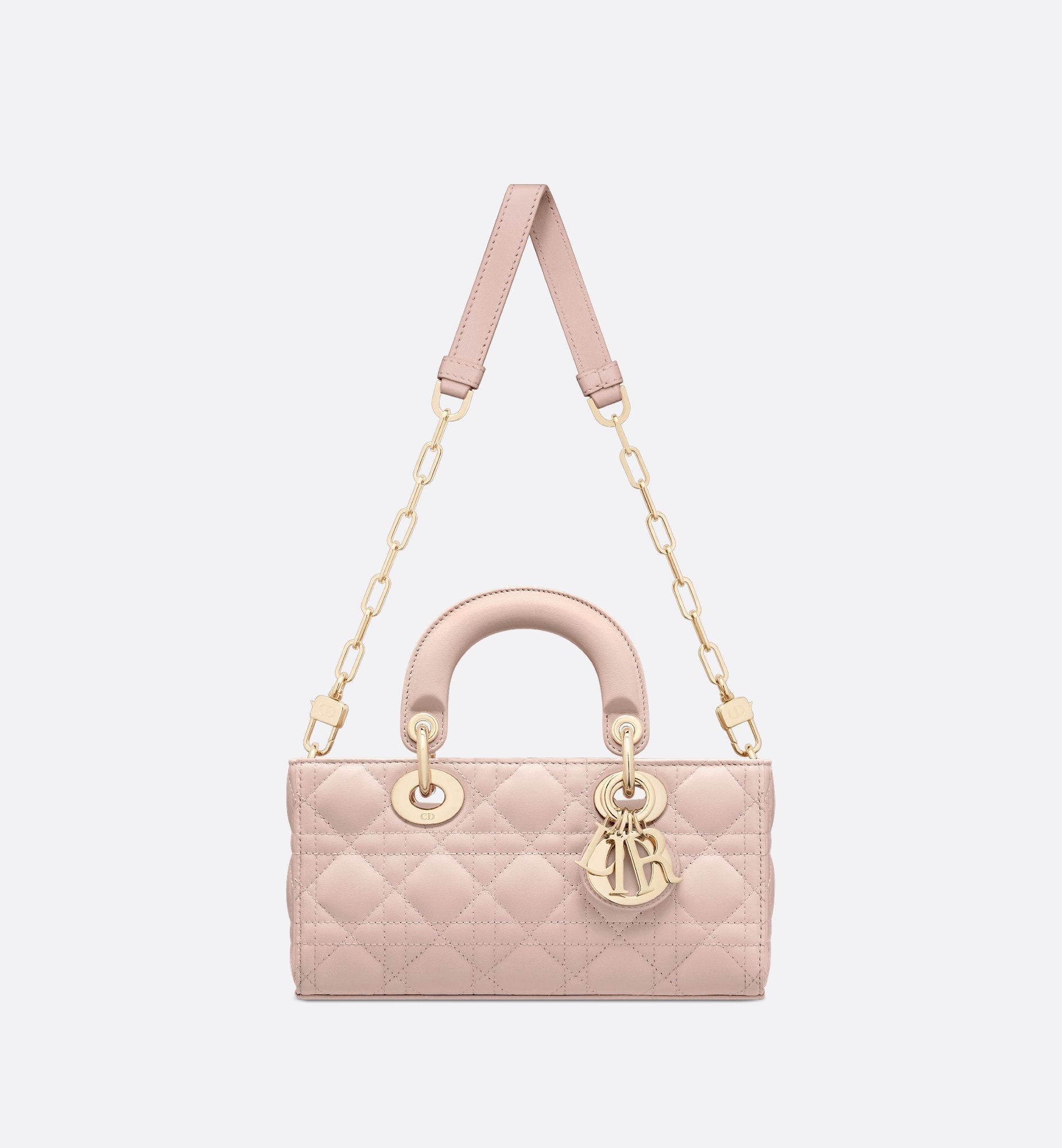The Lady D-Joy bag captures the House's vision of elegance and beauty by showcasing the iconic streamlined aesthetic of the Lady Dior line. Crafted in powder pink lambskin with Cannage stitching, the refined and timeless style is enhanced by pale gold-finish metal D.I.O.R. charms elegantly embellishing its silhouette. Featuring one removable chain shoulder strap and another adjustable and removable leather shoulder strap, the small Lady D-Joy bag can be carried by hand, worn over the shoulder or crossbody as a daily companion.