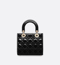 The Lady Dior bag epitomizes Dior's vision of elegance and beauty. Sleek and refined, the timeless style is crafted in black patent calfskin with Cannage stitching, creating the instantly recognizable quilted texture. Pale gold-finish metal D.I.O.R. charms further embellish its silhouette. The small Lady Dior bag features a thin, removable leather shoulder strap and can be carried by hand or worn crossbody.