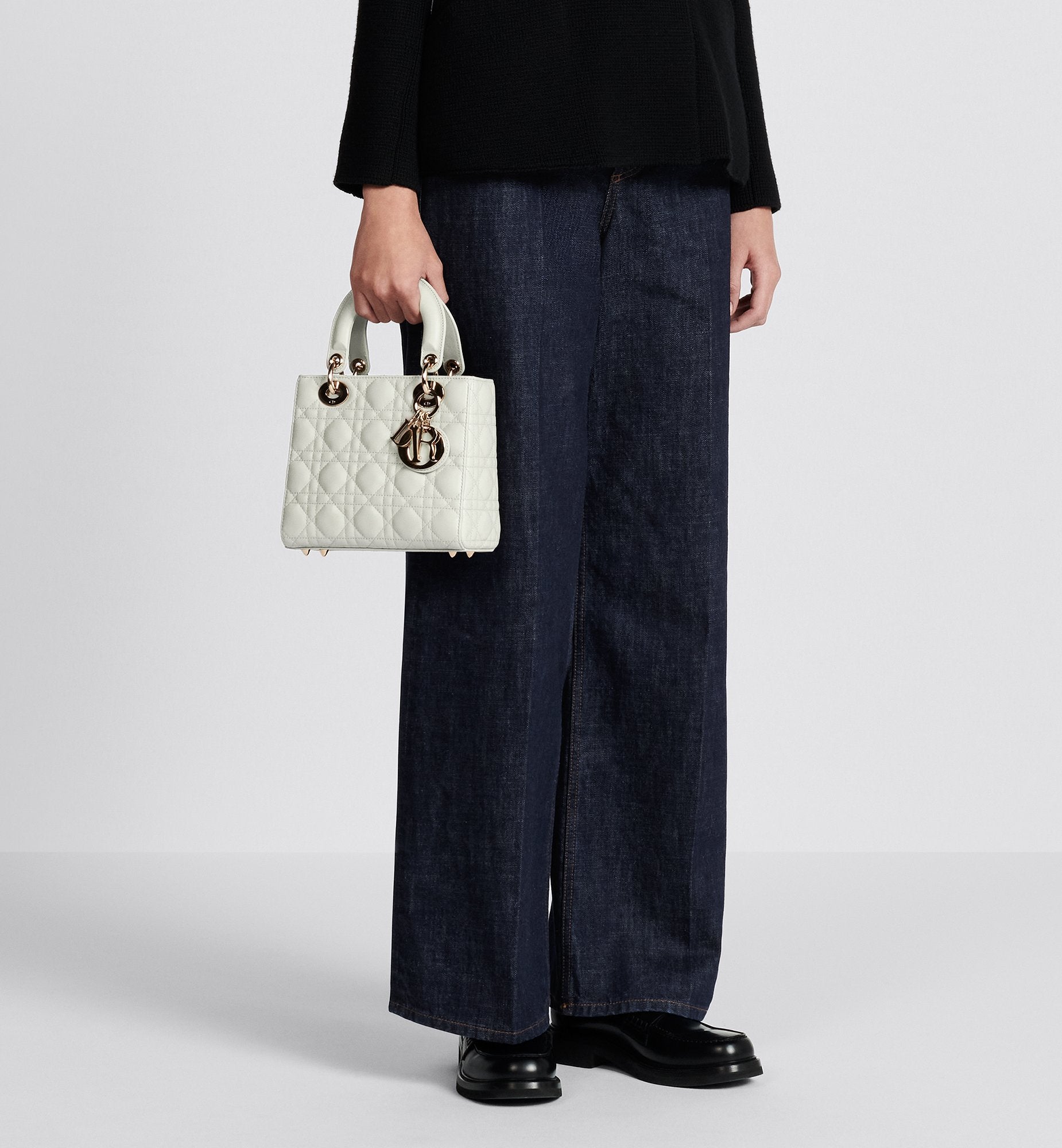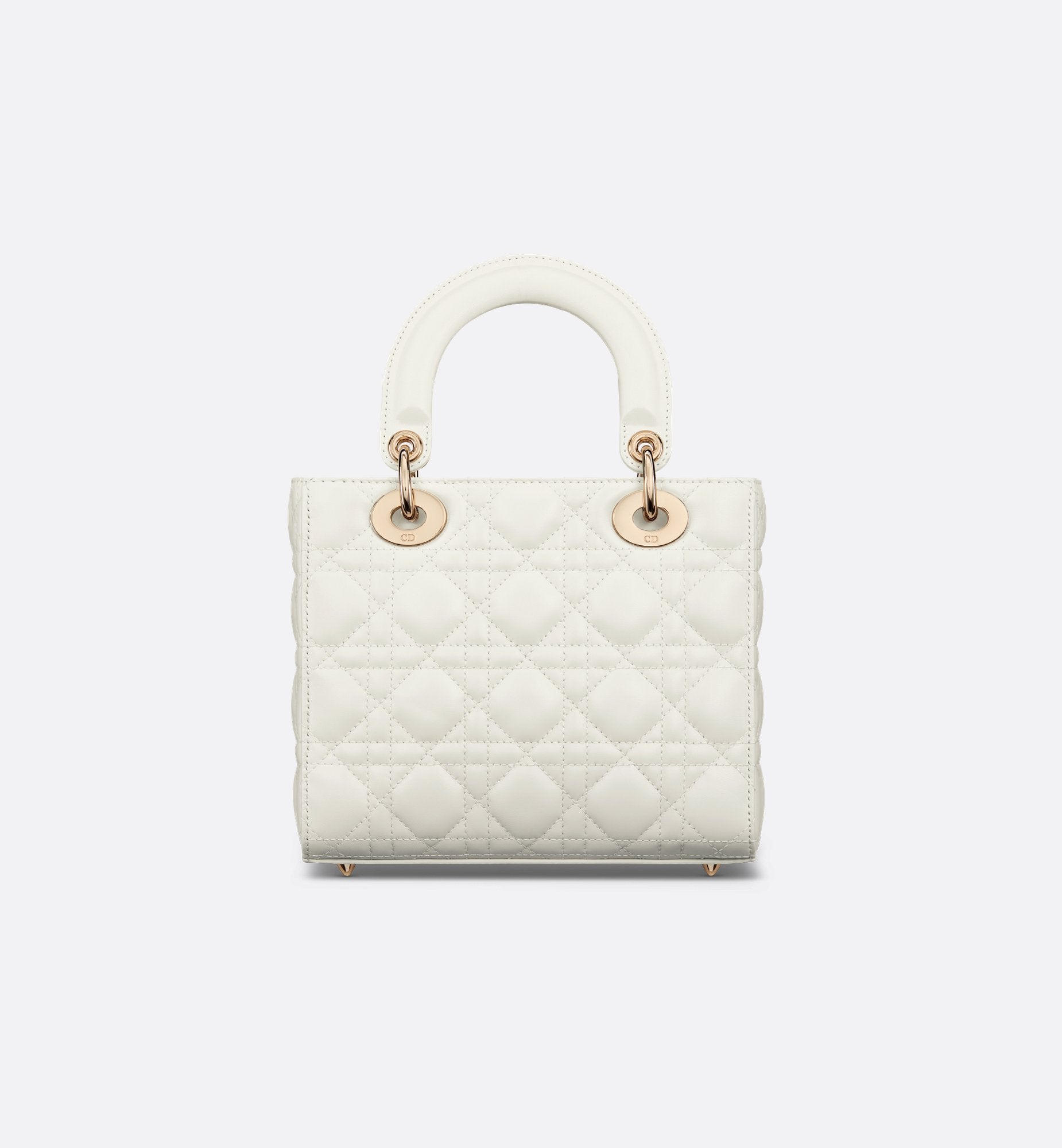 The Lady Dior My ABCDior bag epitomizes Dior's vision of elegance and beauty. Sleek and refined, the timeless style is crafted in latte lambskin with Cannage stitching, creating the instantly recognizable quilted texture. Pale gold-finish metal D.I.O.R. charms further embellish its silhouette with an elegant touch. Featuring a shoulder strap that can be personalized with badges, the small, unique design may be carried by hand or worn crossbody.
