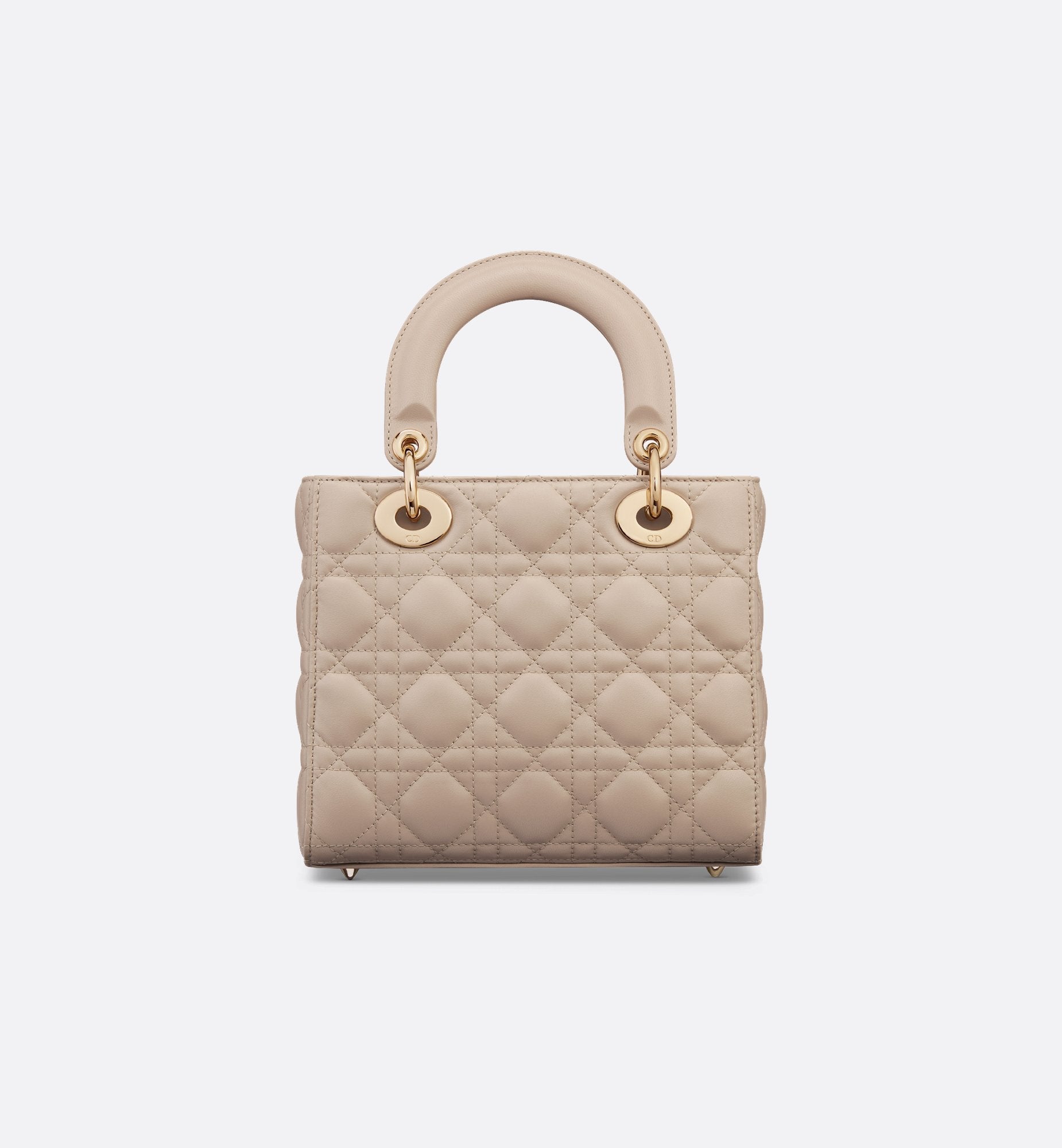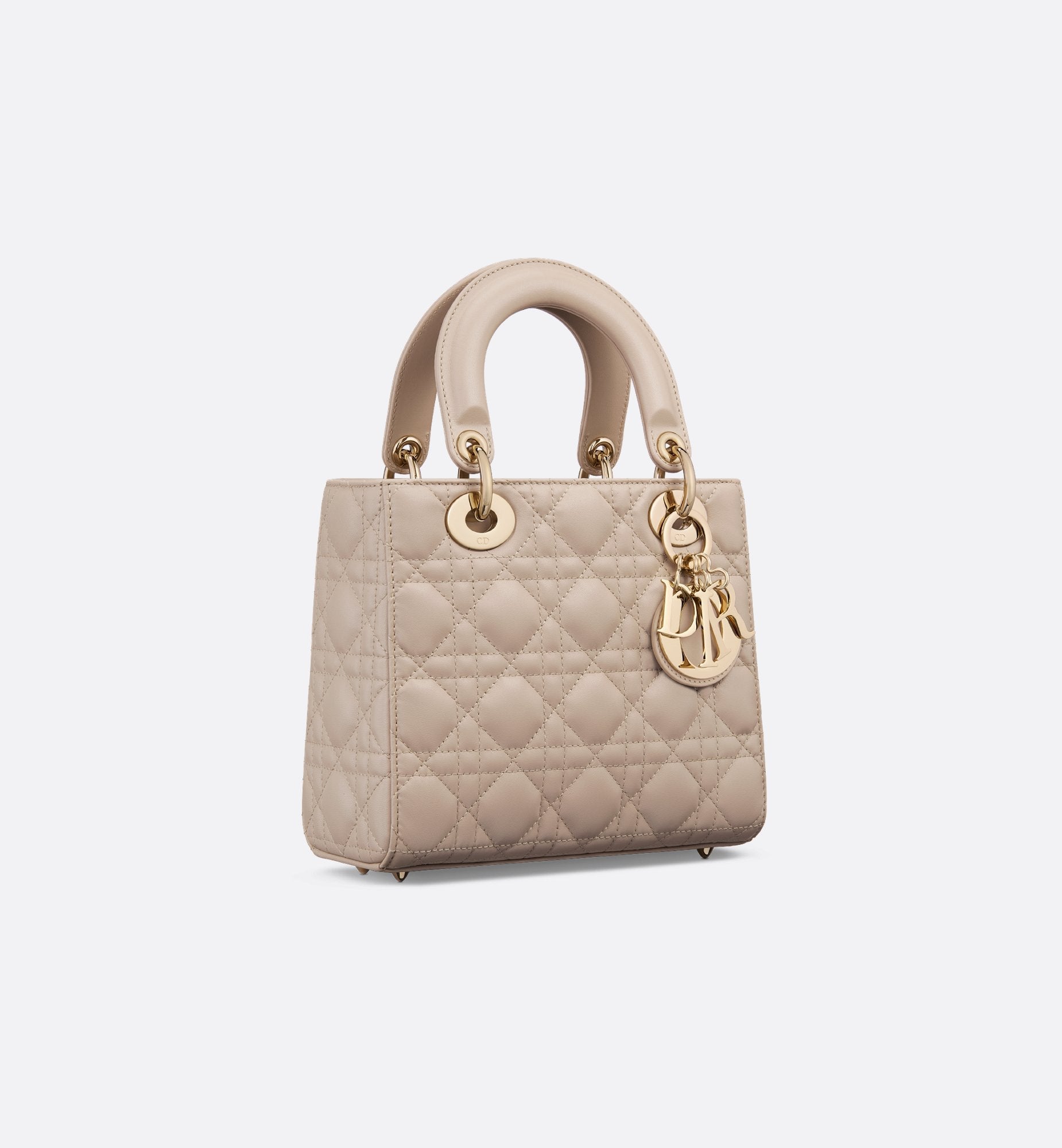 The Lady Dior My ABCDior bag epitomizes Dior's vision of elegance and beauty. Sleek and refined, the timeless style is crafted in powder beige lambskin with Cannage stitching, creating the unmistakable quilted texture. Pale gold-finish metal D.I.O.R. charms lend elegant appeal. Featuring a strap that can be personalized with symbolic badges, the small, unique design may be carried by hand or worn crossbody.
