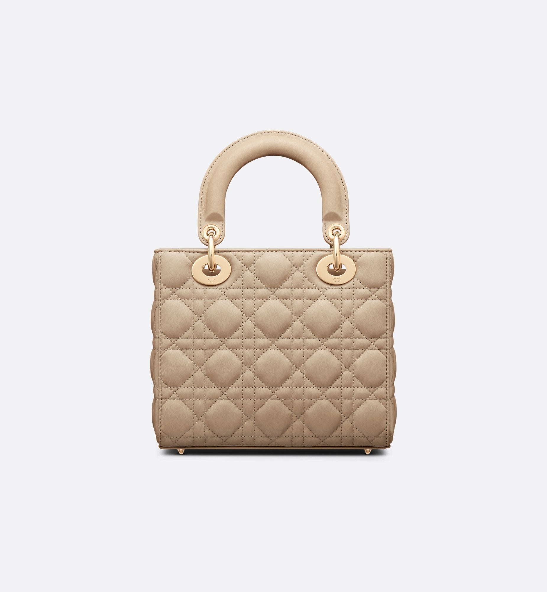 The Lady Dior My ABCDior bag epitomizes Dior's vision of elegance and beauty. Sleek and refined, the timeless and modern style is crafted in sand-colored lambskin with Cannage stitching, creating the instantly recognizable quilted texture. Pale gold-finish metal D.I.O.R. charms further embellish its silhouette with an elegant touch. Featuring a shoulder strap that can be personalized with badges, the small, unique design may be carried by hand or worn crossbody.