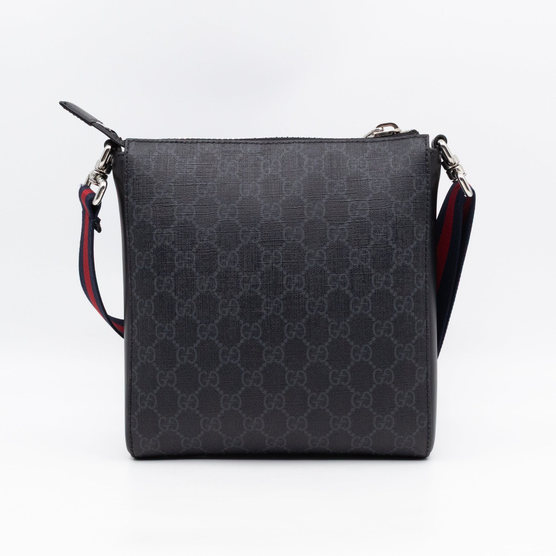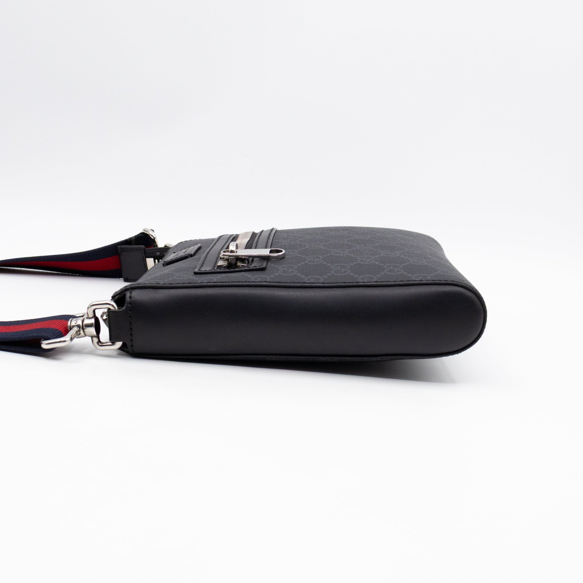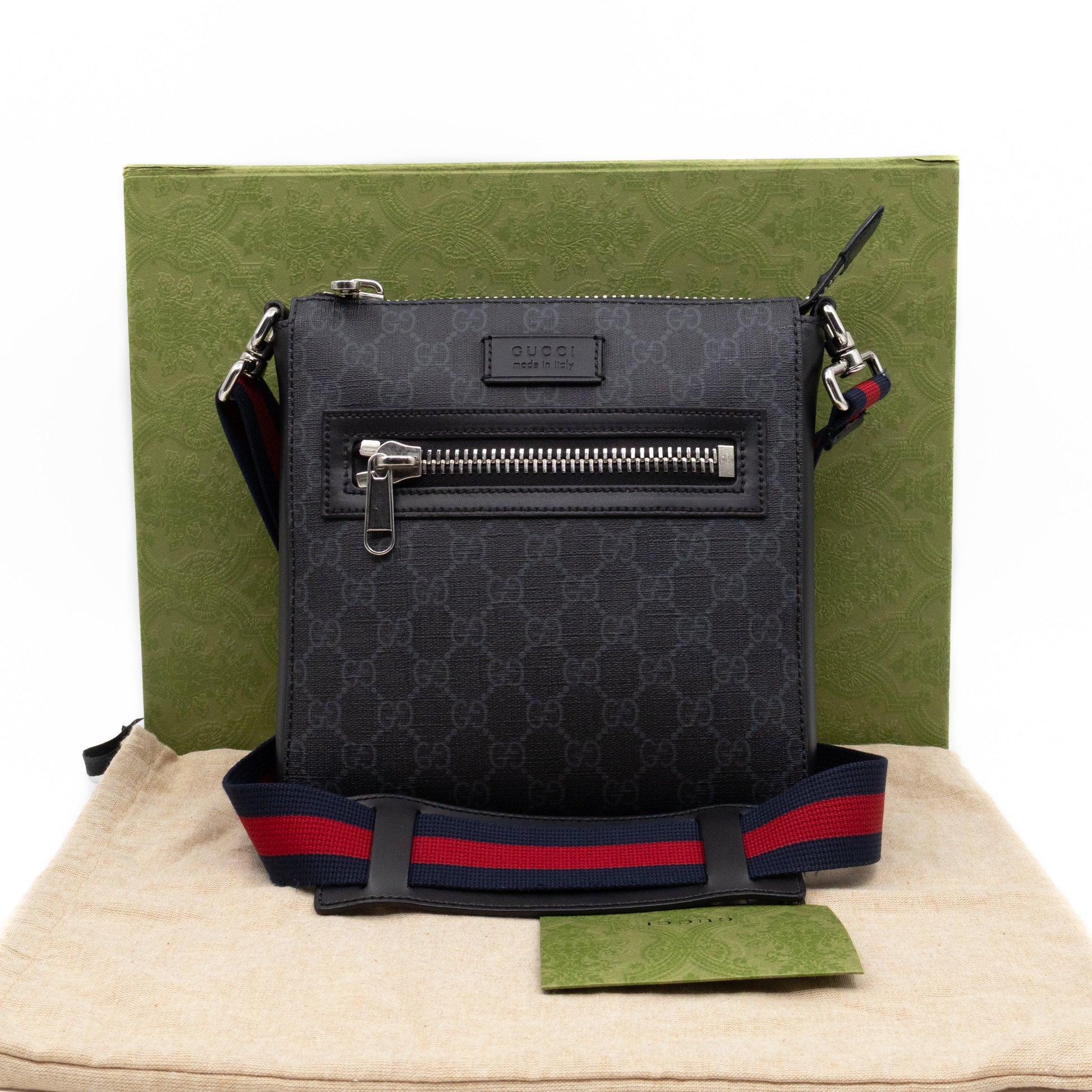 A small sized messenger bag by Gucci. Made with GG Supreme black canvas, with black leather accents and silver tone hardware. Lightweight slim design with a zipper on top, adjustable crossbody leather strap with the iconic blue & red stripe. Front has a zipper pocket for convenience. Great for everyday use as it easily your daily essentials. Bought at 2022 in Amsterdam. Retail price €1250.