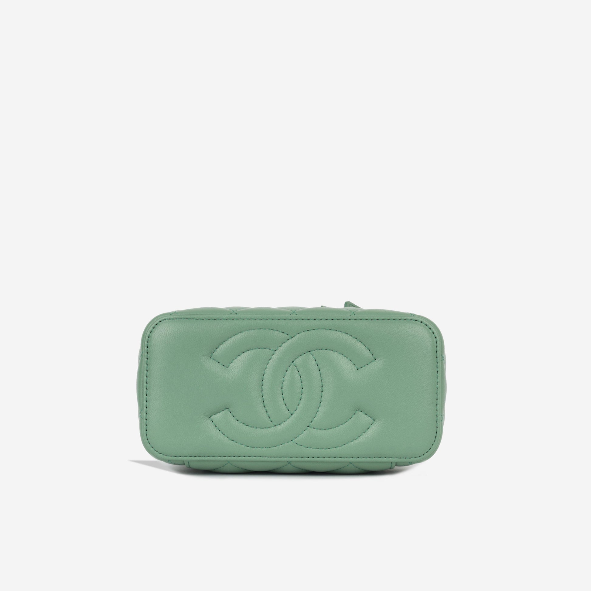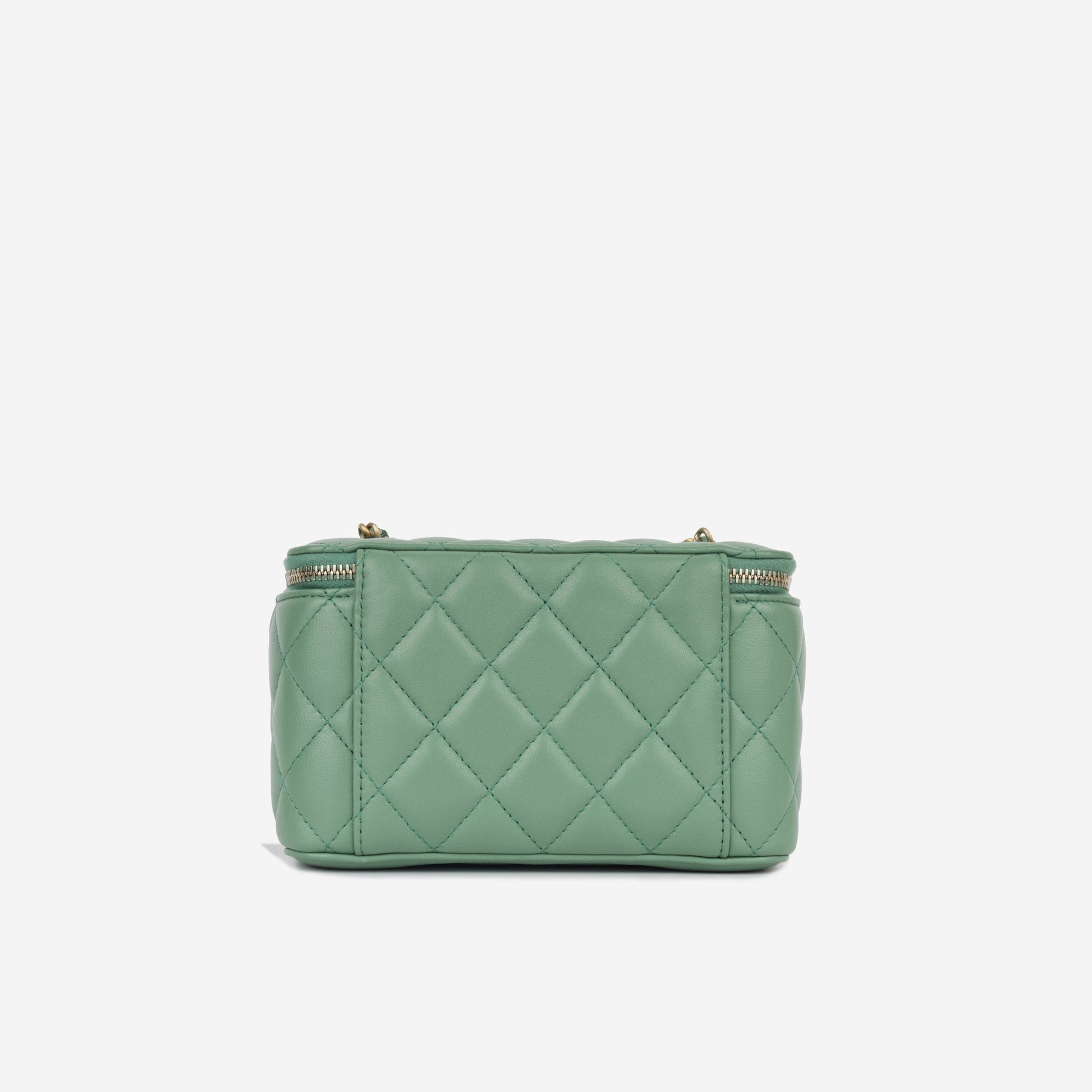 Primarily developed for storing your tiny beauty essentials and other small necessities, the vanity case has come a rather long way since its birth. . This beautiful vanity on chain is crafted in sage green lambskin leather and complimented with antique gold-tone hardware, and a pearl ball on the chain that is adjustable.