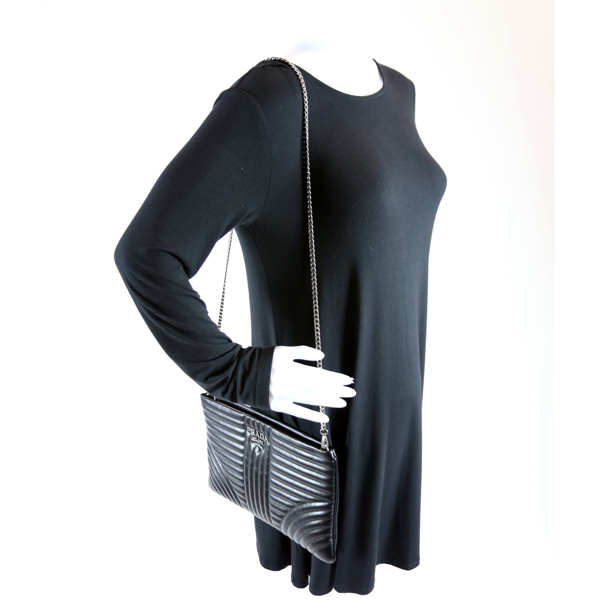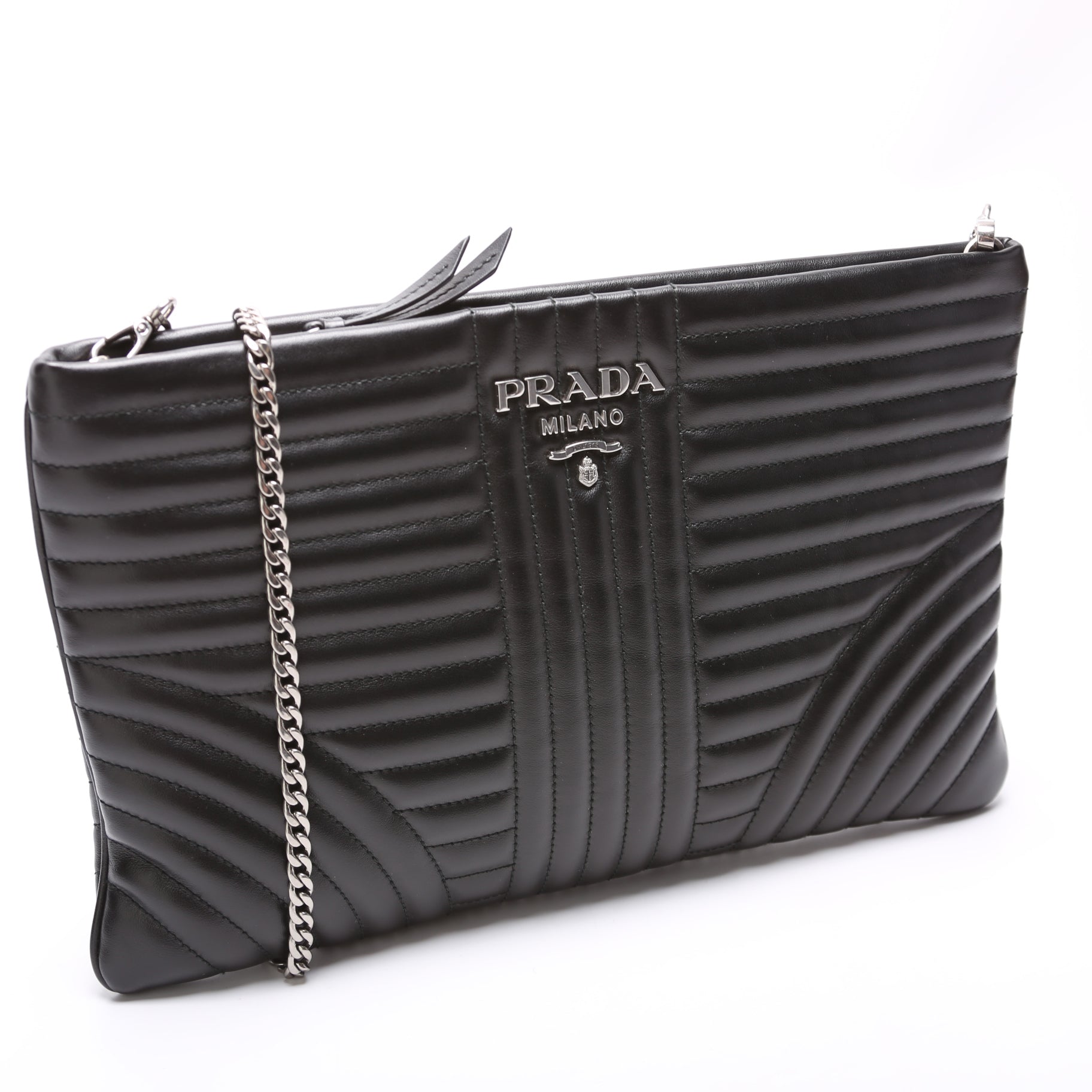 This Prada Diagramme Clutch with Chainis eye catching bag. .