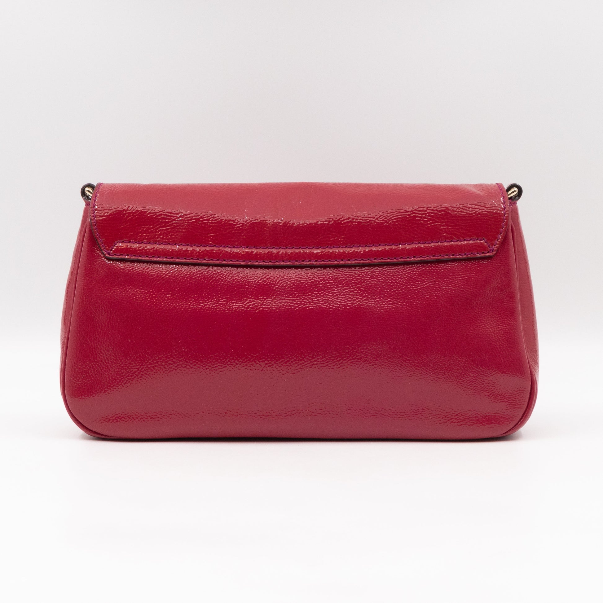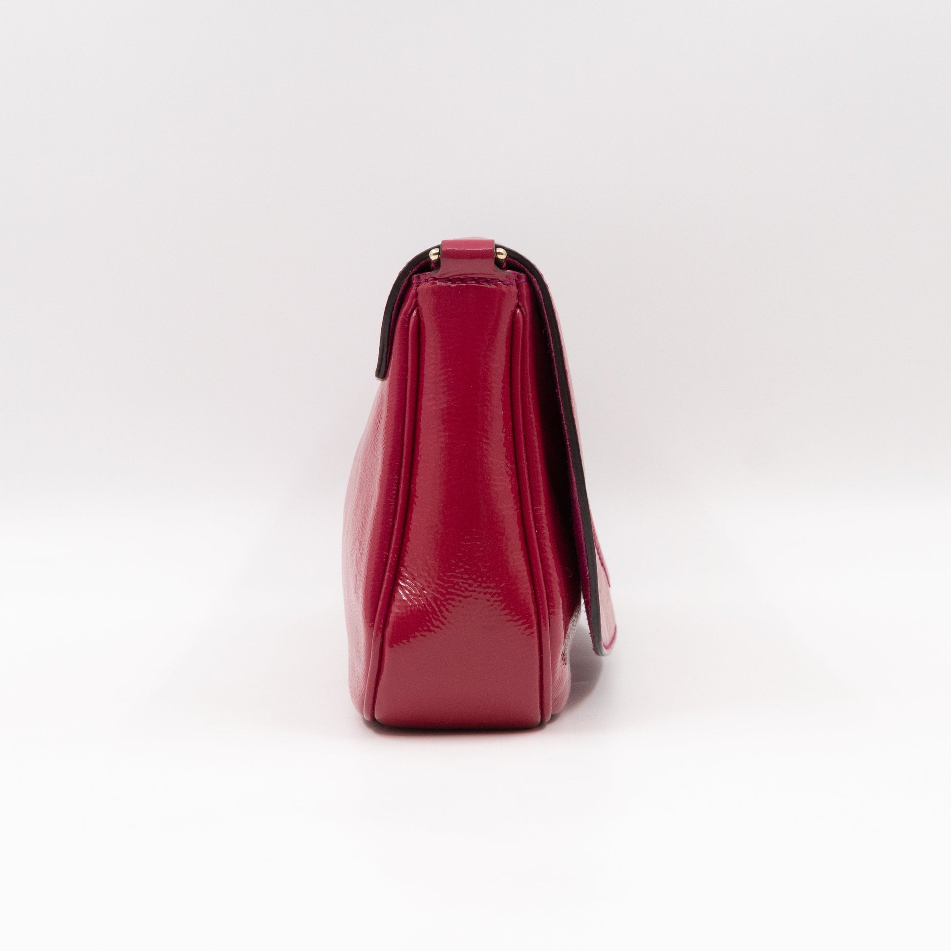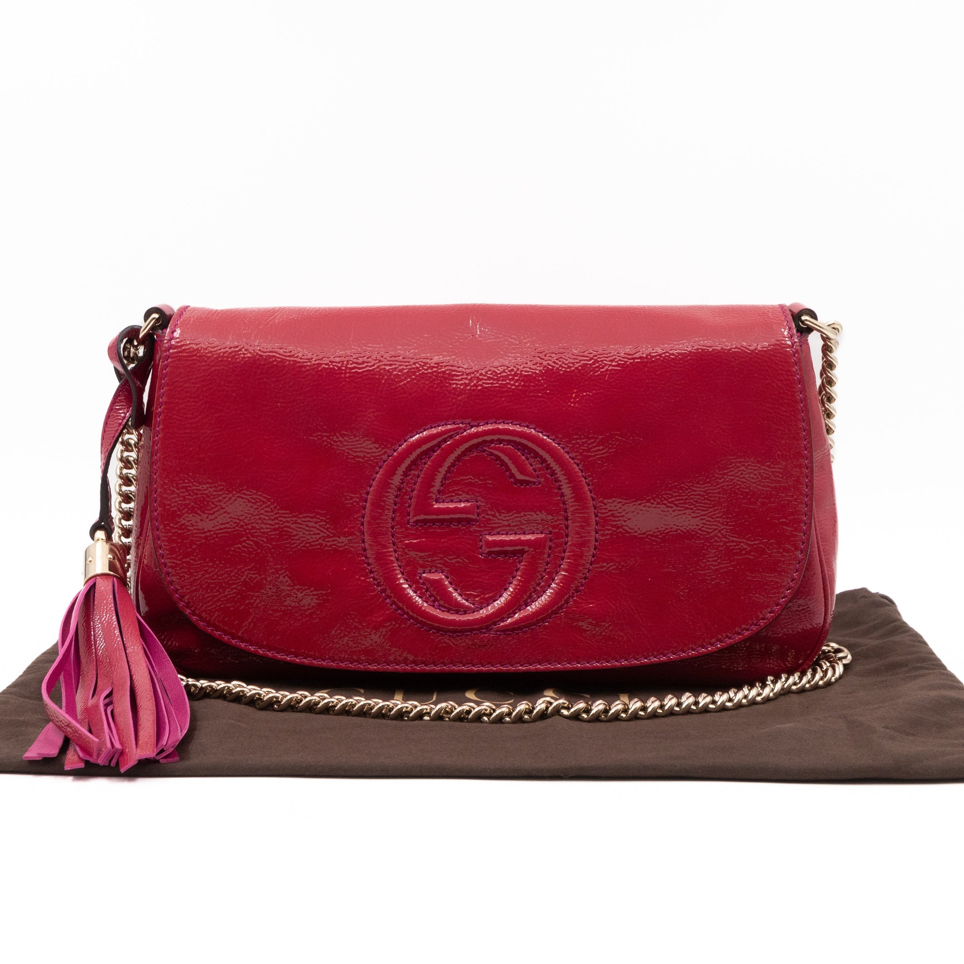 This is the Gucci Soho Flap Chain Tassel bag in beautiful fuchsia patent leather. Features a light flap that opens to a useful interior with a zipper pocket and a slim slide pocket. Carry your every day essentials in style. Long chain makes this easy to use as a daily crossbody bag.