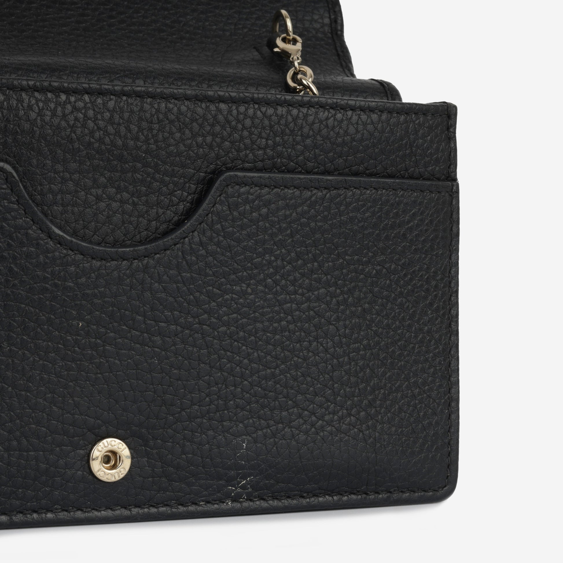 Introducing the Gucci Soho Wallet on Chain (WOC), crafted from black Taurillon leather and the iconic GG logo, featuring a removable chain for crossbody wear. Wear it on your shoulder, carry it by hand as a small clutch, or use it as a wallet. Immerse yourself in the fusion of heritage and modernity with this stylish and versatile accessory that pays homage to the timeless allure of Gucci's iconic pieces.