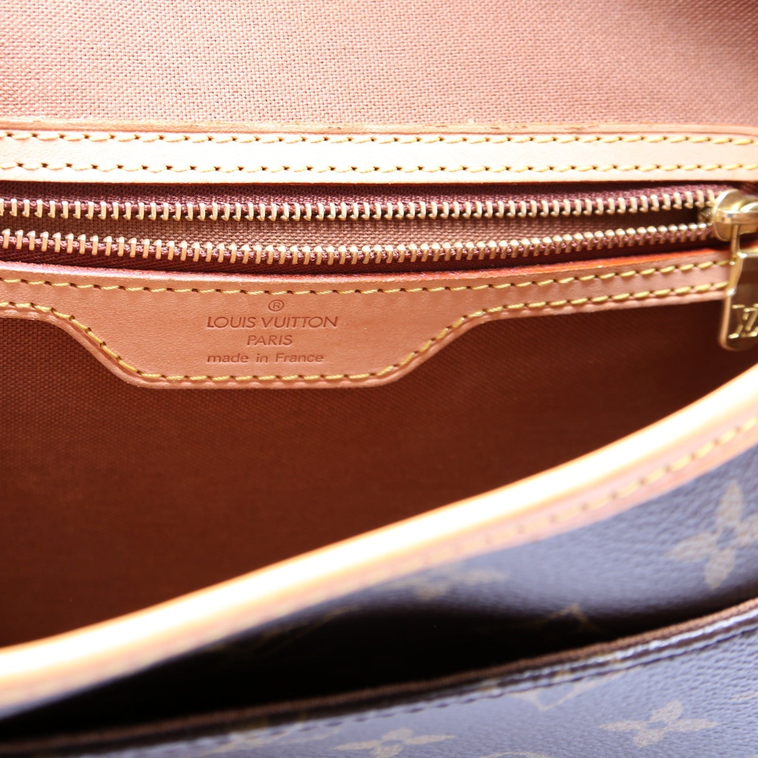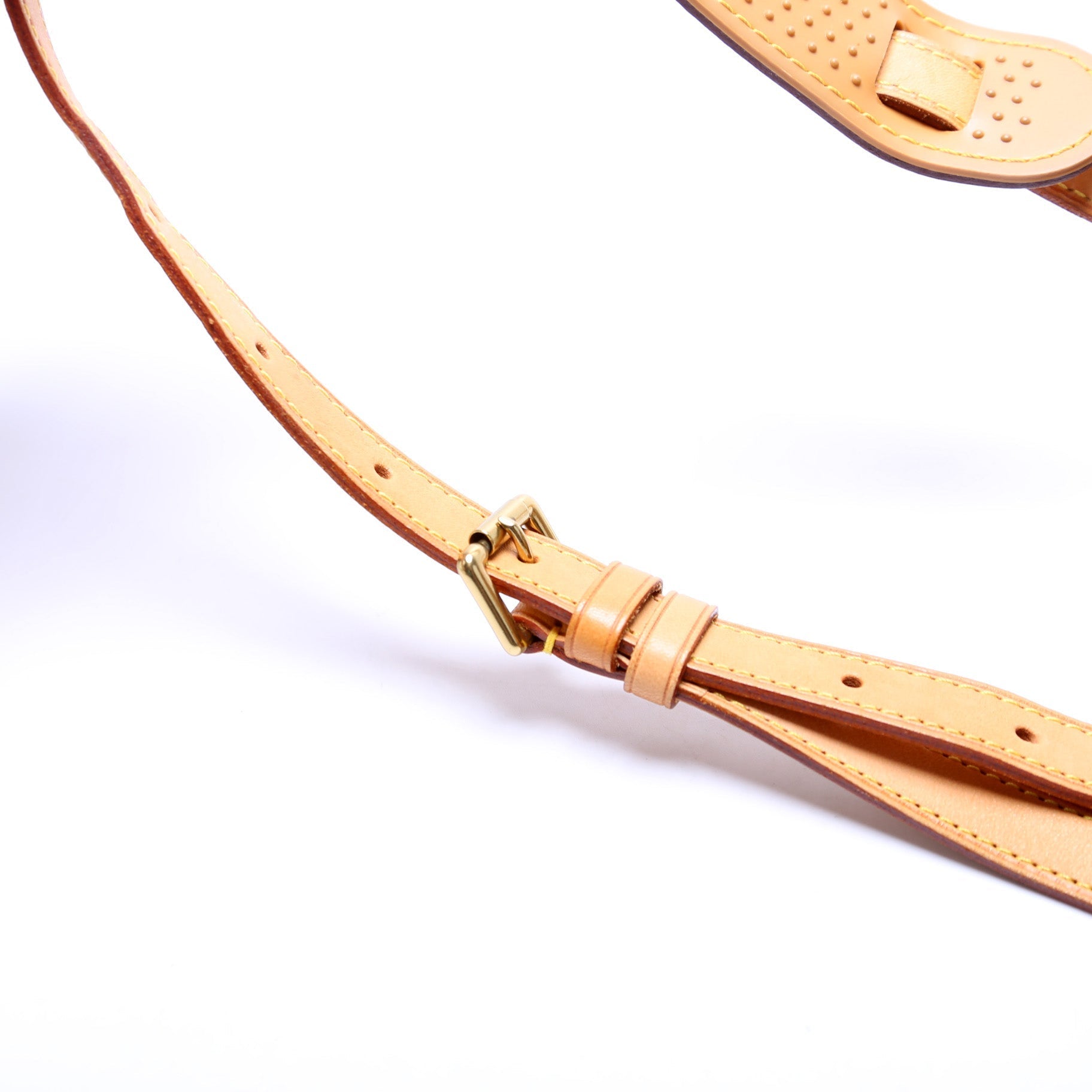 Exterior: The exterior Monogram coated canvas is free of any rips or cracks. The Vechetta leather shows minor discoloration throughout. The exterior features one open pocket.